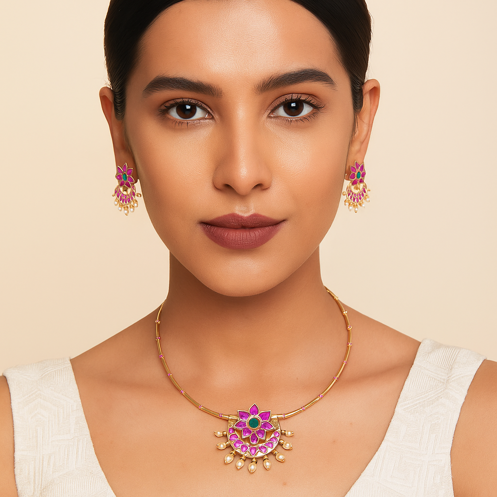 A designer necklace for women is not just jewelry. It is wearable art. Our designer necklaces feature intricate motifs, rare stone combinations, and storytelling designs that you will not find anywhere else.