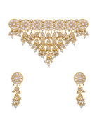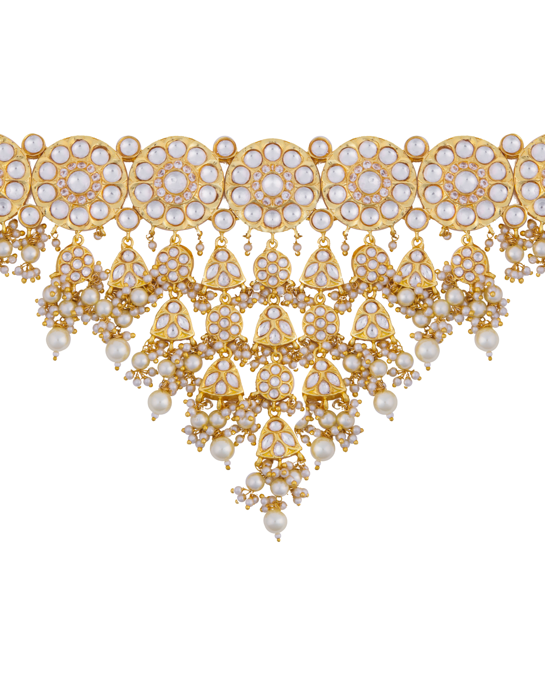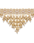 The choker is crafted with intricate detailing, each Kundan stone meticulously set to reflect light brilliantly, adding a touch of opulence to your look. The waterfall design not only adds dynamic movement but also enhances the regal appeal of the piece, making it perfect for grand occasions such as weddings, festive celebrations, or any event where you want to make a statement.