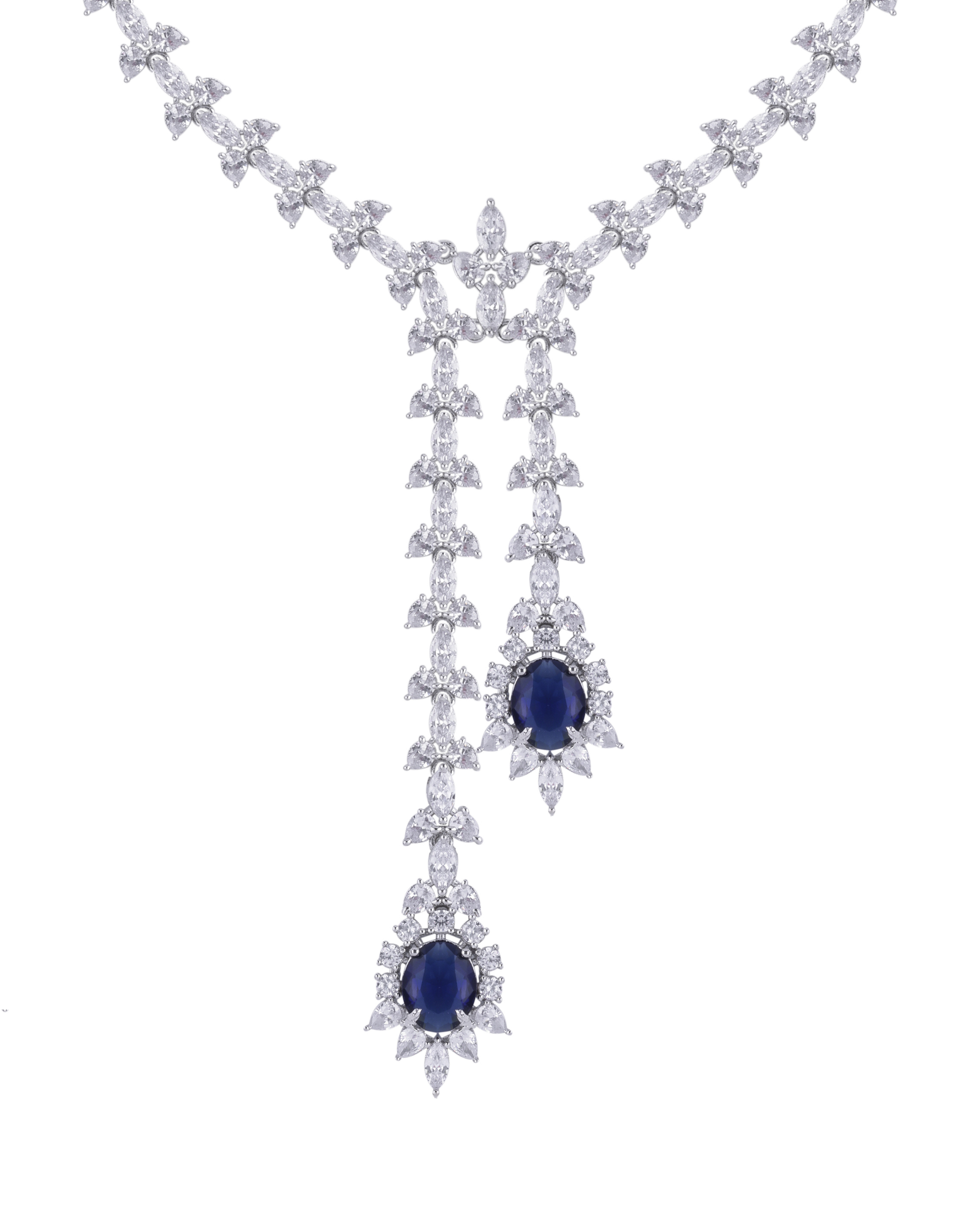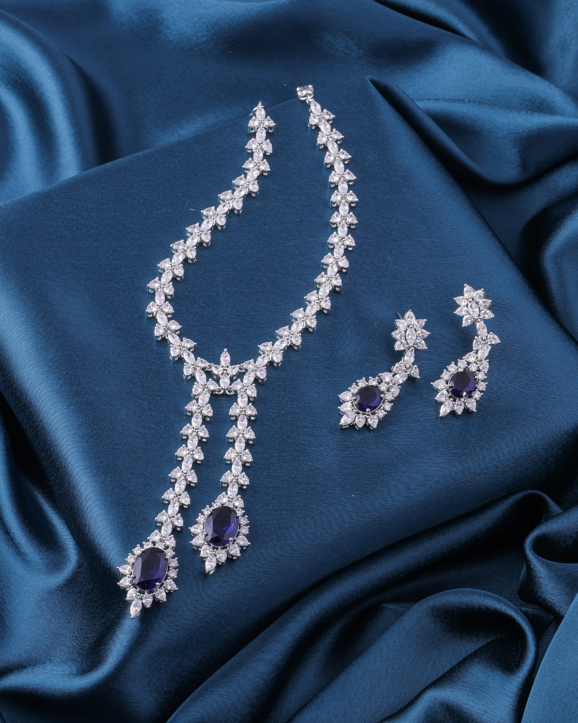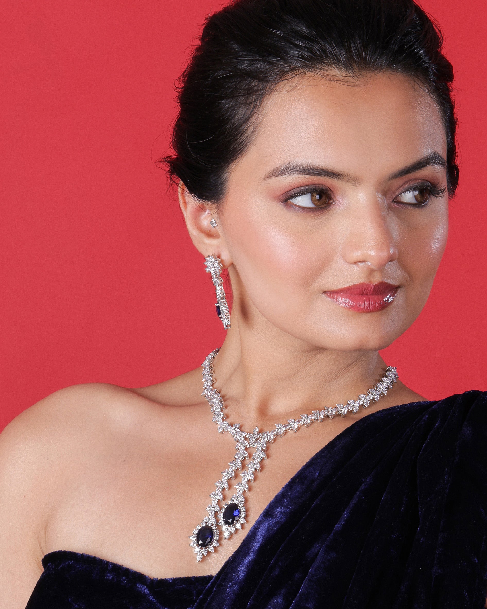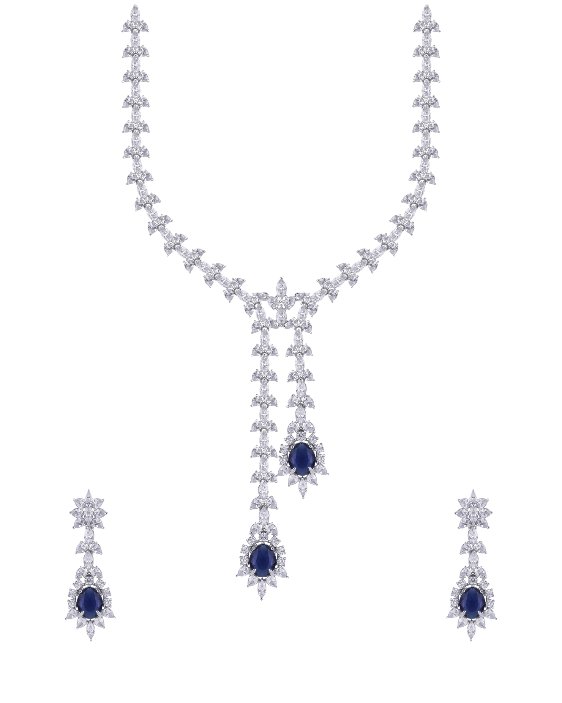 Discover our luxurious blue sapphire necklace and earring set, crafted with sparkling cubic zirconia stones. Perfect for weddings, special occasions, or adding a touch of elegance to any outfit. Shop now for timeless elegance and unmatched quality.