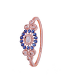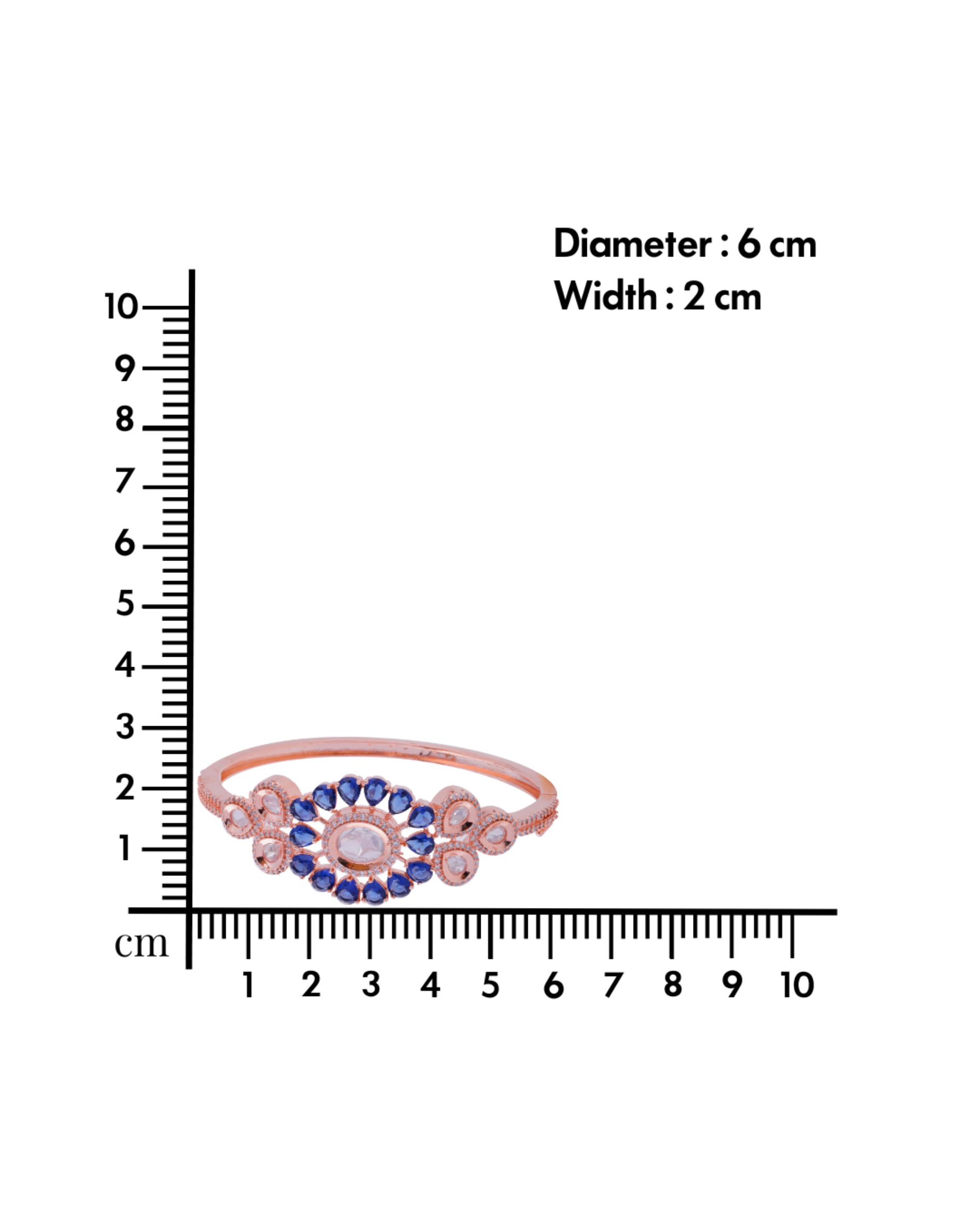 The bracelet features a meticulous arrangement of Kundan stones in various shades of blue, each carefully chosen for its vibrant hue and brilliant sparkle. The combination of blue stones and rose gold creates a harmonious contrast, resulting in a captivating piece that effortlessly catches the light and draws attention to your wrist.