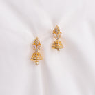 These golden jhumkas with a pretty butterfly cut and intricate lattice work are playful and charming. The dome is encrusted with semi-precious stones and features a delicate pearl drop to add that extra charm. Made of brass alloy which is polished with 18 kt gold and semi-precious stones. A fun choice for holidays and celebrations.