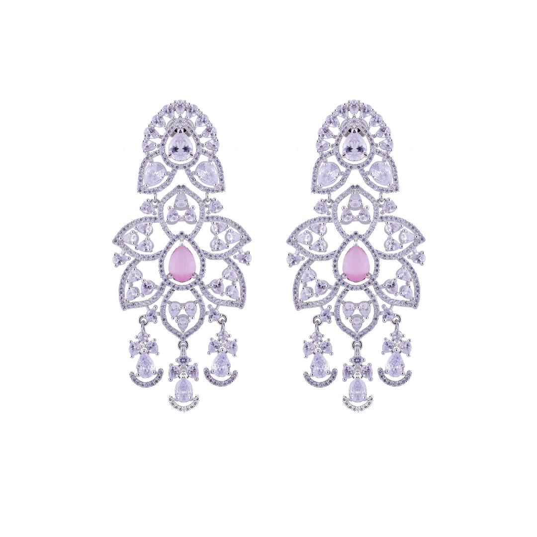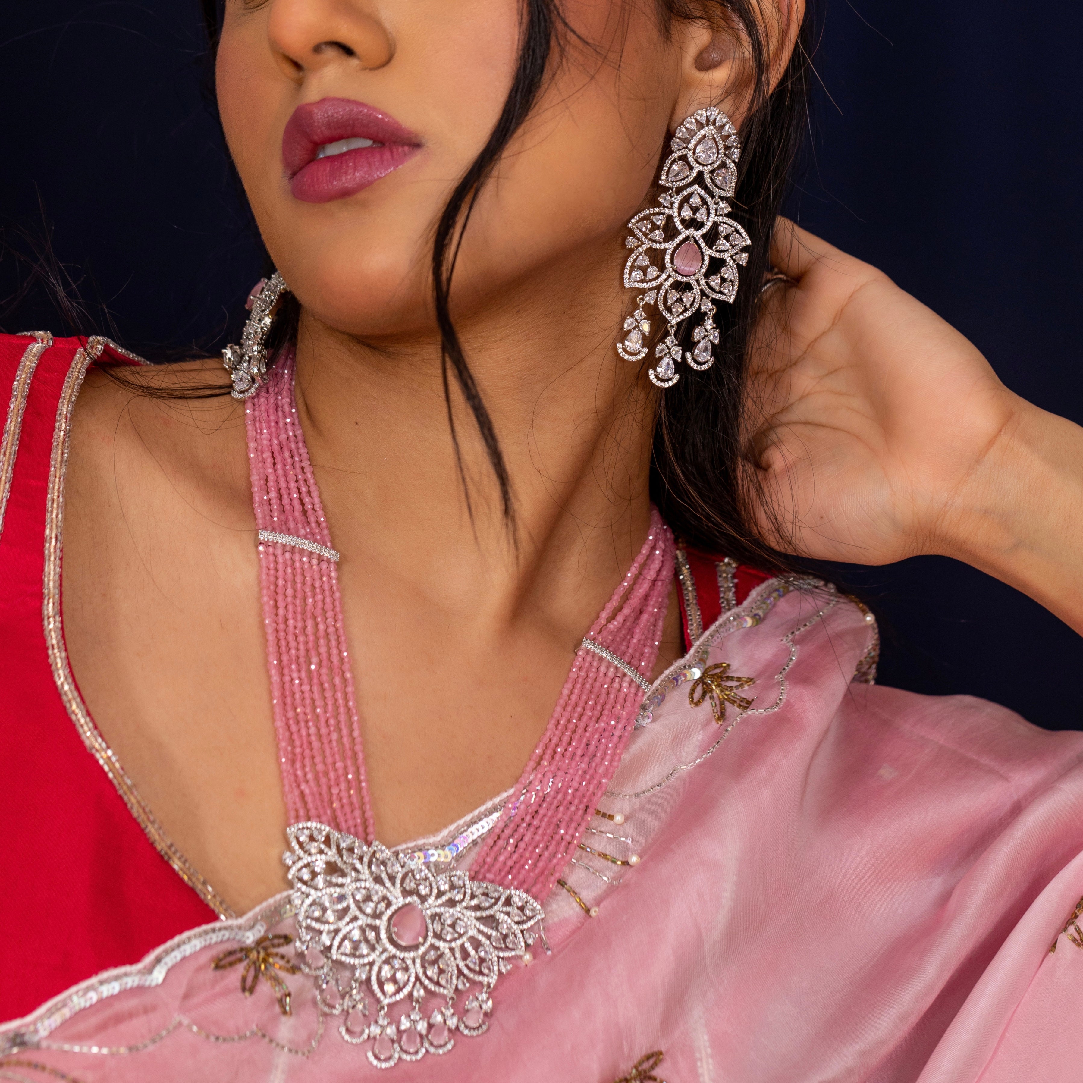 Complementing the pendant are the matching earrings, meticulously crafted to mirror its captivating beauty. The earrings feature the same pink beads and zirconia stones, creating a harmonious and balanced look when worn together with the pendant. They are designed to comfortably adorn your ears and add a touch of glamour to your overall appearance.