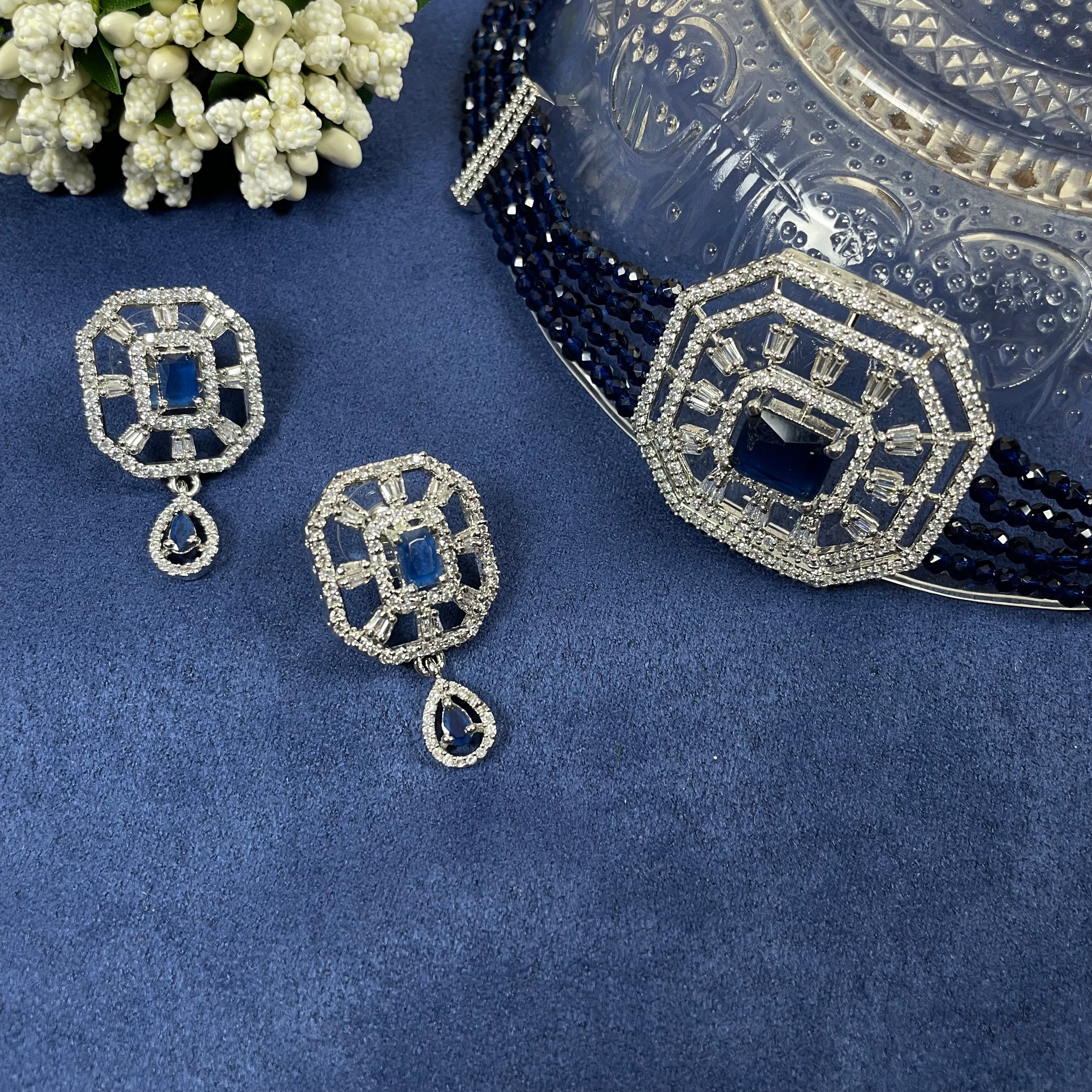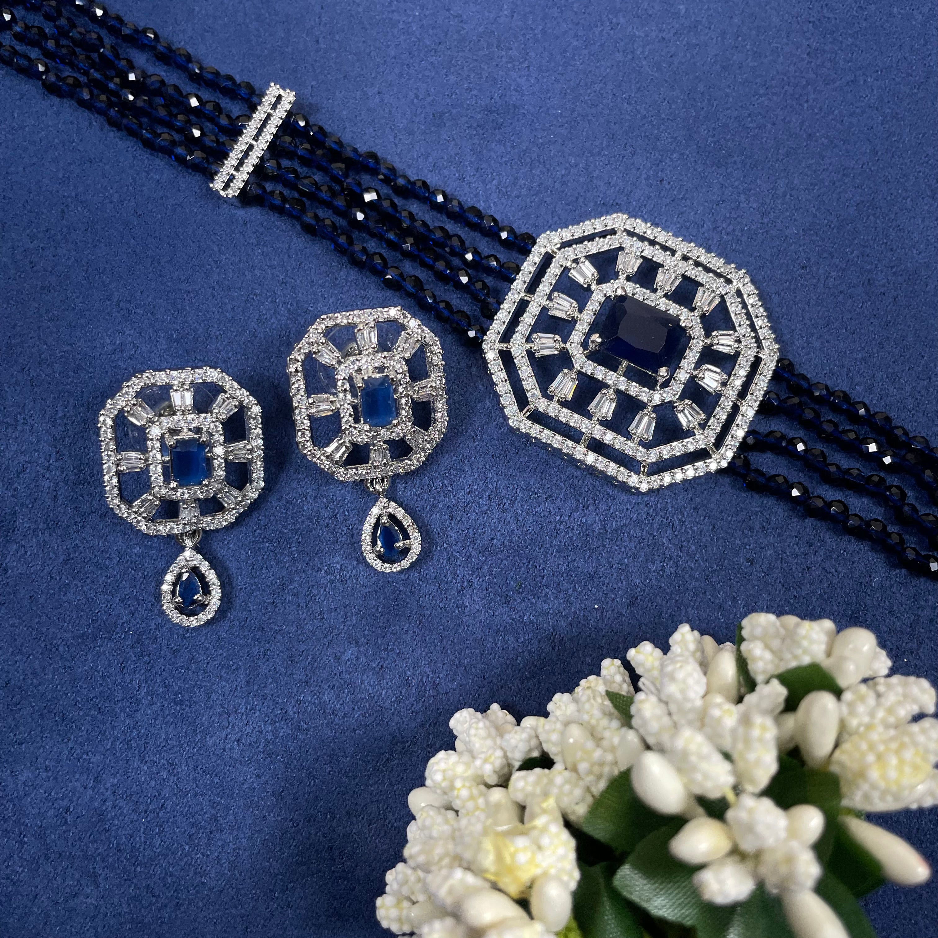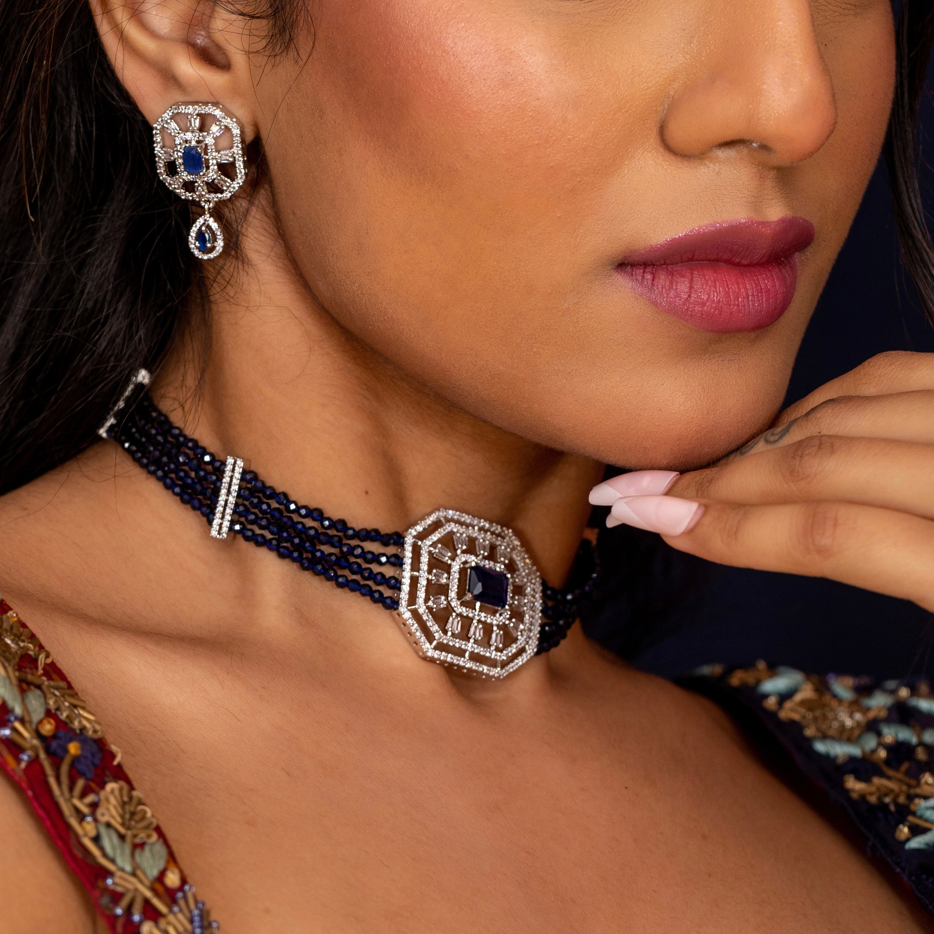 Davina Silver Plated Blue Beads Choker Necklace Set