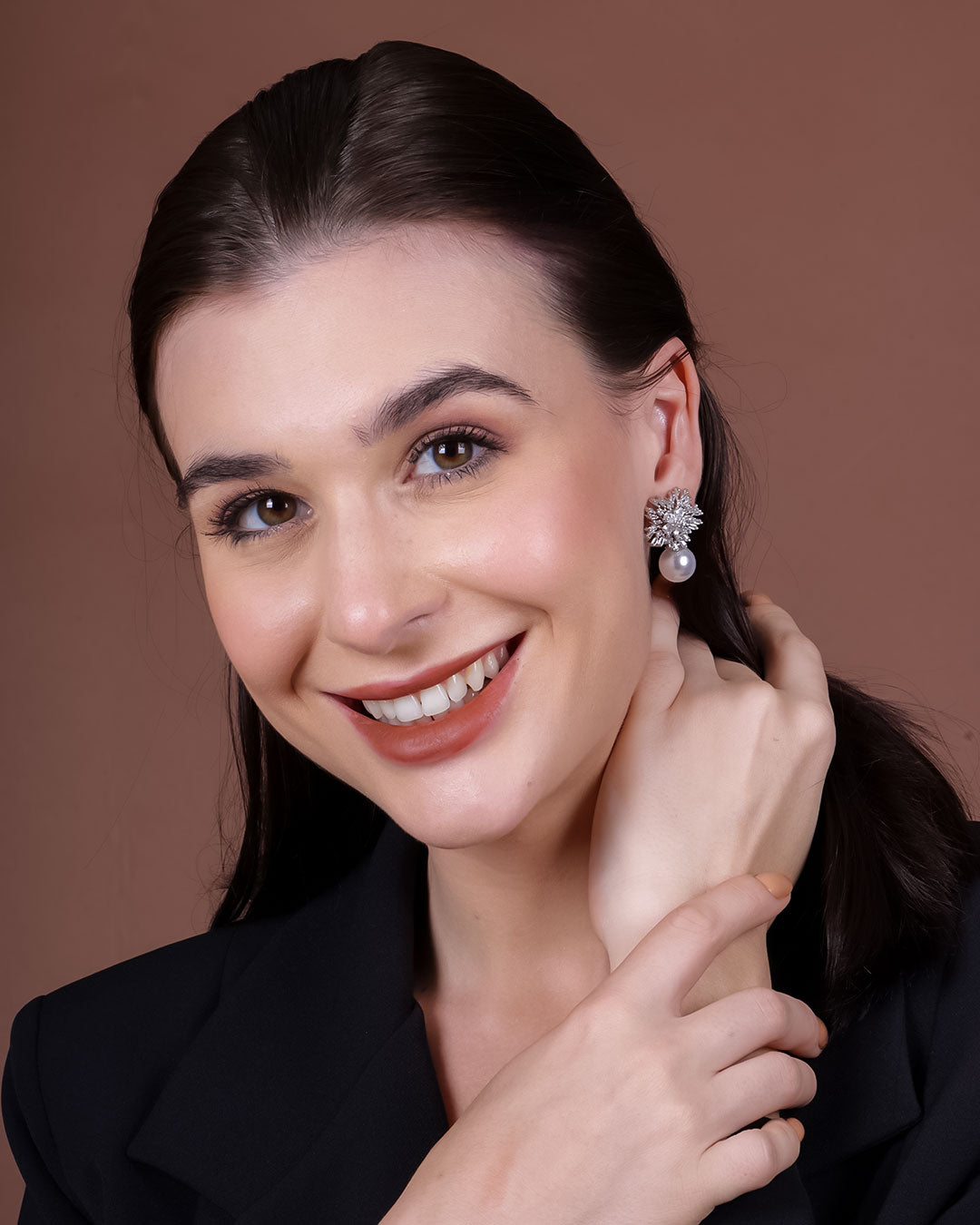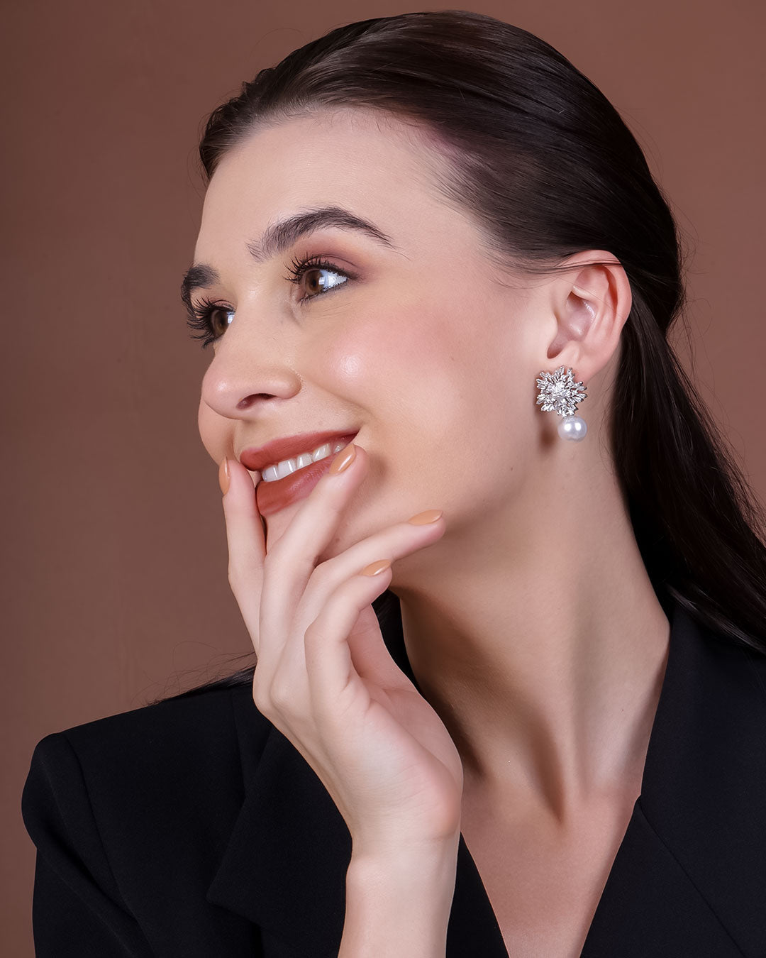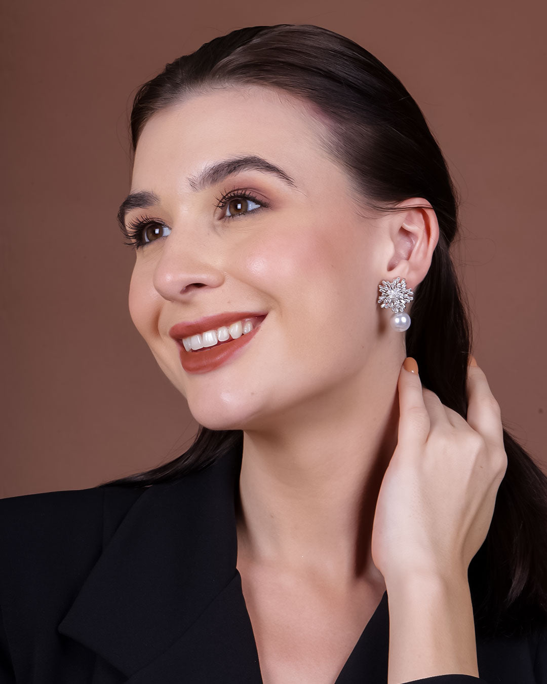 The combination of CZ accents and pearl drops creates a harmonious balance of sparkle and refinement. These earrings effortlessly enhance any outfit, from formal ensembles to casual attire, making them a versatile accessory for all occasions.