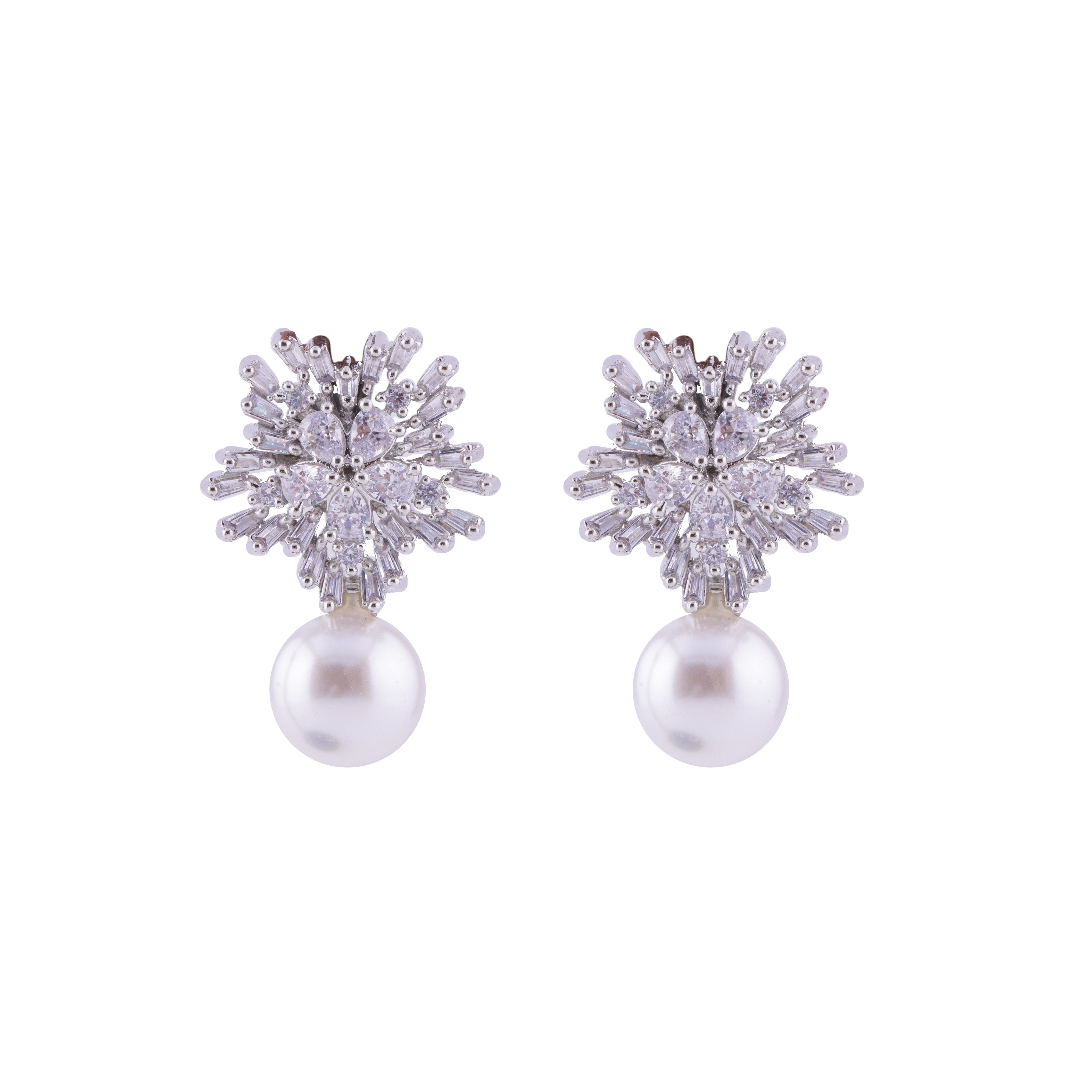 The delicate pearl drops dangle gracefully from the CZ accents, adding a touch of timeless beauty and elegance. The pearl is carefully chosen for their lustrous appearance and flawless quality, creating a stunning focal point for these earrings.