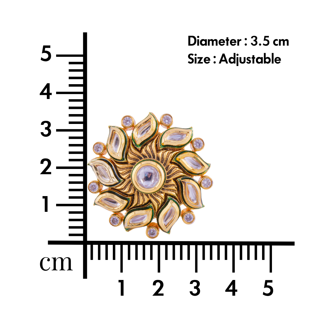 This Designer Gold Plated Kundan Ring is a statement piece that exudes grace and sophistication. Its versatile design makes it suitable for both formal occasions and everyday wear, adding a touch of glamour to any ensemble. Whether you're attending a special event, a wedding, or simply want to elevate your everyday style, this ring is sure to make a lasting impression.