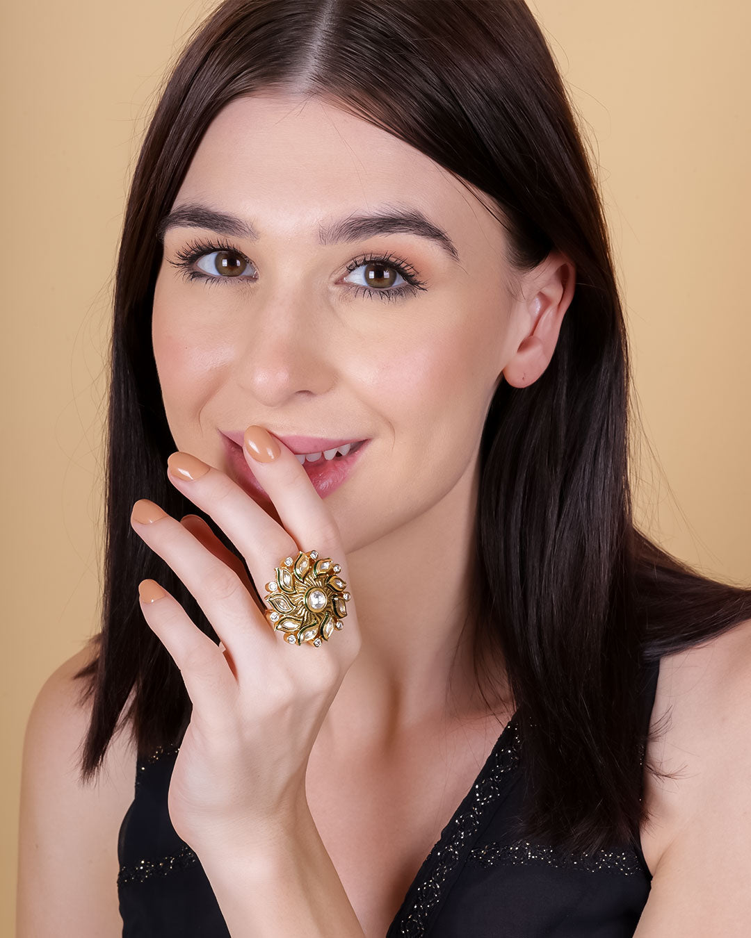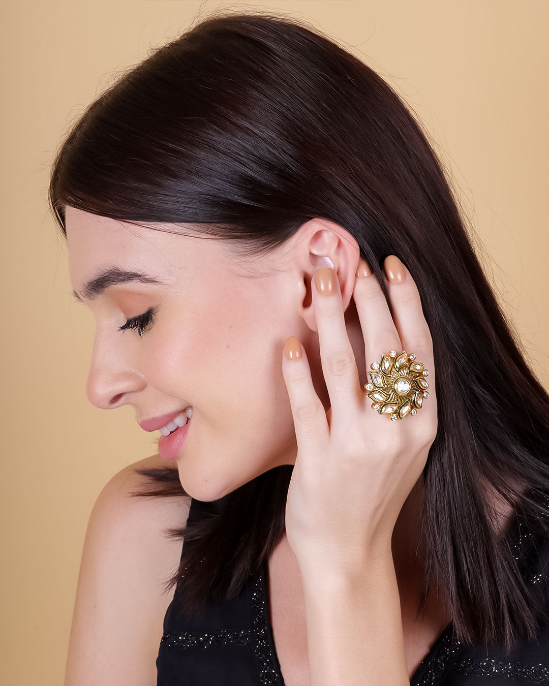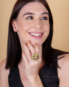 The centerpiece of this ring features a mesmerising Kundan stone, meticulously hand-set in a intricate and elaborate design. The Kundan stone, known for its captivating sparkle and vibrant colour, adds a touch of regal elegance to the ring. The intricate detailing around the stone showcases the skilled craftsmanship of our artisans, who have painstakingly brought this piece to life.