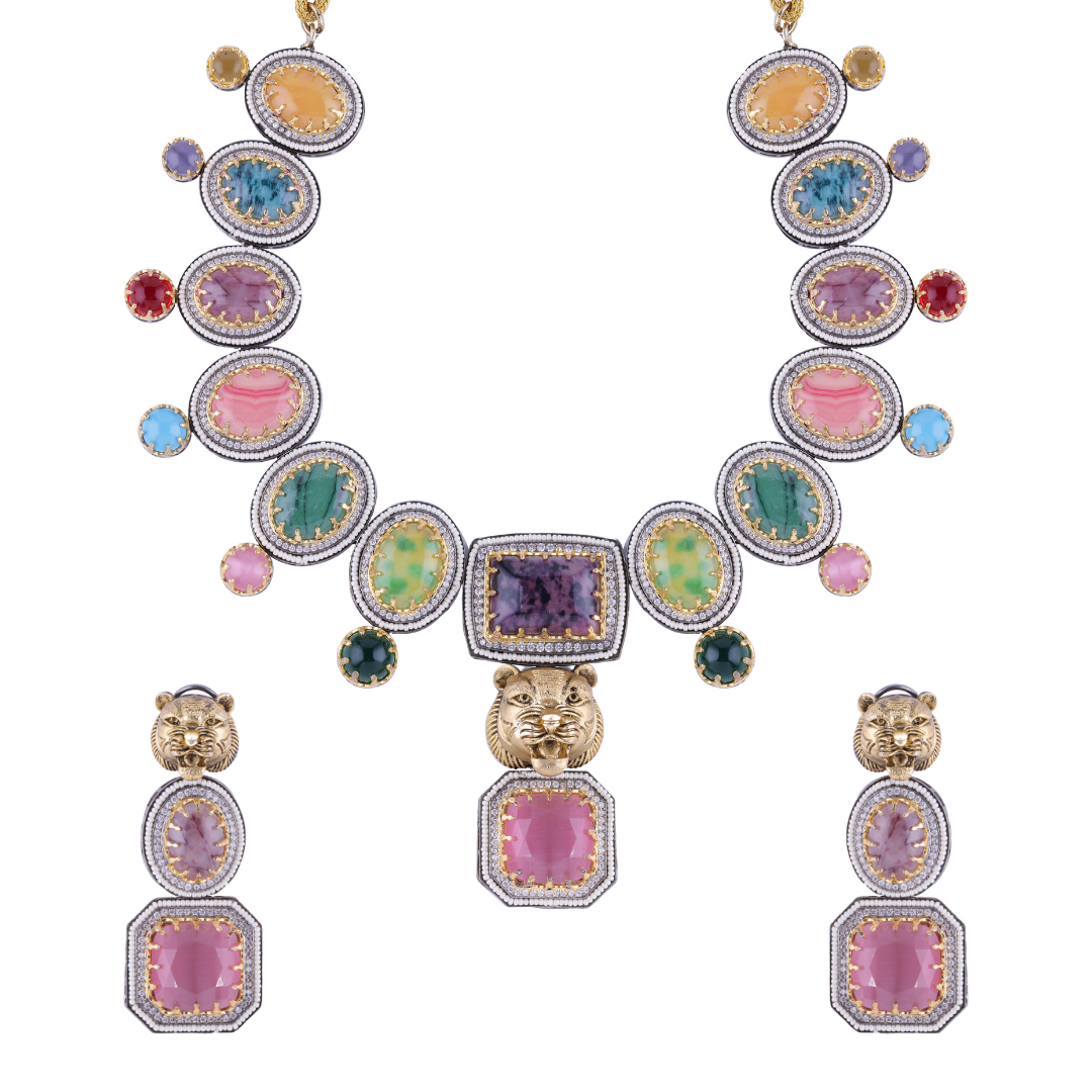 The necklace features kundan stones, which are uncut diamonds set in intricate settings, known for their brilliance and charm. The Kundan stones are typically set using a traditional technique where they are encased in gold, giving them an elegant and vintage feel.