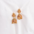 Divine elegance meets festive tradition in these jhumkas, featuring a beautifully crafted Devi statue and delicate floral motifs. A touch of green and pink adds holiday sparkle. Made of Brass alloy, 18K Gold Plated with picked semi precious stone for an amazing shine. Wear them to attract blessings and beauty on every occasion.