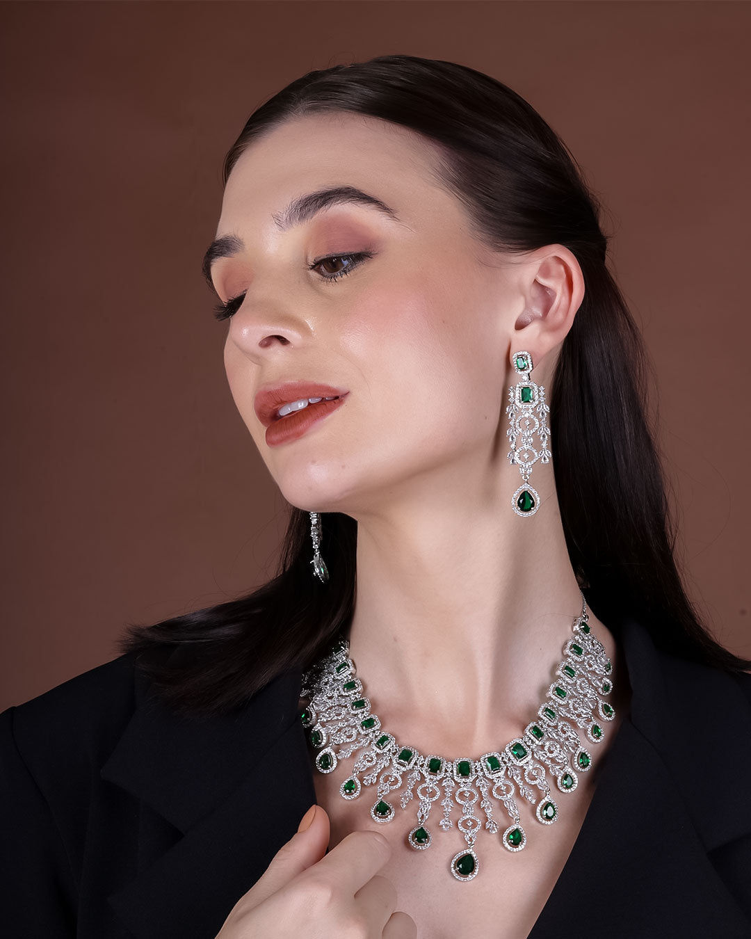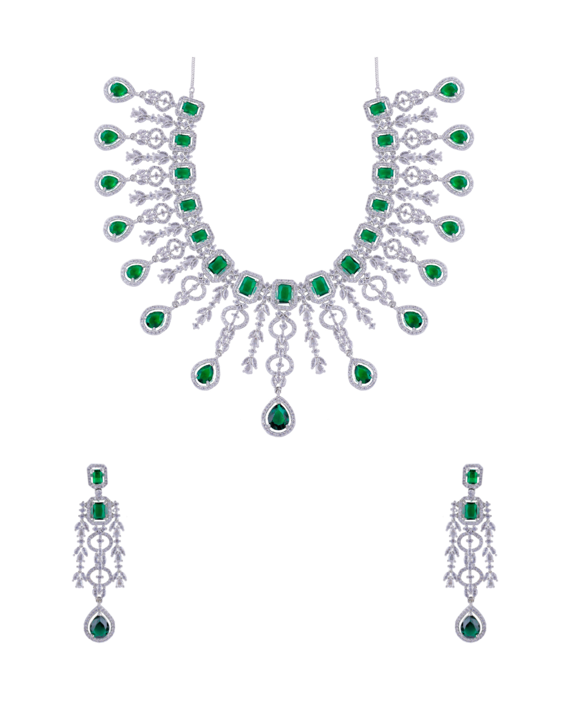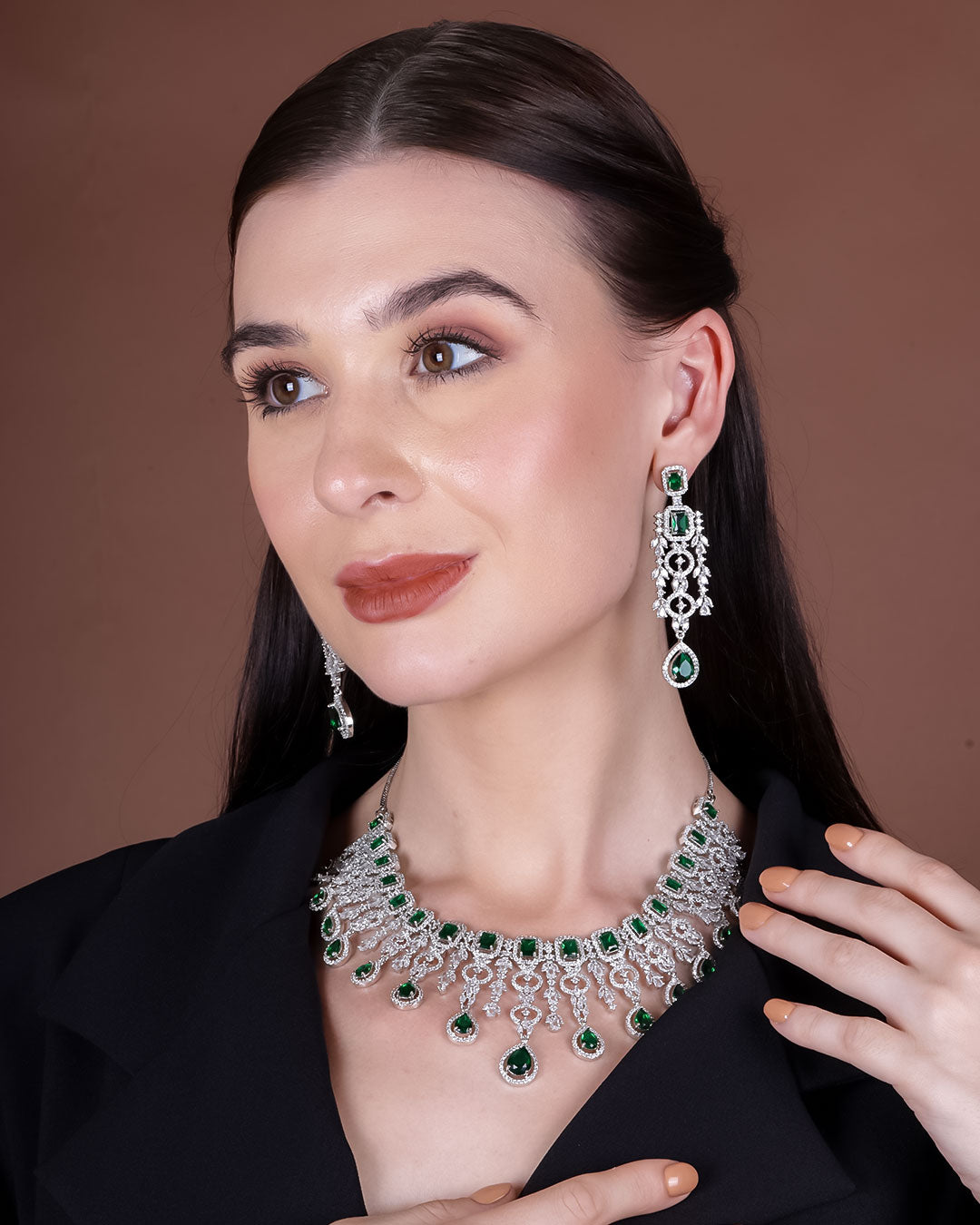 Crafted with high-quality materials, our Diana green stone zirconia necklace set is sure to turn heads and make a statement. The adjustable necklace chain ensures a comfortable and perfect fit for any neckline, while the matching earrings add a touch of sophistication and elegance.