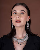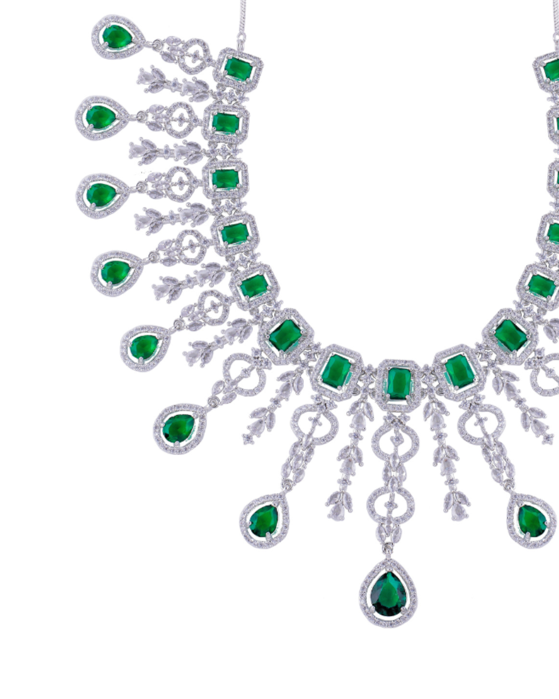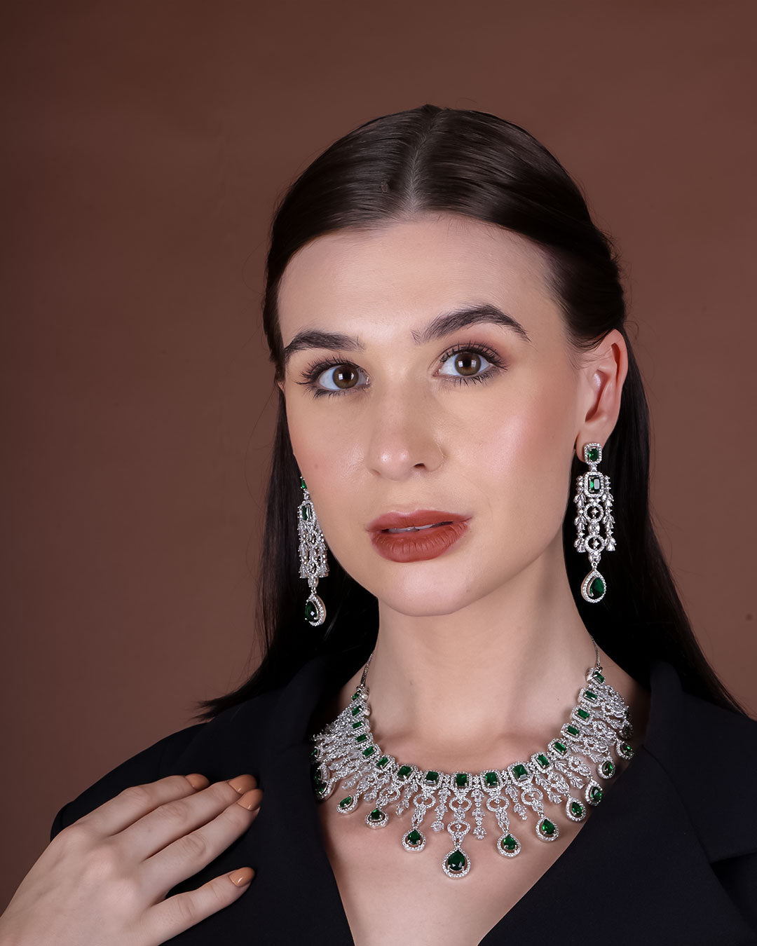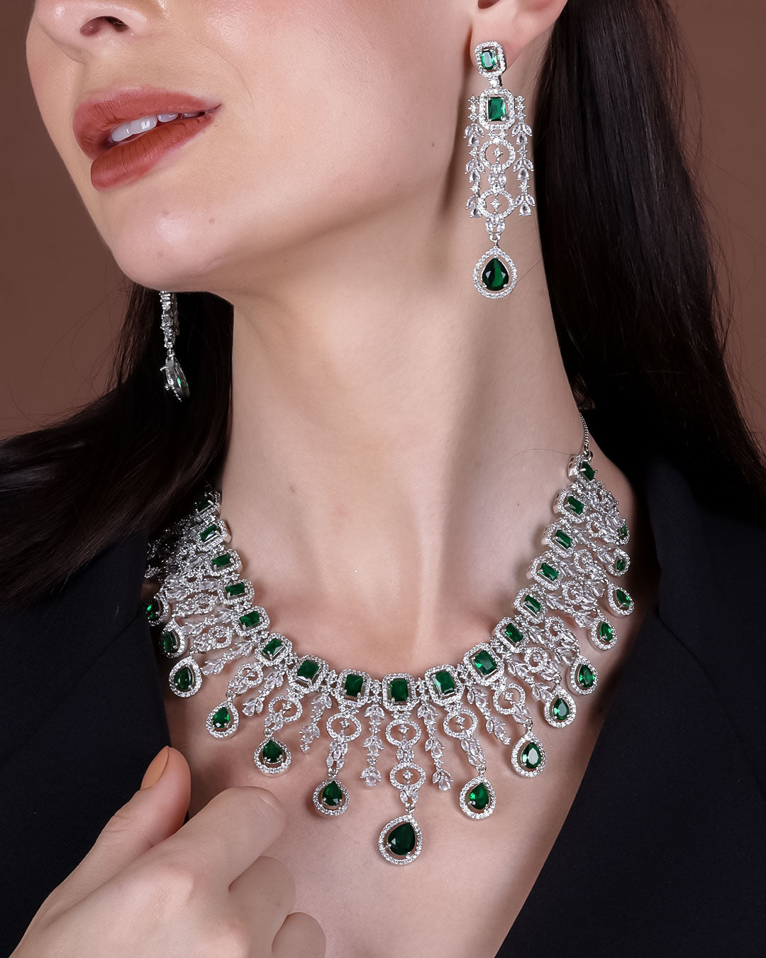 Crafted with high-quality materials, our Diana green stone zirconia necklace set is sure to turn heads and make a statement. The adjustable necklace chain ensures a comfortable and perfect fit for any neckline, while the matching earrings add a touch of sophistication and elegance.