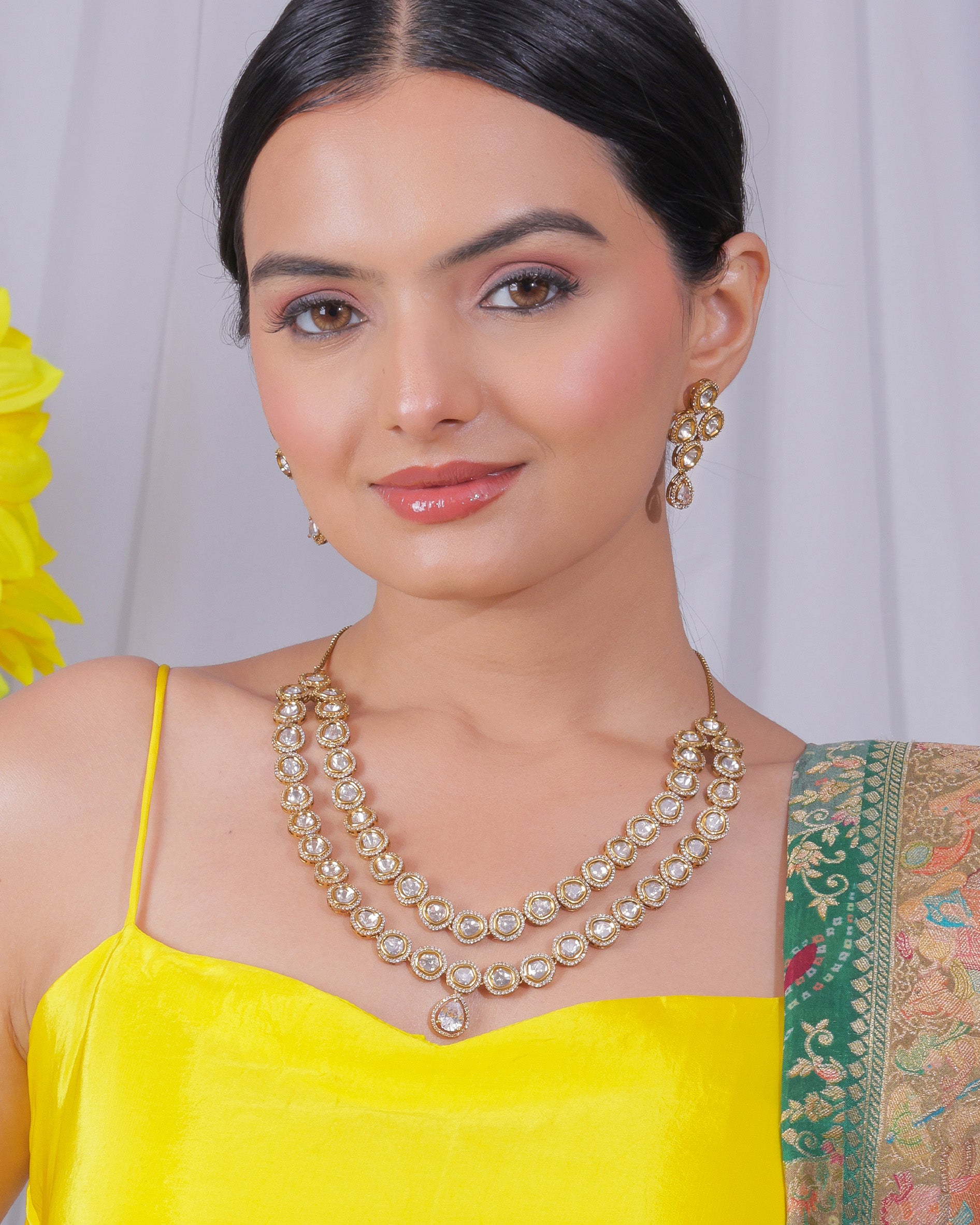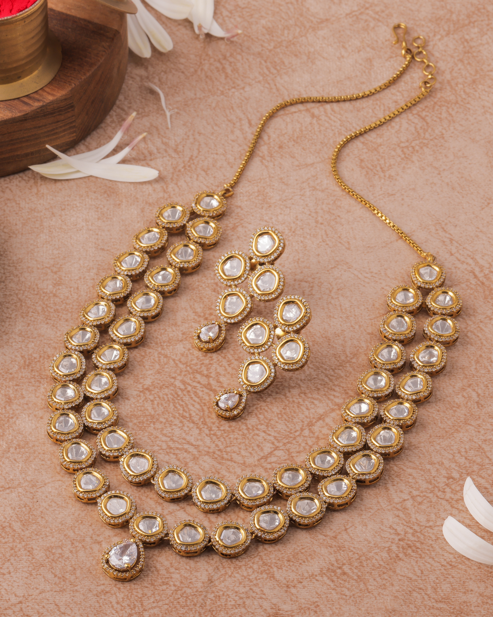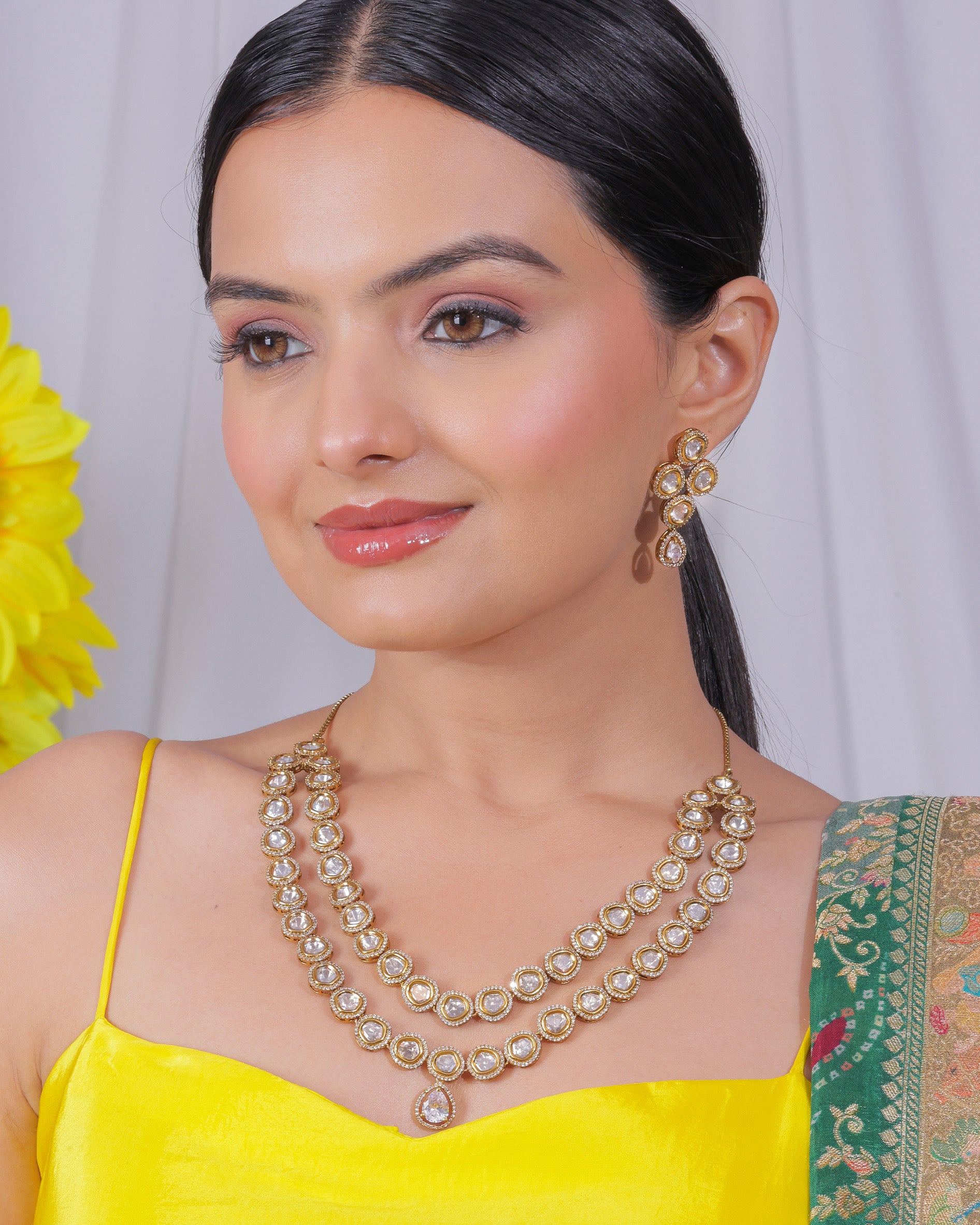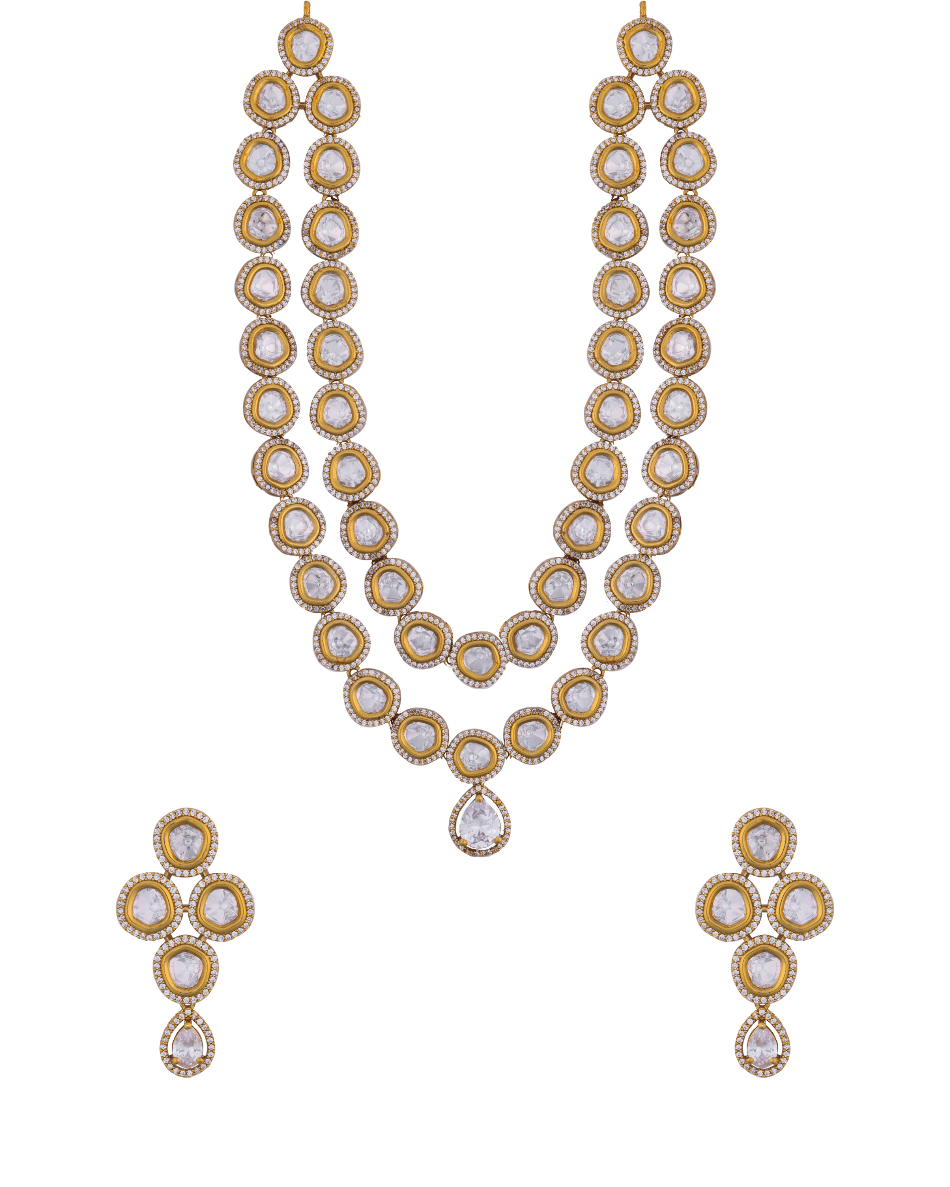 Indulge in the exquisite allure of our Double Layer Moissanite Polki Necklace Set, a dazzling fusion of traditional craftsmanship and modern elegance. This stunning necklace set features two luxurious layers of sparkling Moissanite Polki stones, each meticulously cut to reflect light with breathtaking brilliance.