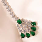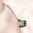 Make a statement with this elegant dewdrop mangtika. The design features cascading pear-shaped green stones paired with sparkling American diamonds, blending modern flair with classic charm. Crafted from brass alloy, it showcases handpicked semi-precious stones and AAA+ American diamonds for radiant brilliance. Perfect for festive and bridal occasions.