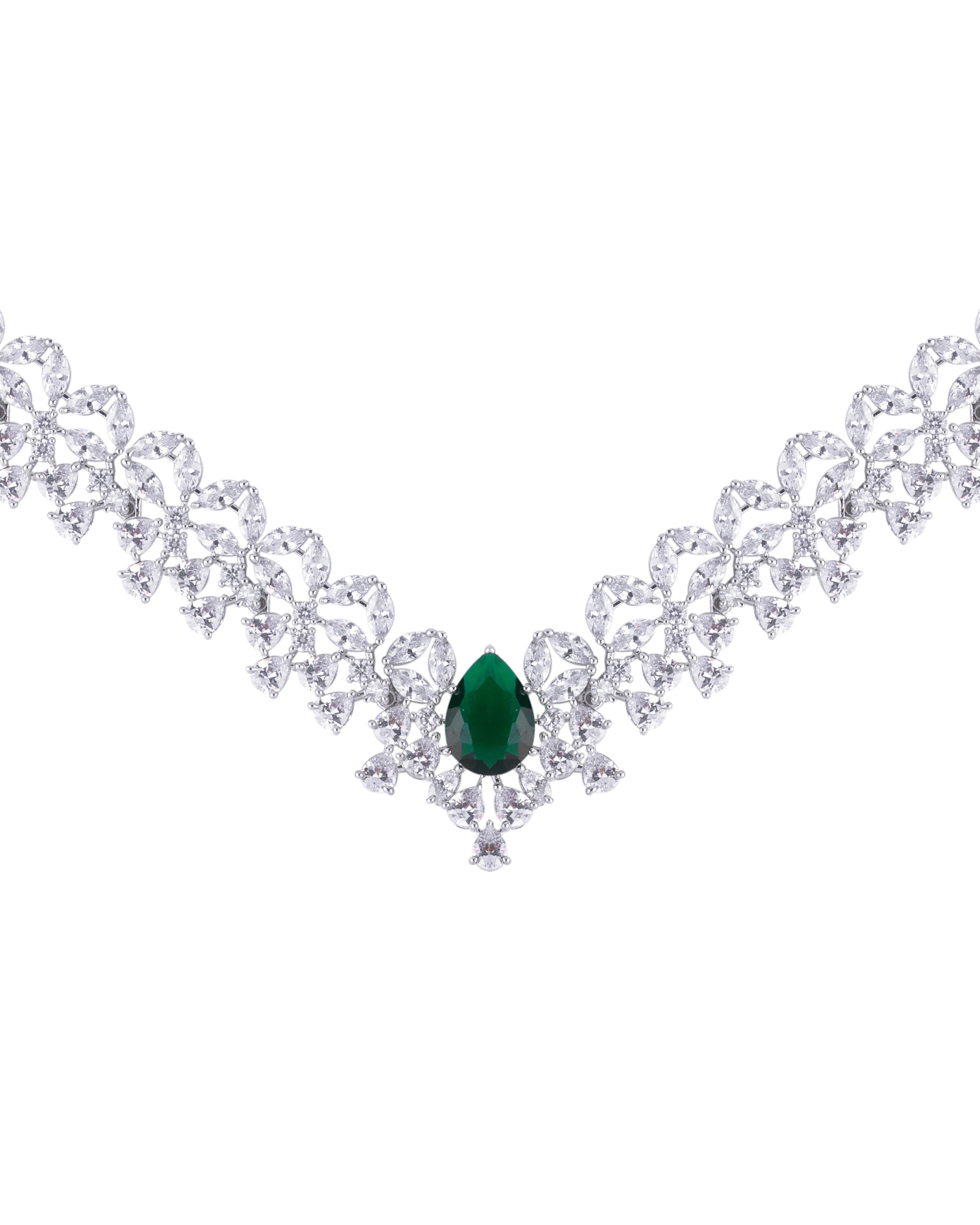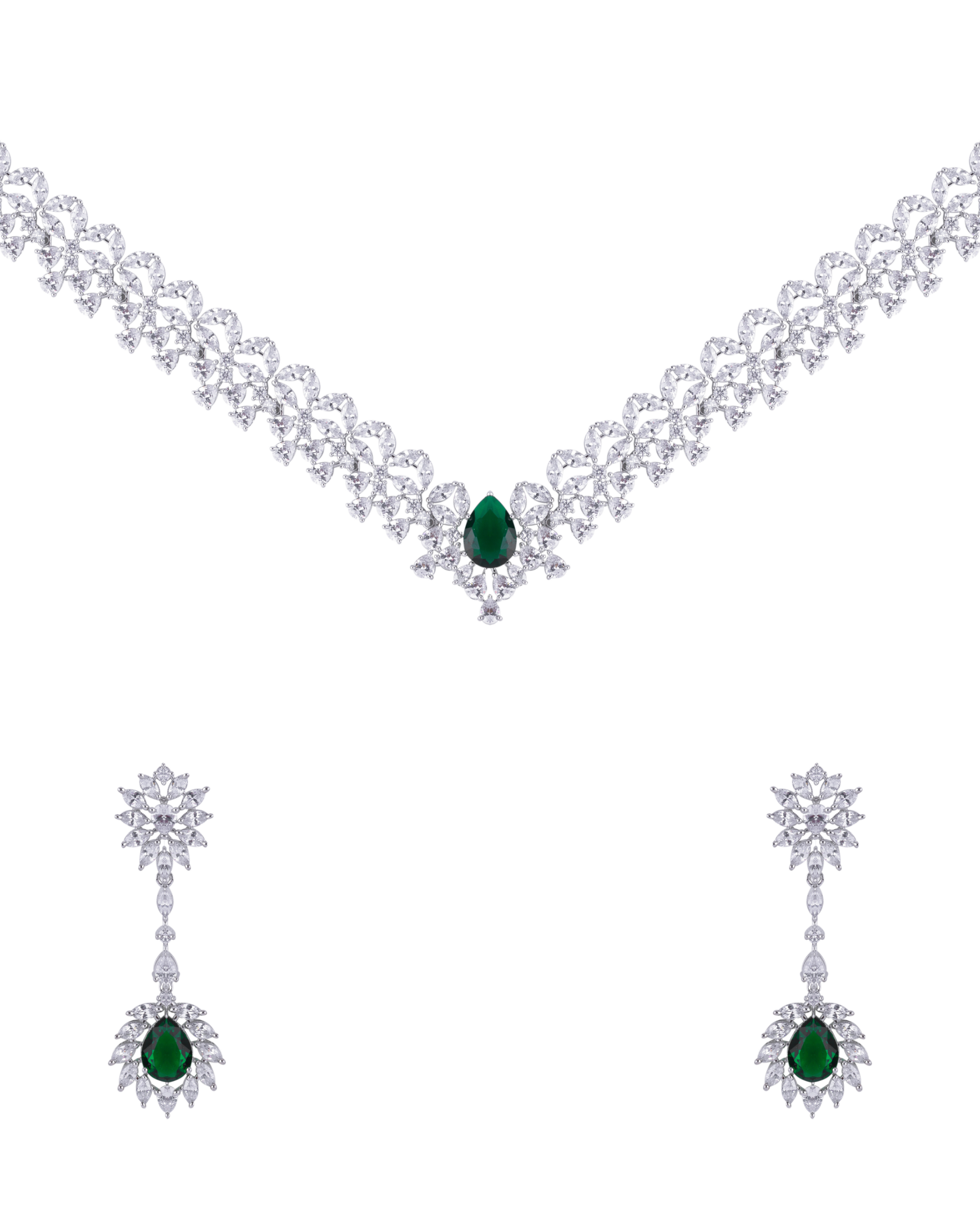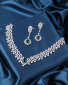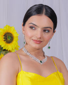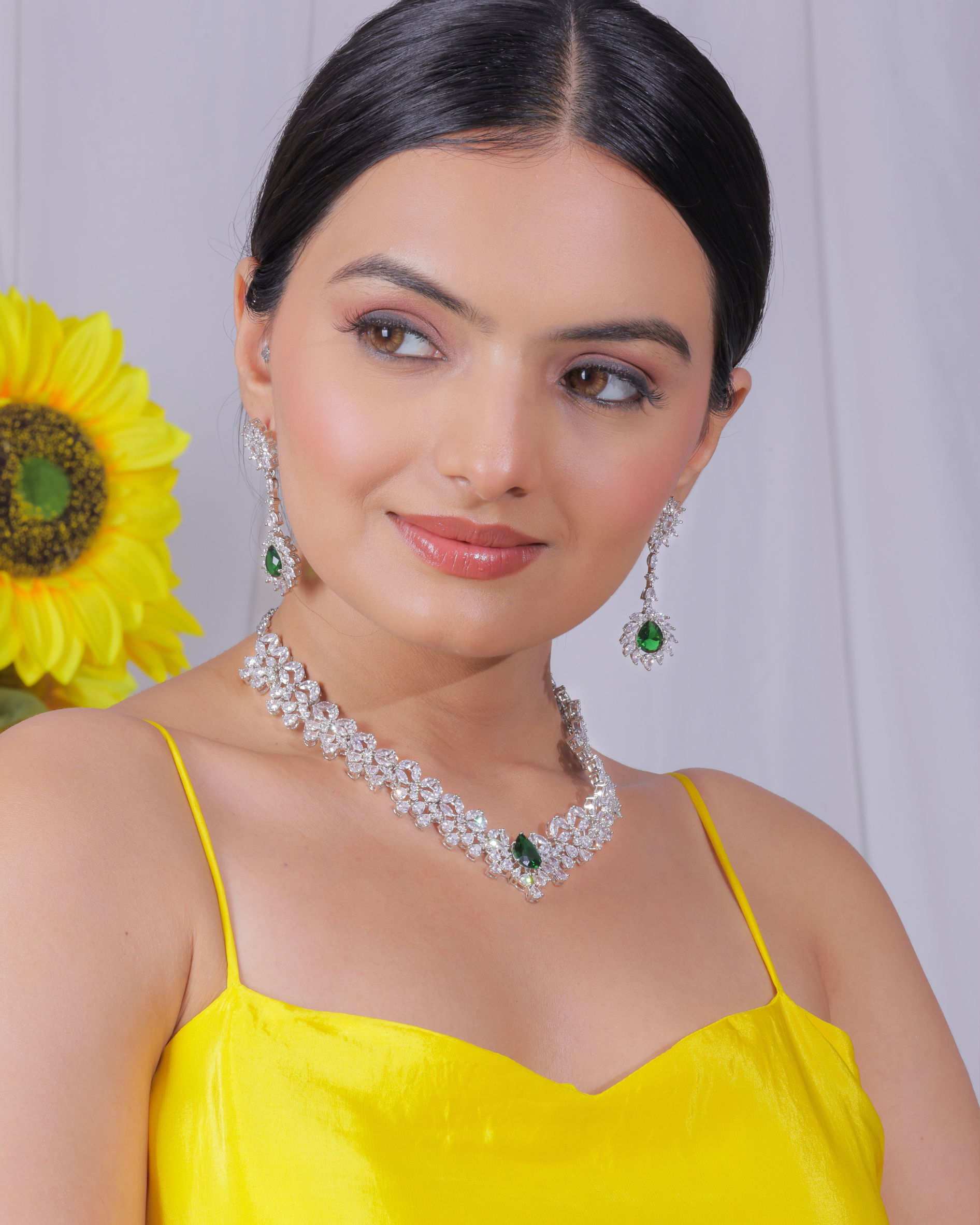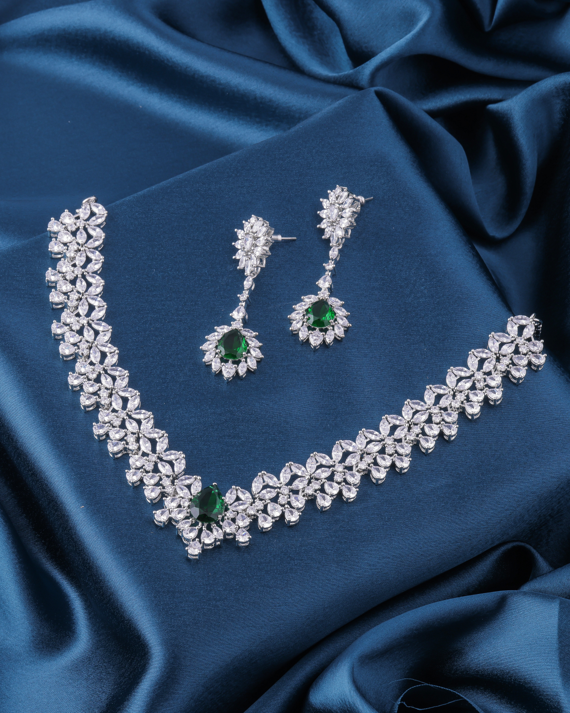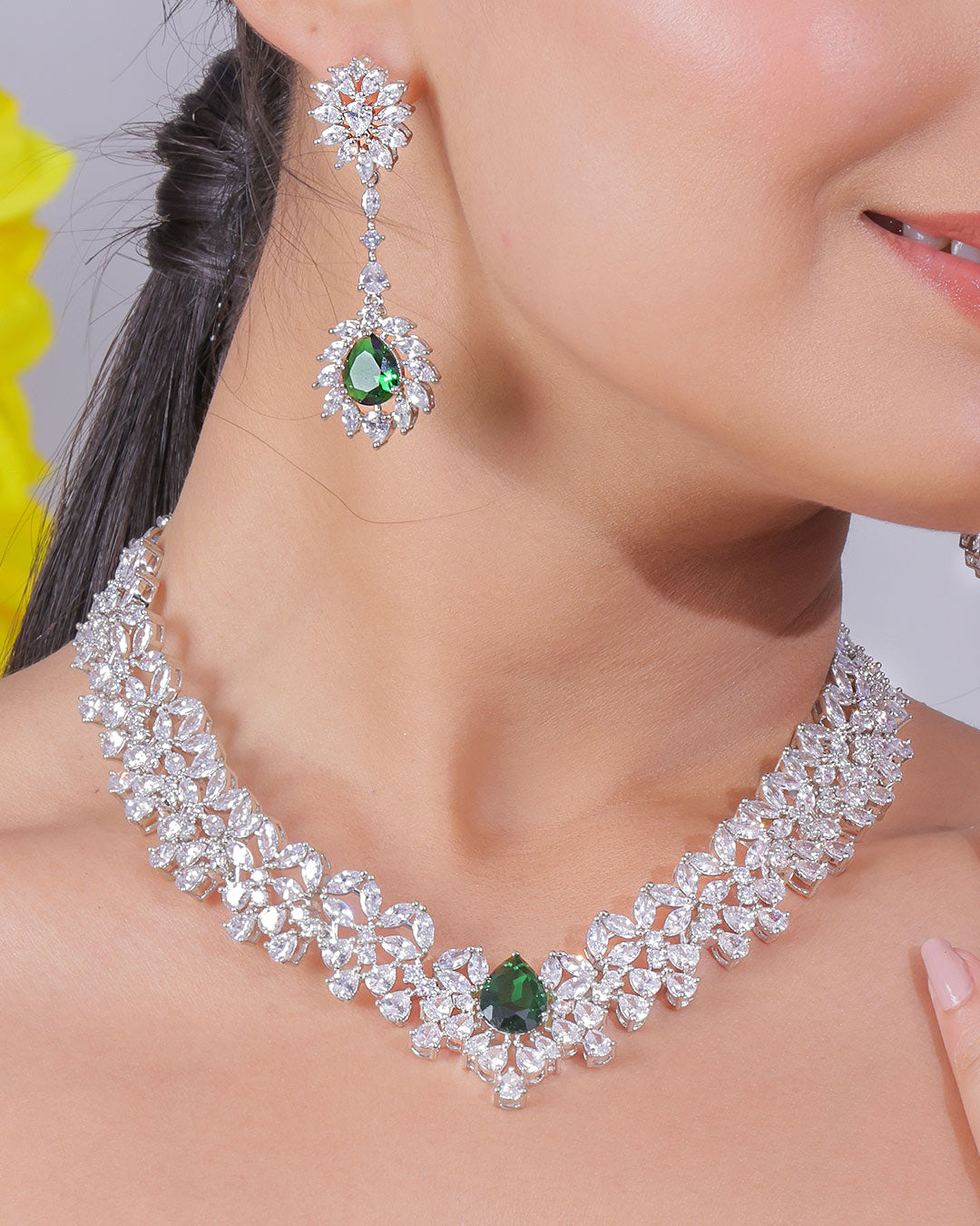 Shine with elegance in our Emerald Floral Drop Necklace Set. Featuring a stunning floral design with emerald accents and matching earrings, this set is perfect for formal events and special occasions. The sparkling faux diamonds add a luxurious touch, making it ideal for those who love sophisticated style. Shop now for elegant imitation jewelry and elevate your look with this exquisite set.