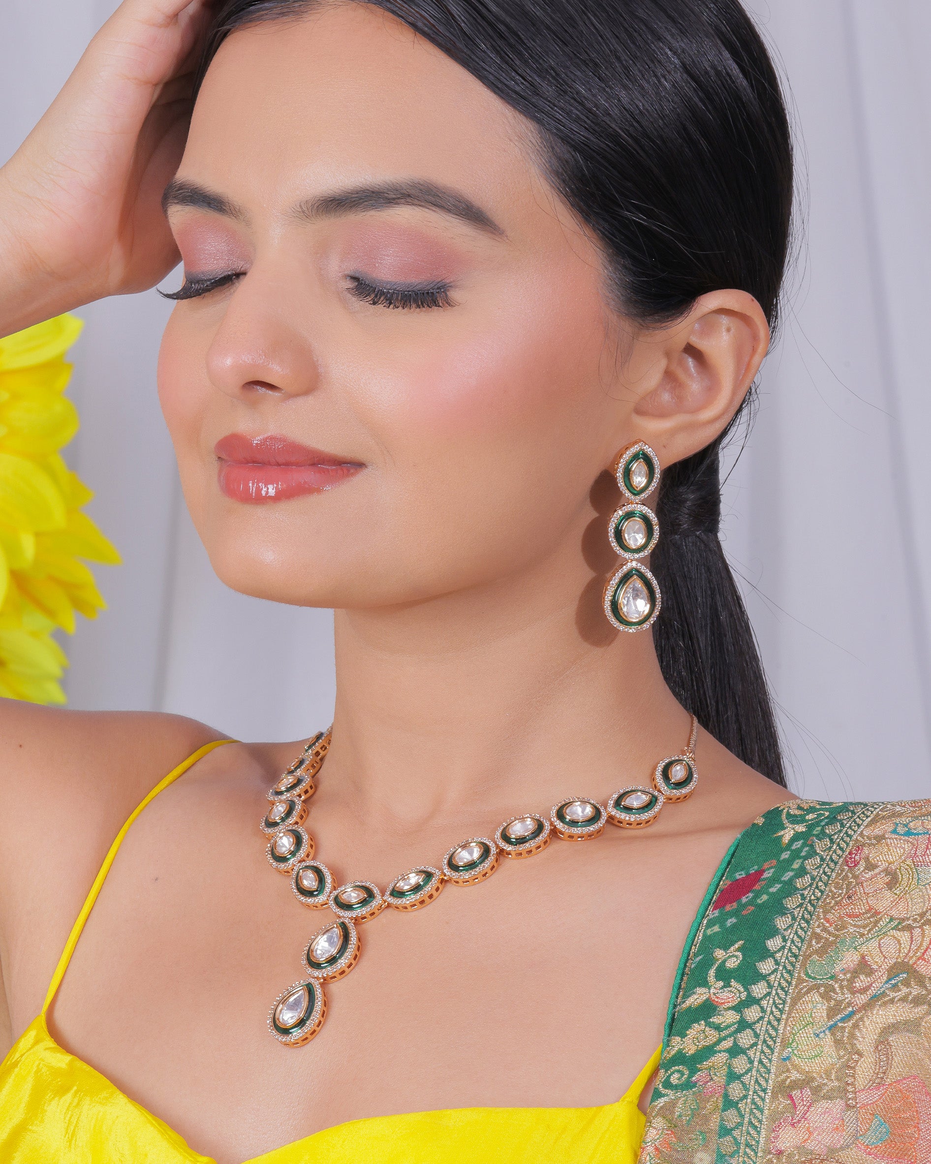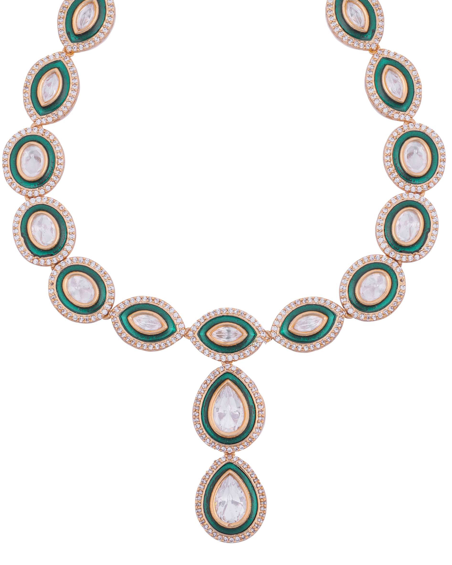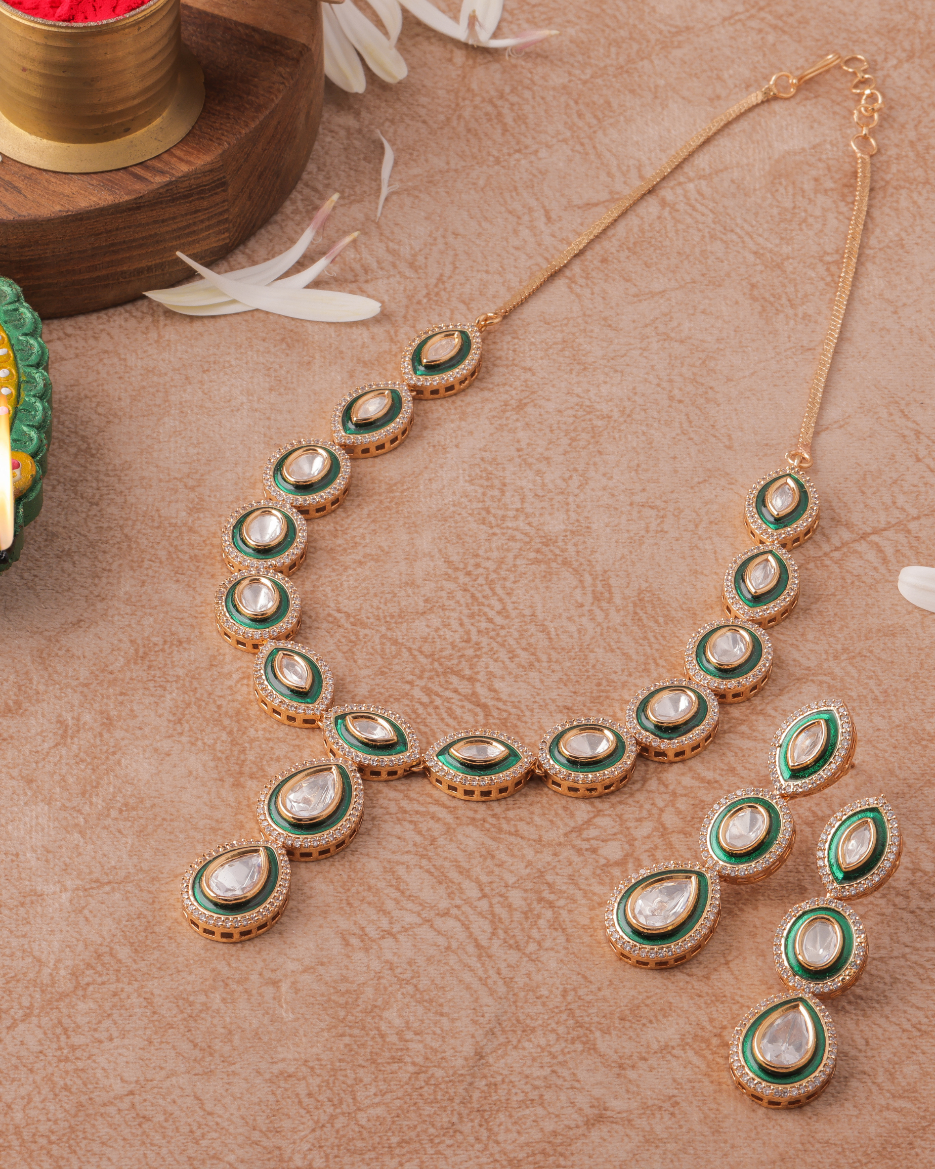 Immerse yourself in the opulence of traditional Indian craftsmanship with our Emerald Meenakari Kundan Necklace Set. This exquisite set is a true celebration of heritage and artistry, featuring a stunning combination of rich emerald green hues and intricate Meenakari work, all highlighted by the timeless beauty of Kundan stones