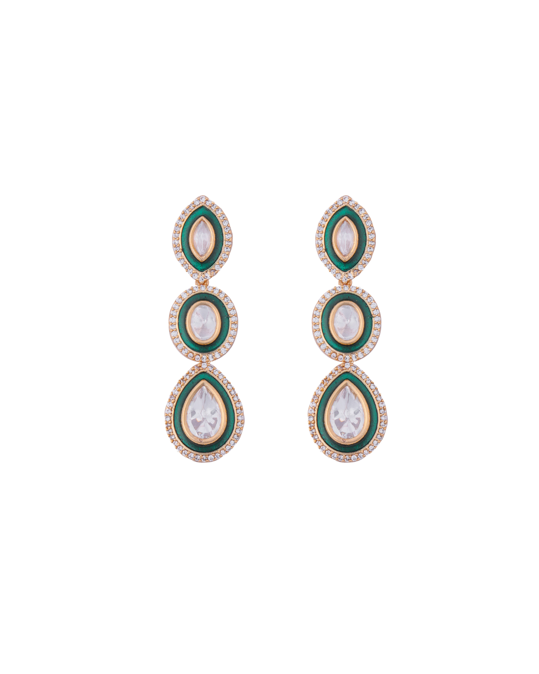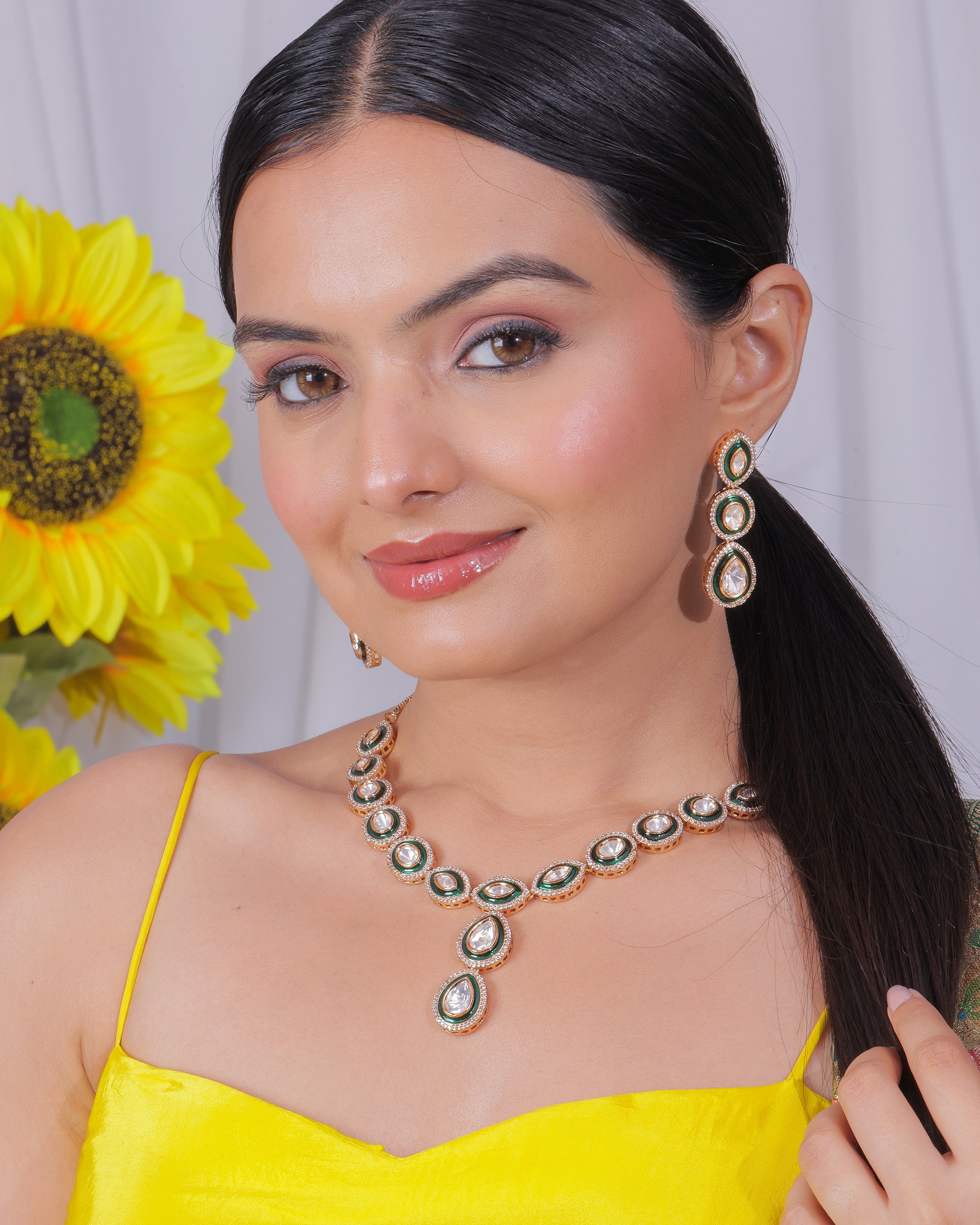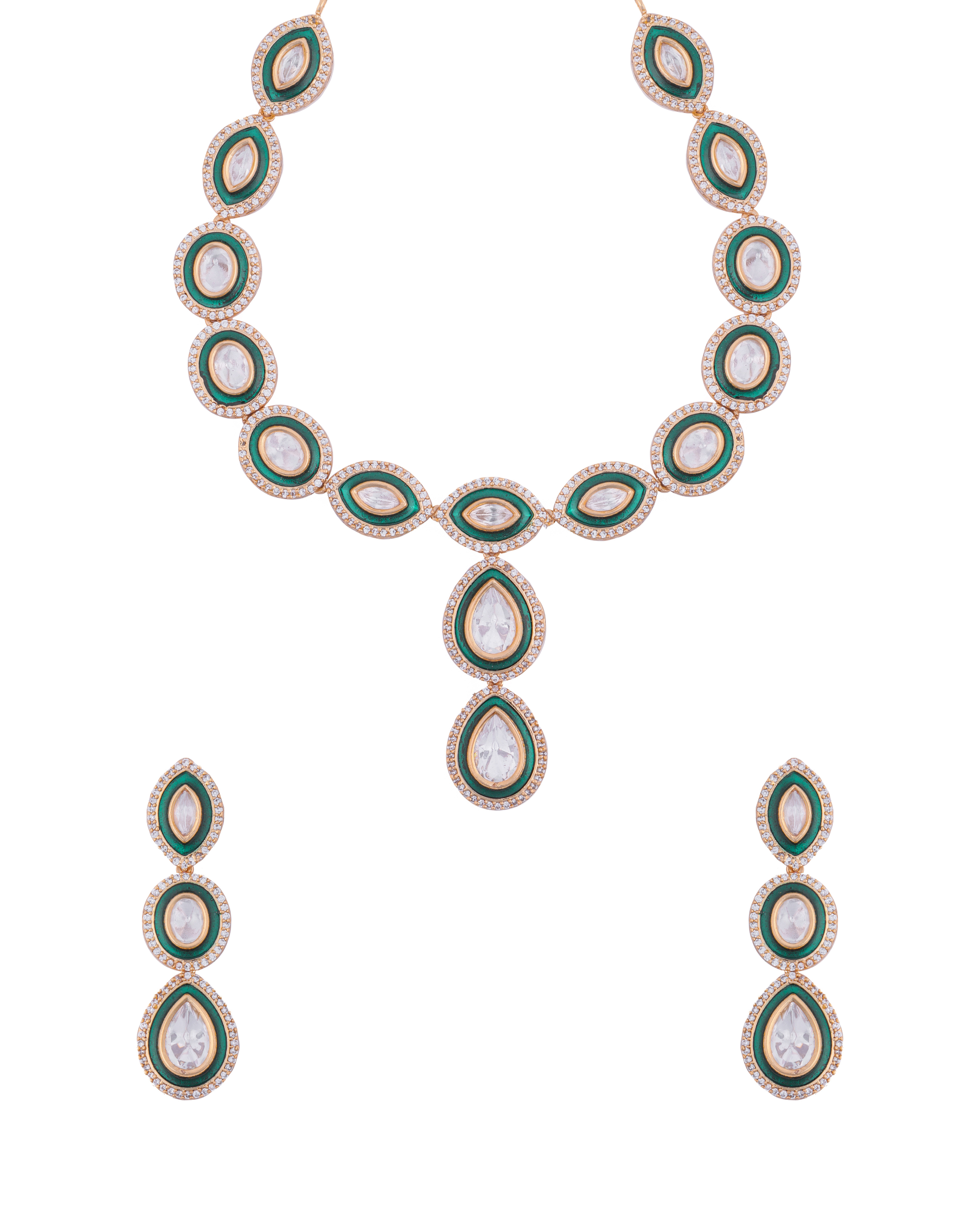 Immerse yourself in the opulence of traditional Indian craftsmanship with our Emerald Meenakari Kundan Necklace Set. This exquisite set is a true celebration of heritage and artistry, featuring a stunning combination of rich emerald green hues and intricate Meenakari work, all highlighted by the timeless beauty of Kundan stones