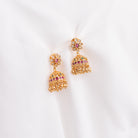 A touch of tradition for every celebration. The golden jhumkas are made of a floral stud with bright rubies and the traditional jhumka dome has pink and green stones embedded on them. Made from brass alloy and plated with 18k gold, this has been handpicked semi precious stones for the same piece. Ideal festival and ethnic wear.
