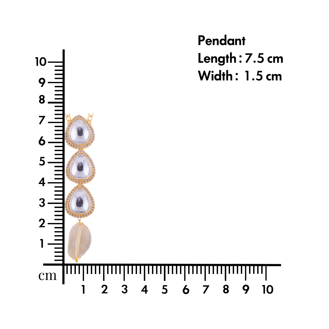 The gold plated kundan stone pendant set is perfect for adding a touch of glamour to any outfit. The intricate detailing of the metal frame creates a breathtaking effect, while the shimmering kundan stone adds a touch of sparkle and shine.