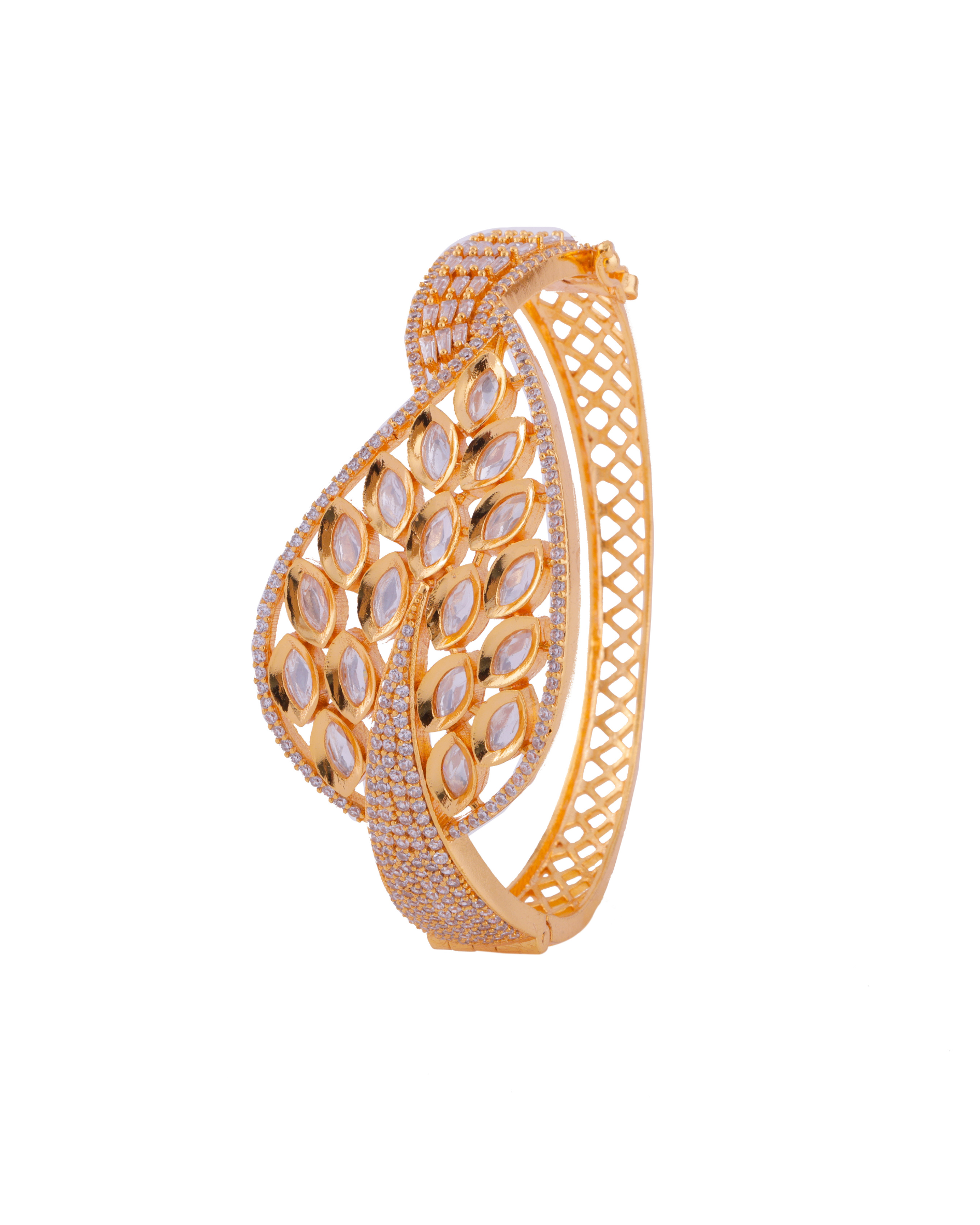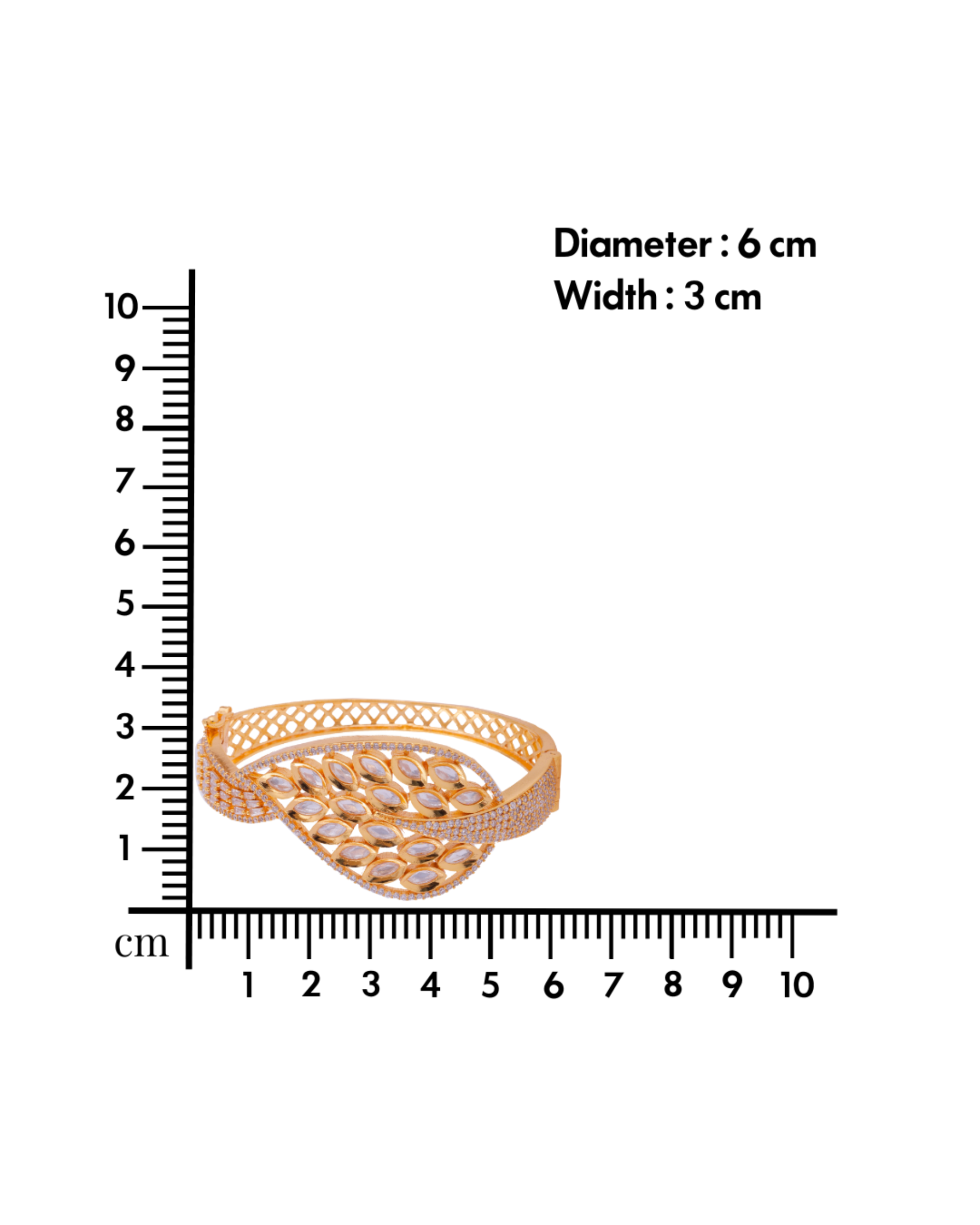 The gold plating adds a touch of luxury and richness to the bracelet, enhancing the intricate details of the leaf design. The Kundan stones, with their exceptional clarity and sparkle, create a captivating play of light and brilliance, adding an aura of opulence to your wrist.