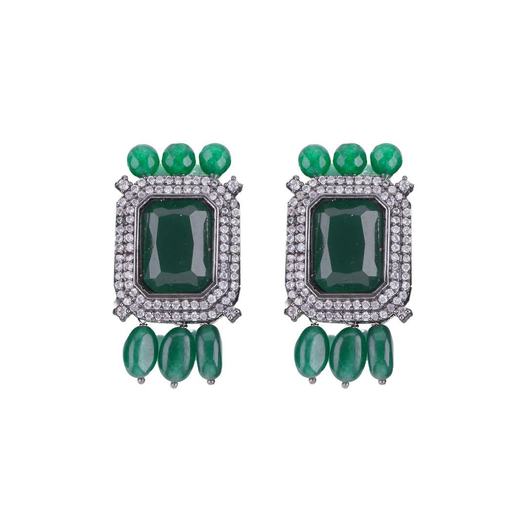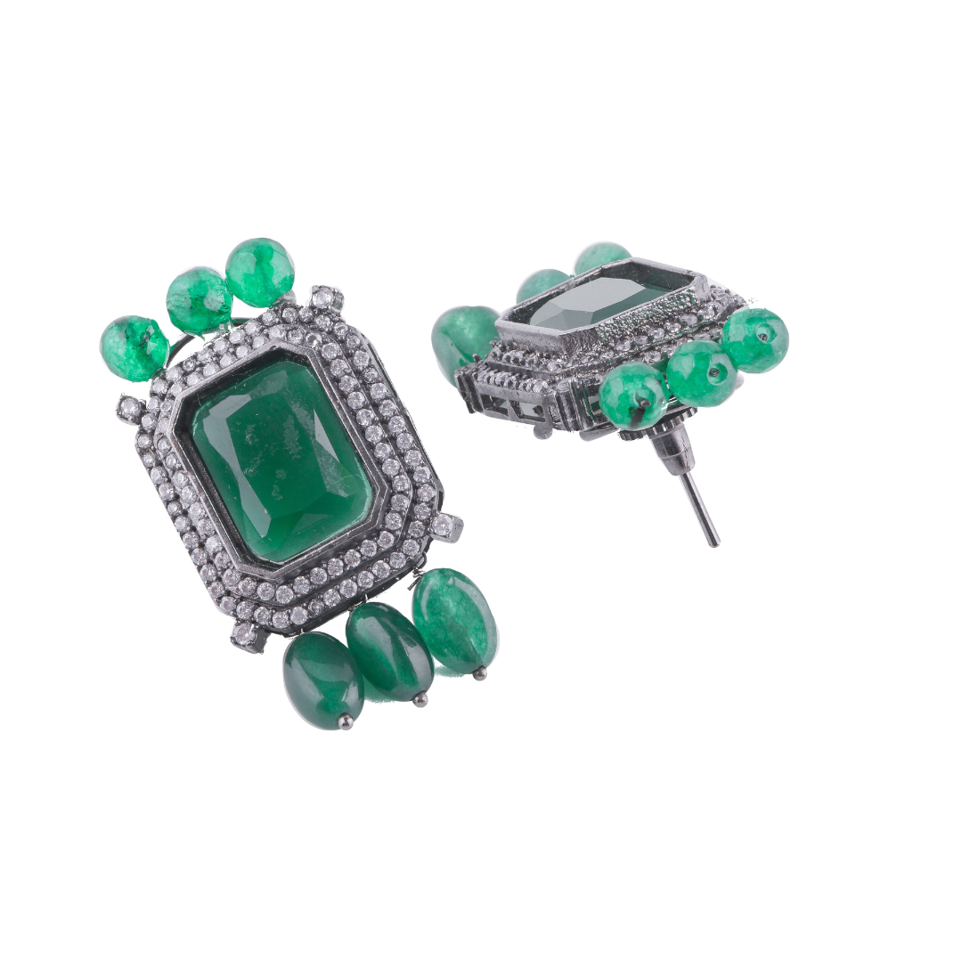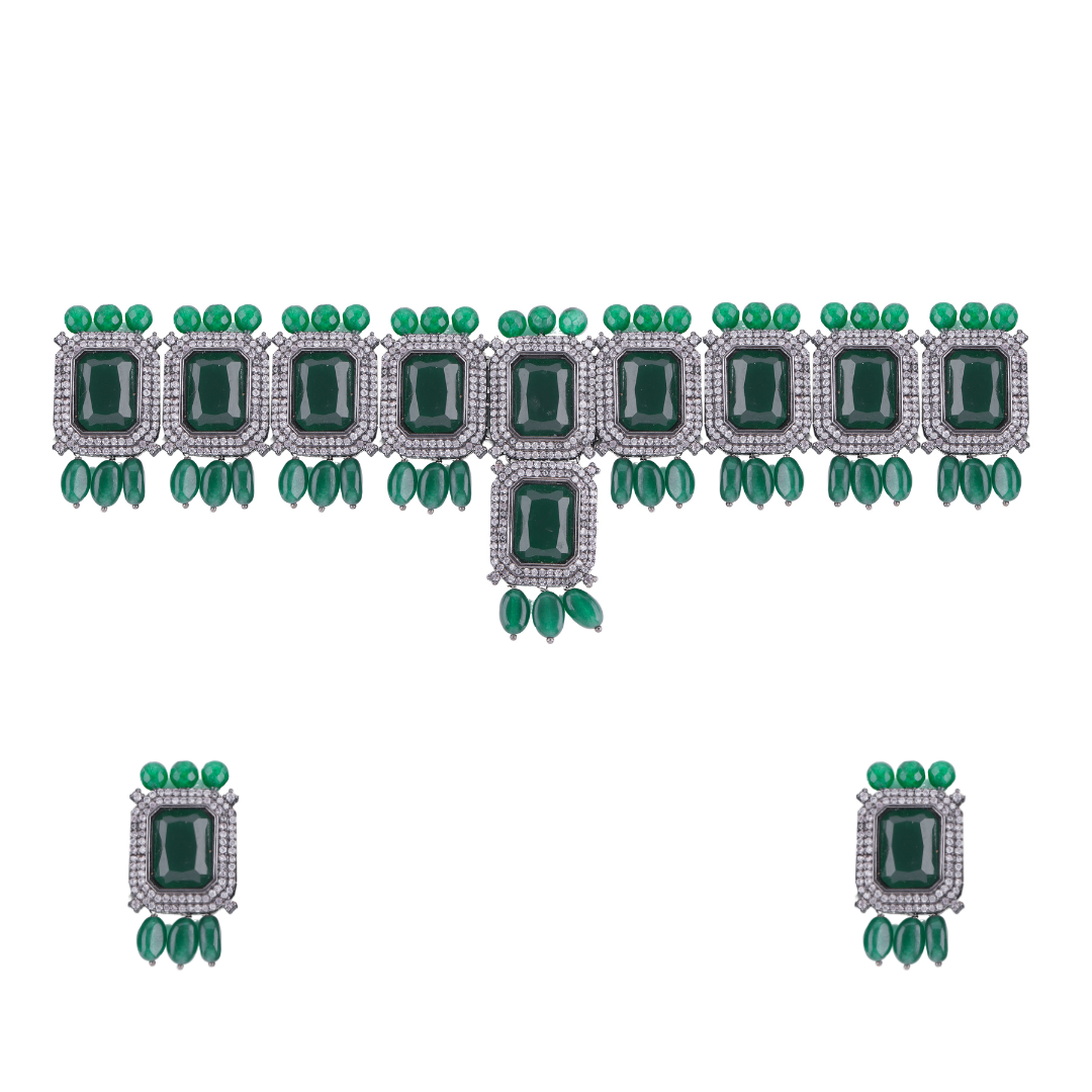 Crafted with care and precision, the Green Doublet Stone Choker Set is made with high-quality materials to ensure durability and longevity. The black silver-tone finish adds a touch of sophistication, while the green doublet stone brings a refreshing pop of color to your ensemble. Whether you're attending a special occasion, a night out, or simply want to enhance your everyday style, this choker set is the perfect choice.