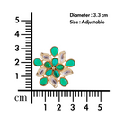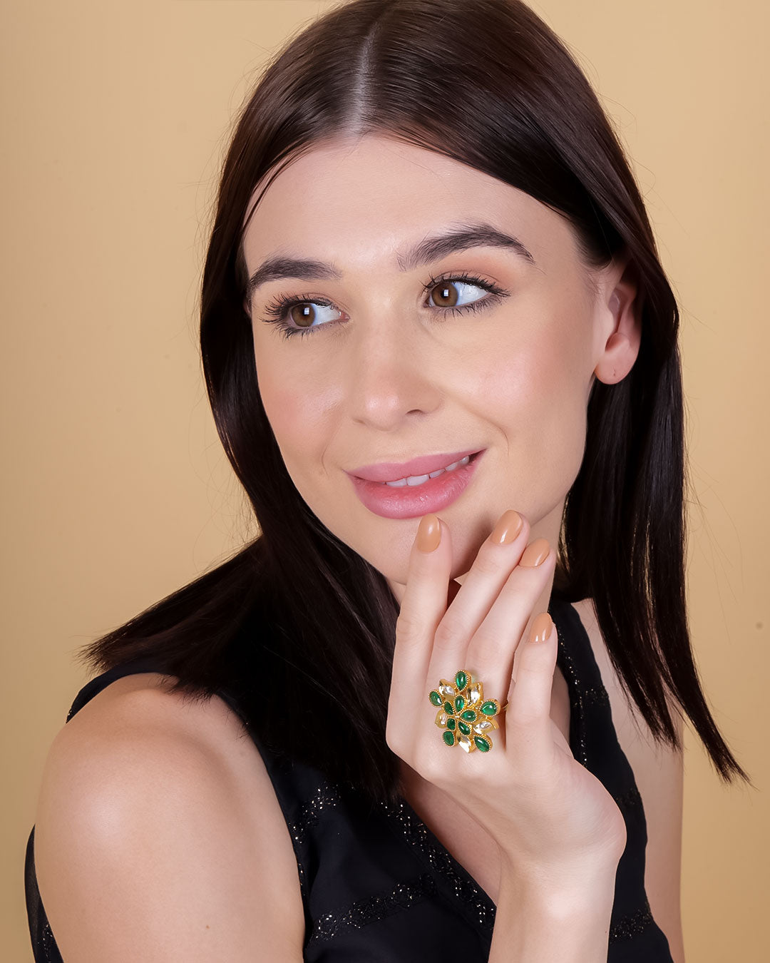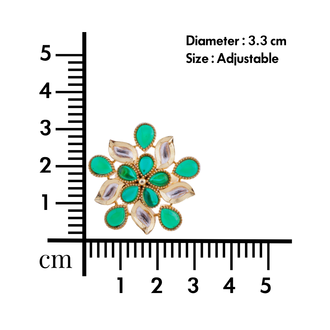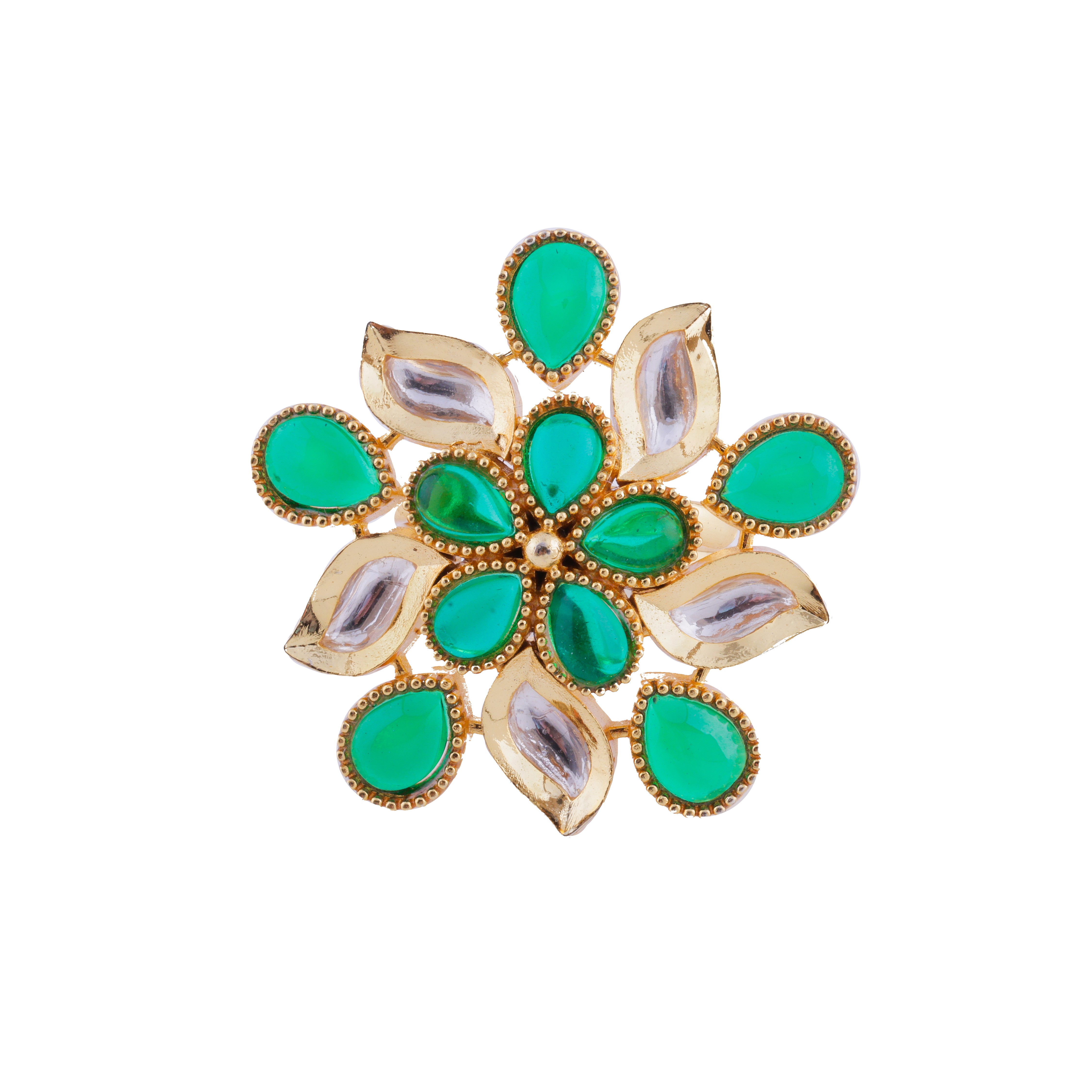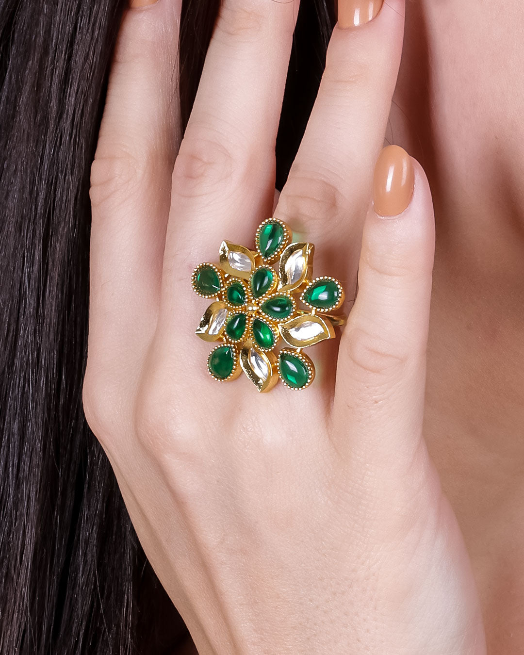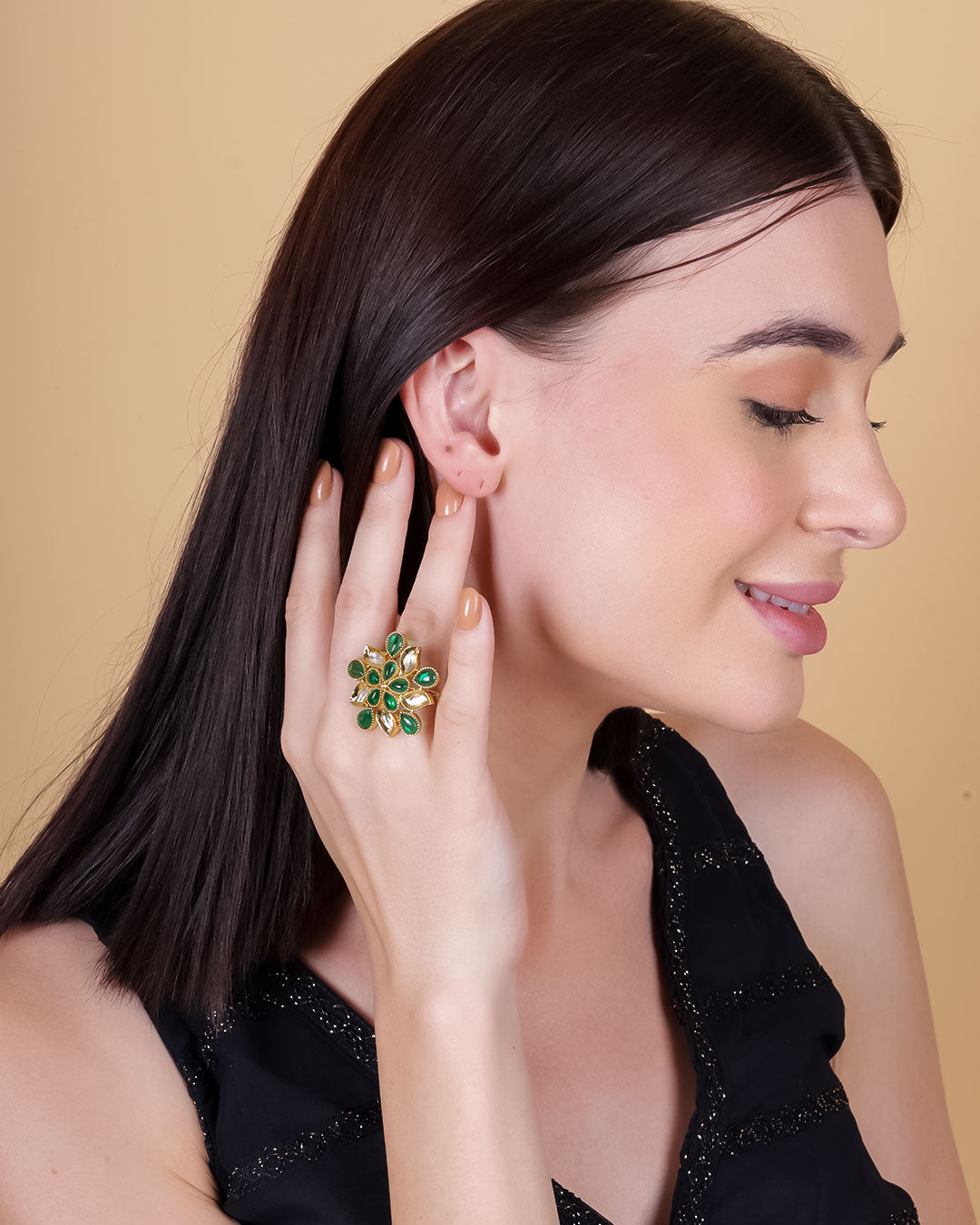 The ring showcases a captivating green stone at its centre, radiating a mesmerising hue that symbolises growth, renewal, and prosperity. The vibrant green colour is complemented by the intricate gold-plated Kundan setting, adding a touch of opulence and grandeur.