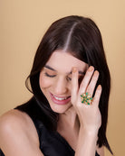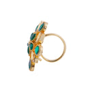 The gold-plated band of the ring adds a touch of regal elegance, enhancing the overall aesthetic appeal. The polished surface reflects light, creating a radiant glow that accentuates the beauty of the green stone. The band is designed for comfort and durability, ensuring a perfect fit that can be enjoyed for years to come.