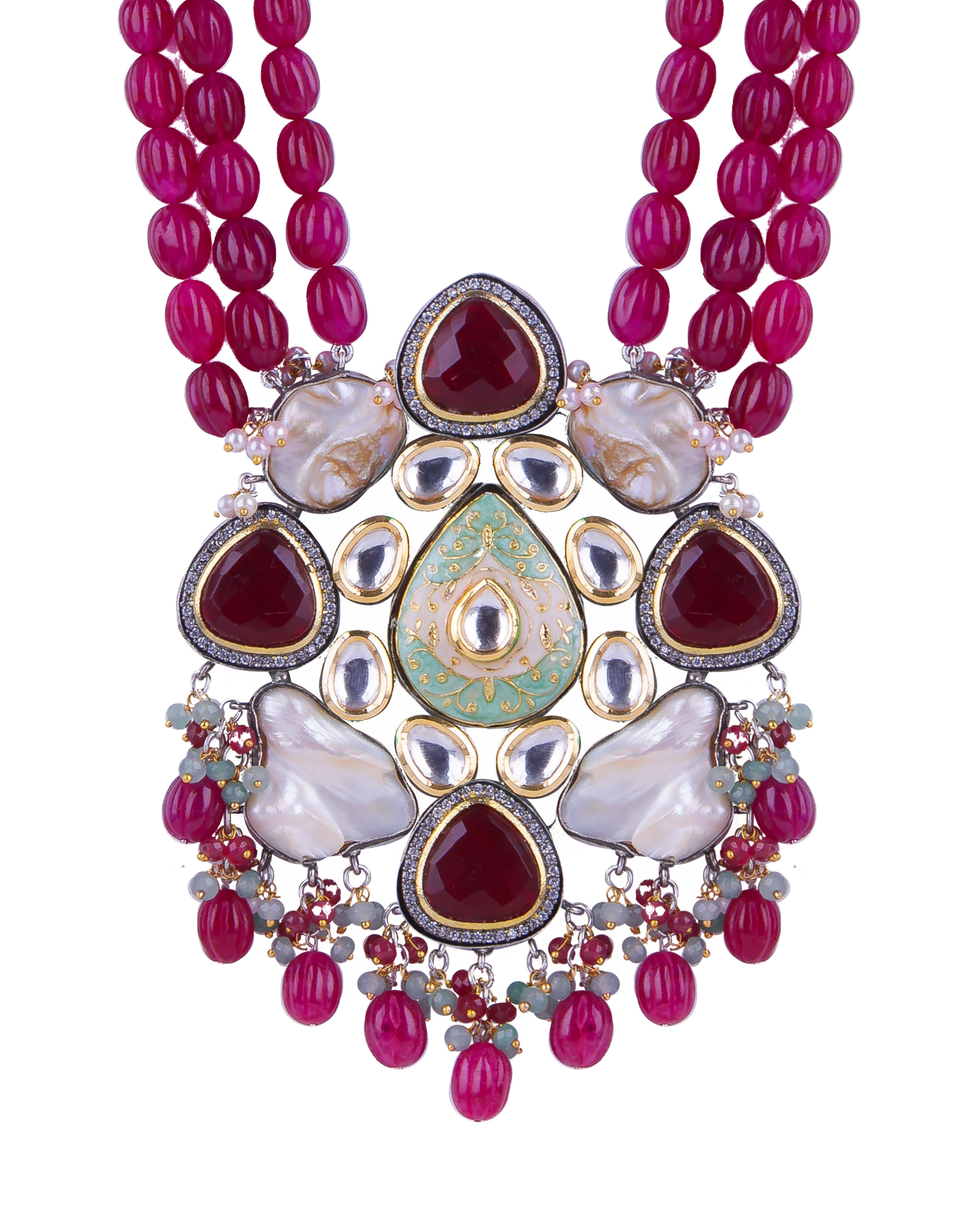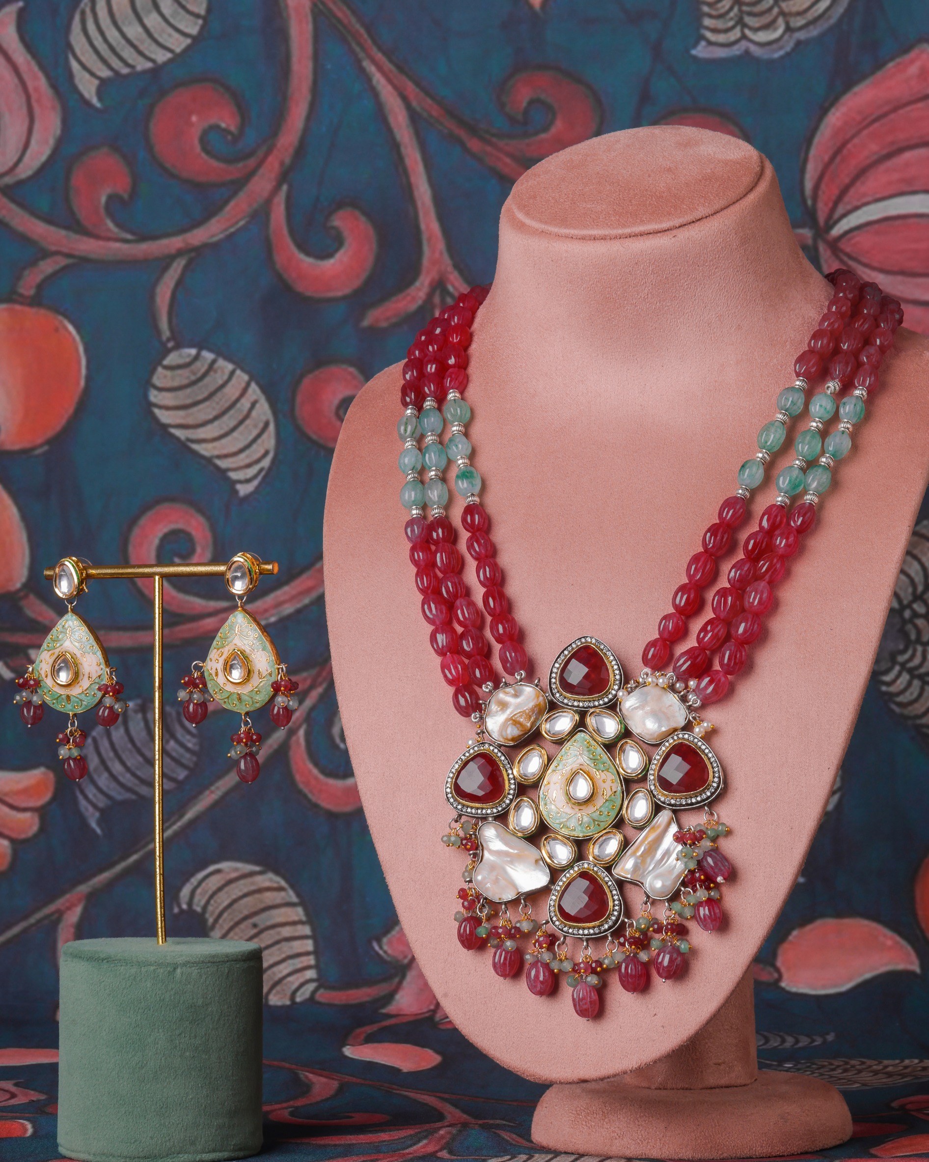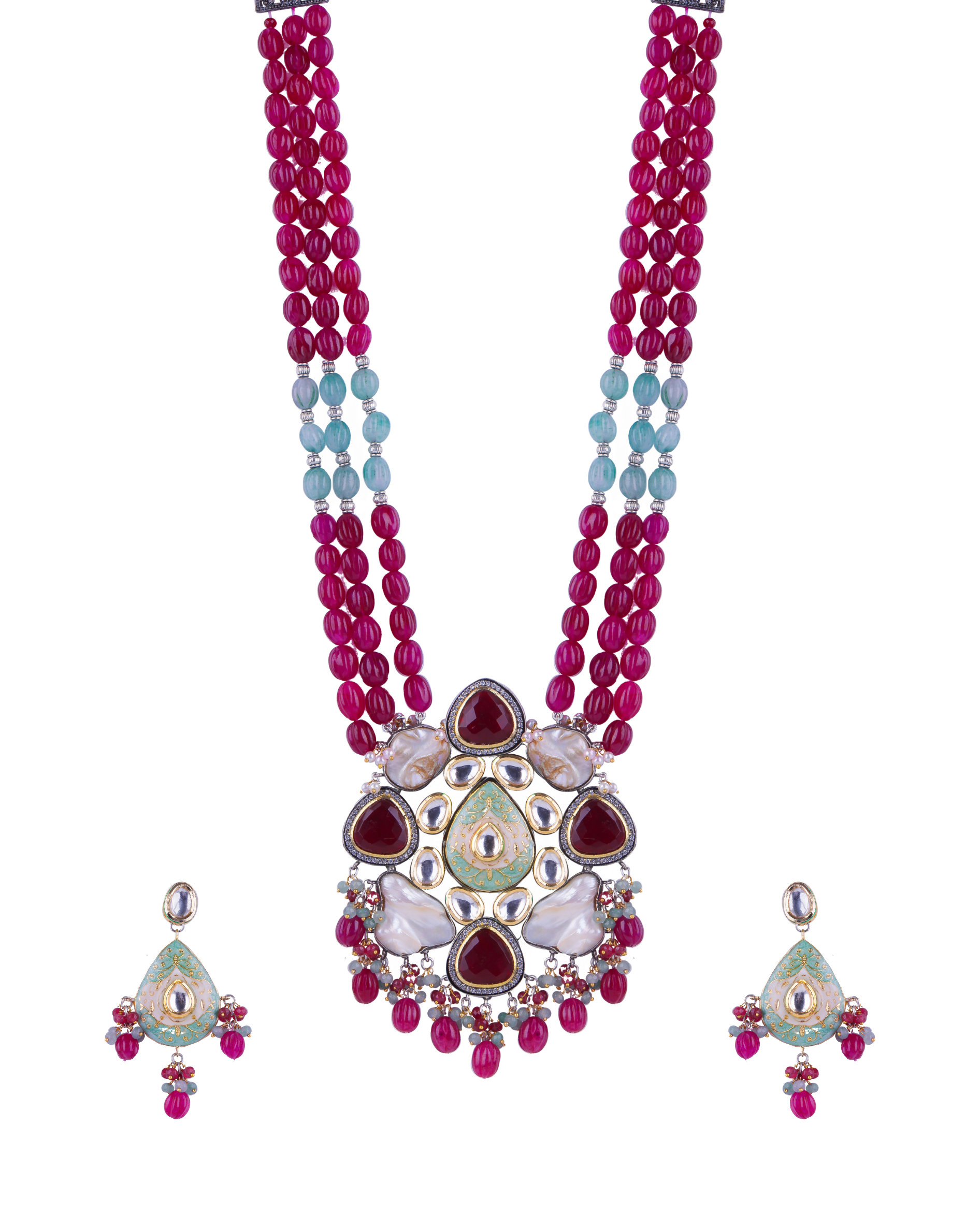 Maroon Stone & Pearl Pendant Long Necklace Set