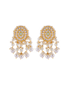 Completing the set are matching earrings that perfectly complement the choker necklace. The earrings mirror the design of the choker, featuring Kundan stones and pearls that sway delicately with your every movement. They frame your face with elegance and grace, accentuating your natural beauty and adding a touch of regal sophistication.