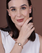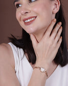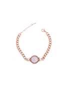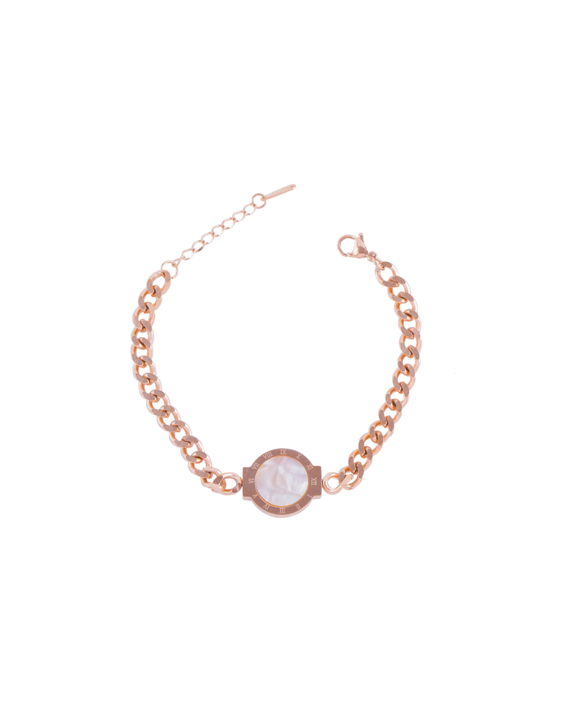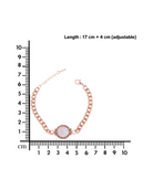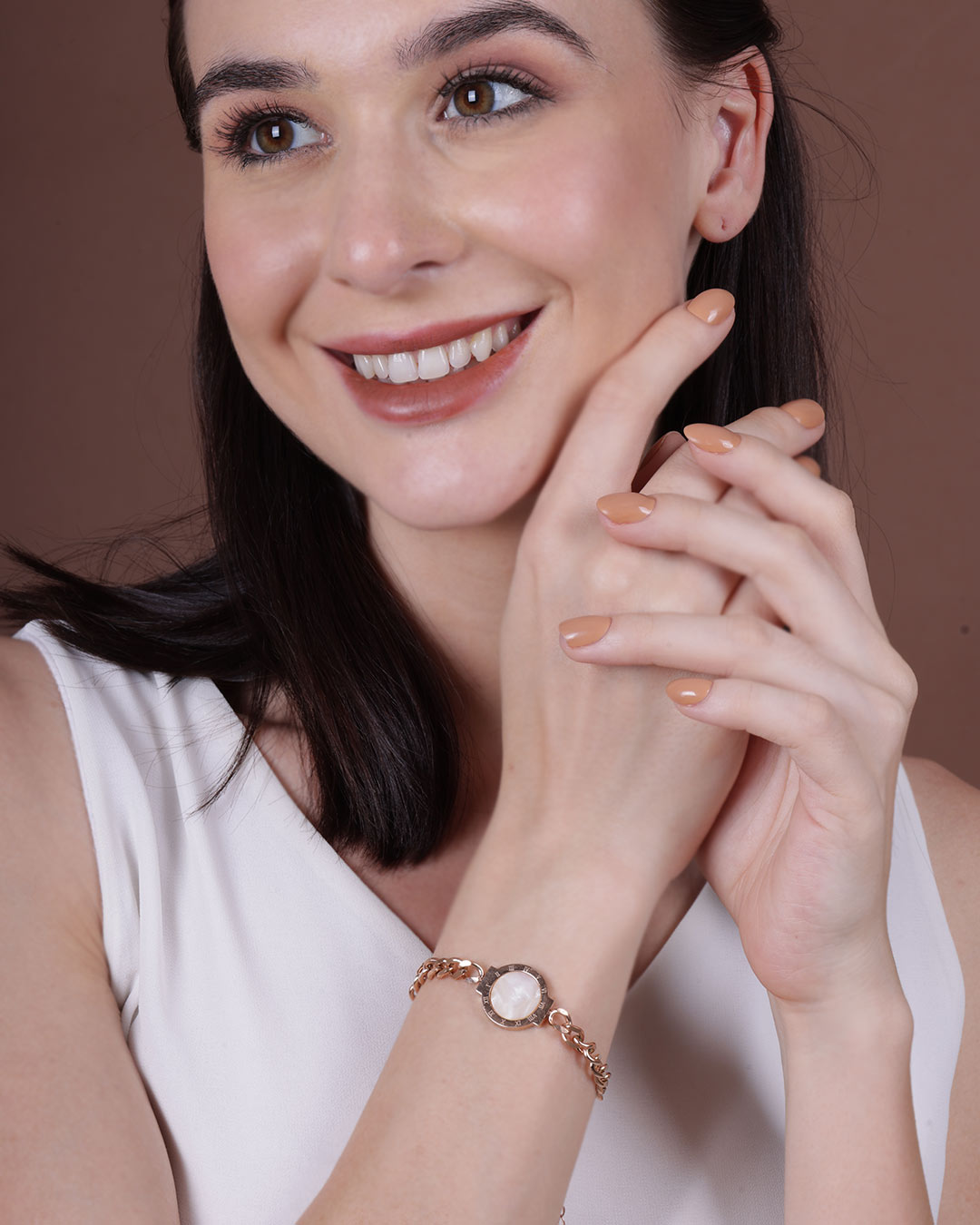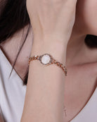 This elegant pearl chain bracelet features a delicate design with a warm rose gold finish. The bracelet is adorned with a lustrous round pearl at the center, adding a touch of classic sophistication. The soft gleam of the rose gold chain complements the pearl's natural shine, creating a timeless and versatile piece of jewelry that can be worn for any occasion. Its refined, minimalist style makes it a perfect accessory for both everyday wear and special events.