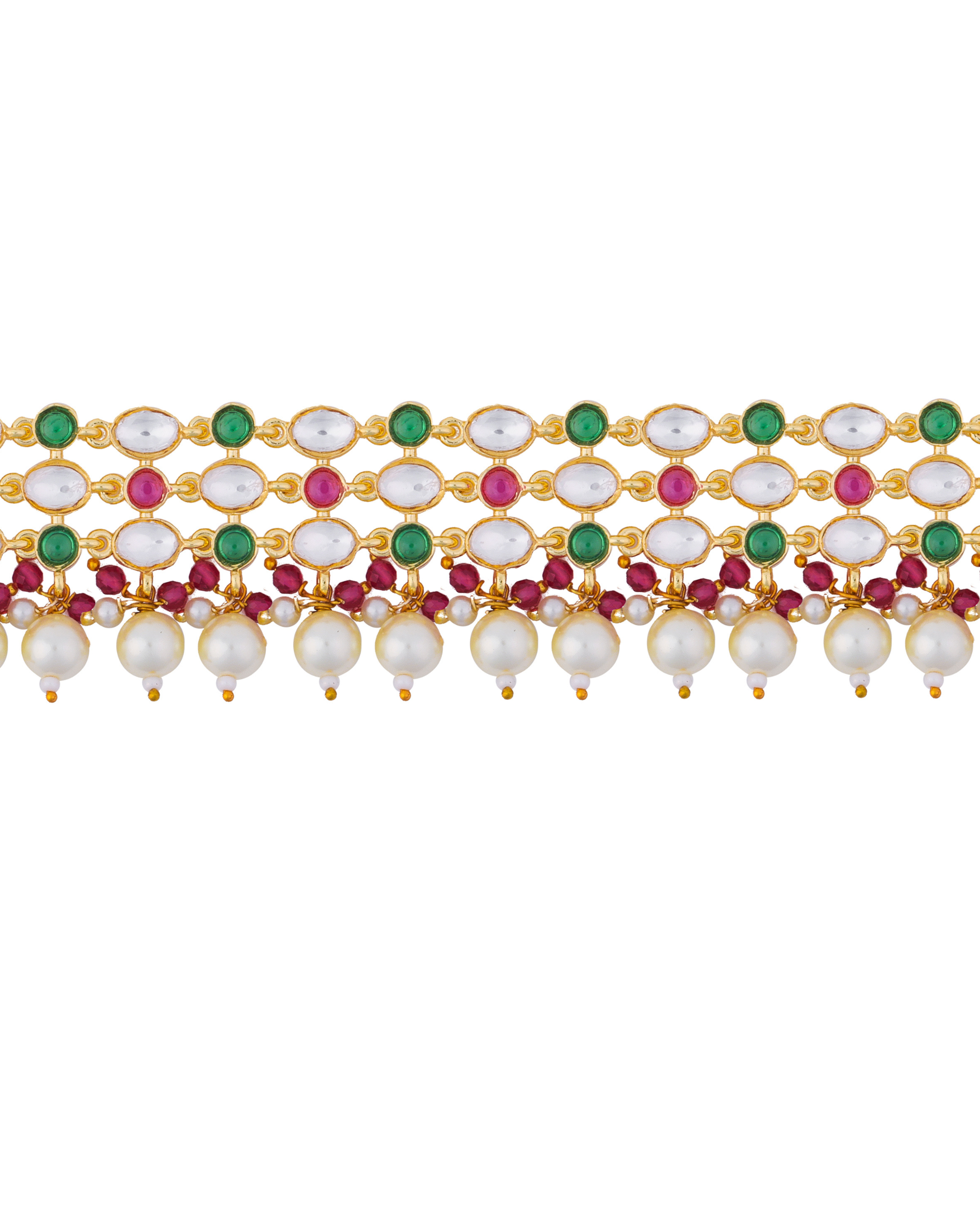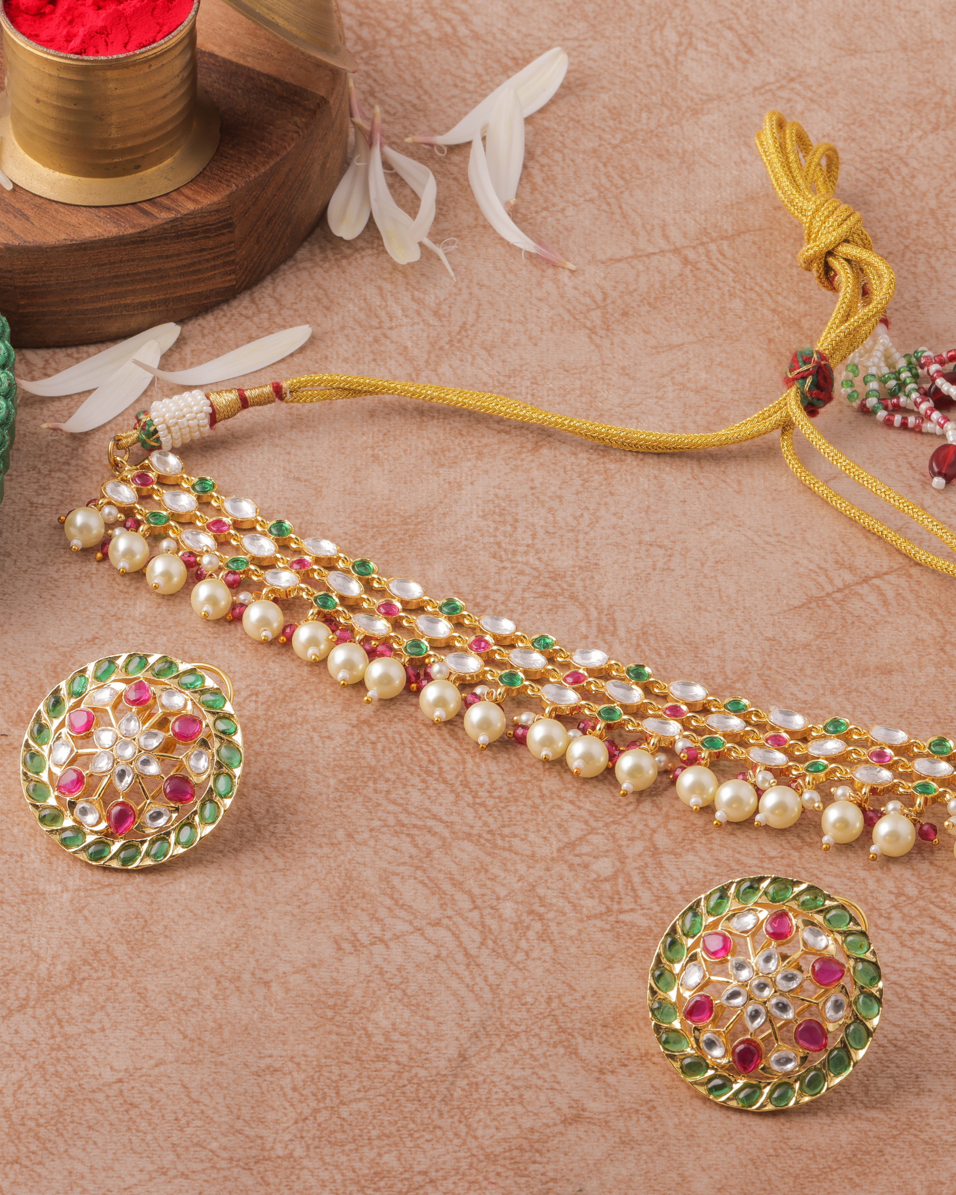 Embrace the splendor of traditional craftsmanship with our Multi-stone Kundan Choker Necklace Set. This exquisite choker is a perfect blend of heritage and contemporary elegance, featuring an array of radiant Kundan stones that are meticulously placed to create a breathtaking design.