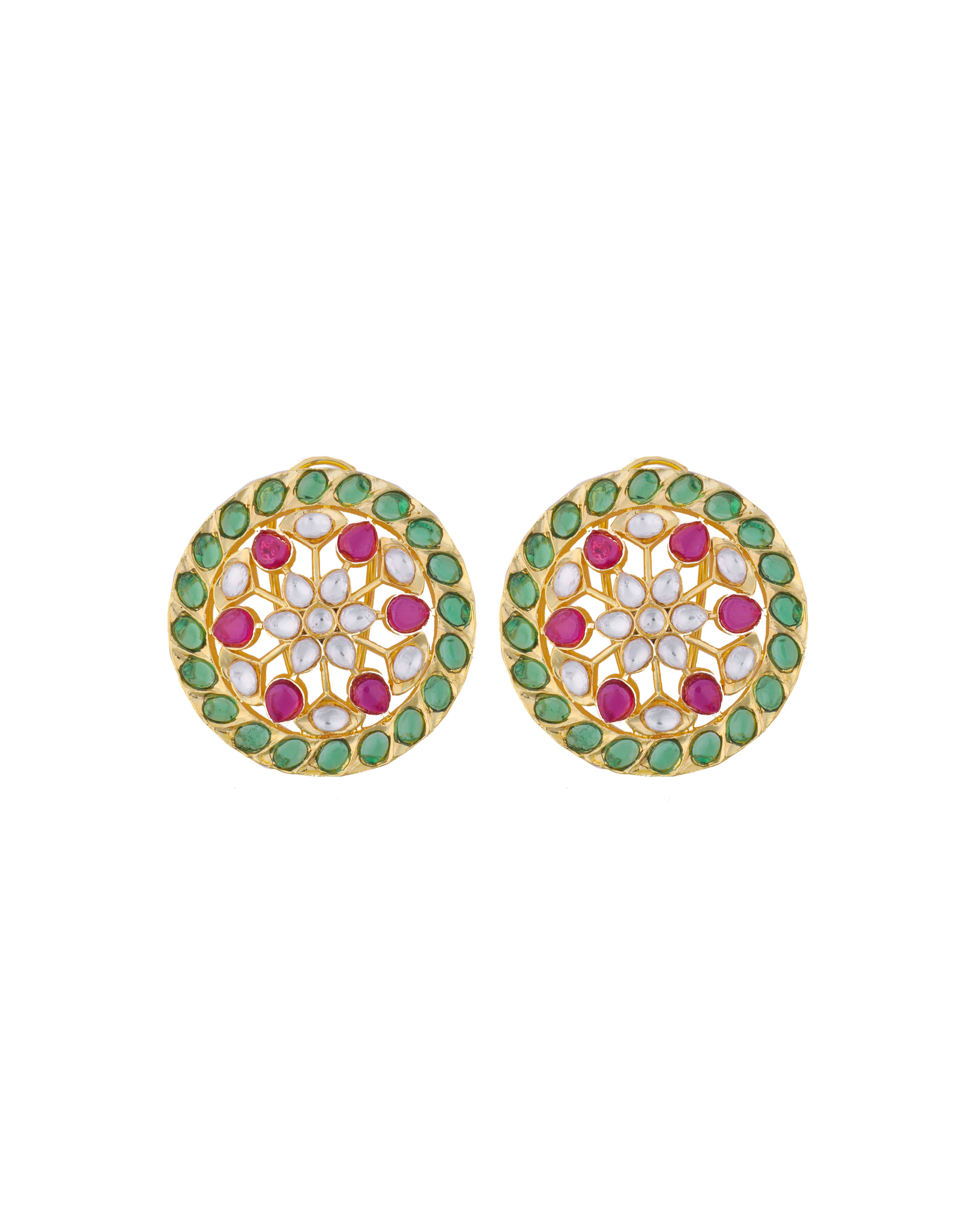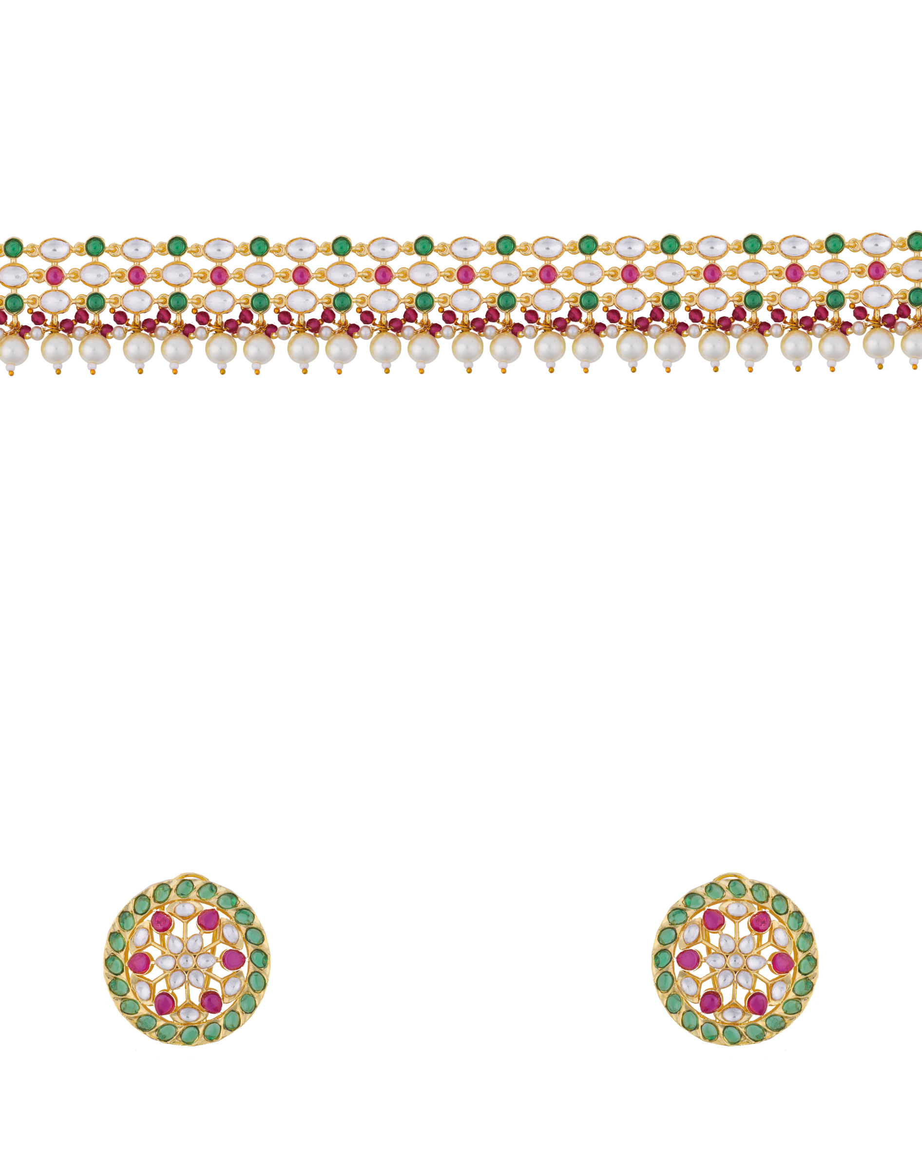 The choker sits elegantly around the neck, with each stone reflecting light to create a captivating sparkle. The intricate arrangement of multi-colored stones adds a vibrant touch, making it a versatile piece that can be paired with a wide range of outfits, from traditional sarees to modern fusion wear. Whether it’s a grand wedding or a festive celebration, this necklace set will ensure you stand out with unmatched grace.