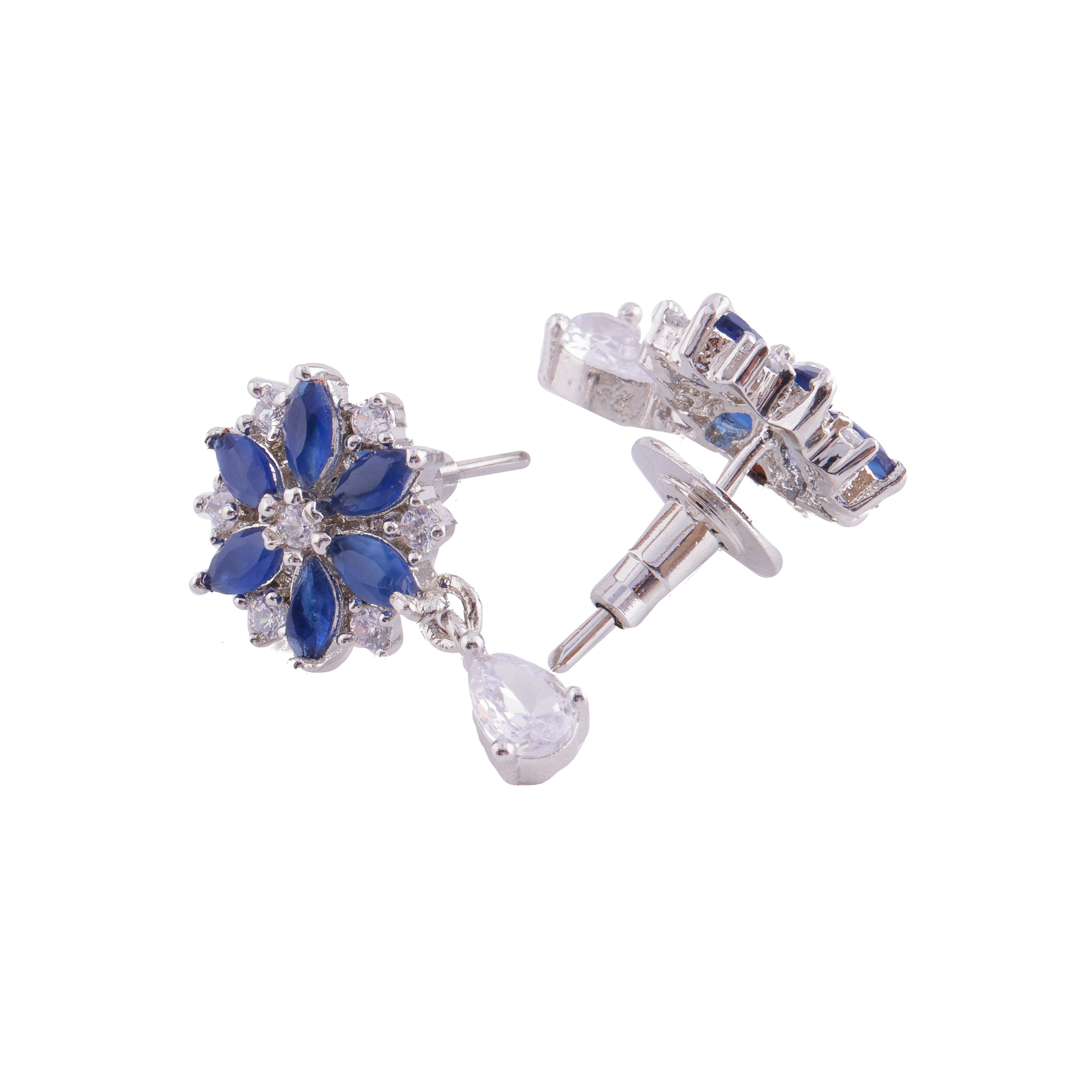 Completing the set are matching earrings that mirror the design of the pendant. The blue stone is delicately showcased in each earring, creating a harmonious and coordinated look. The earrings add a touch of glamour to your overall ensemble, making them an essential accessory for any special occasion or event.