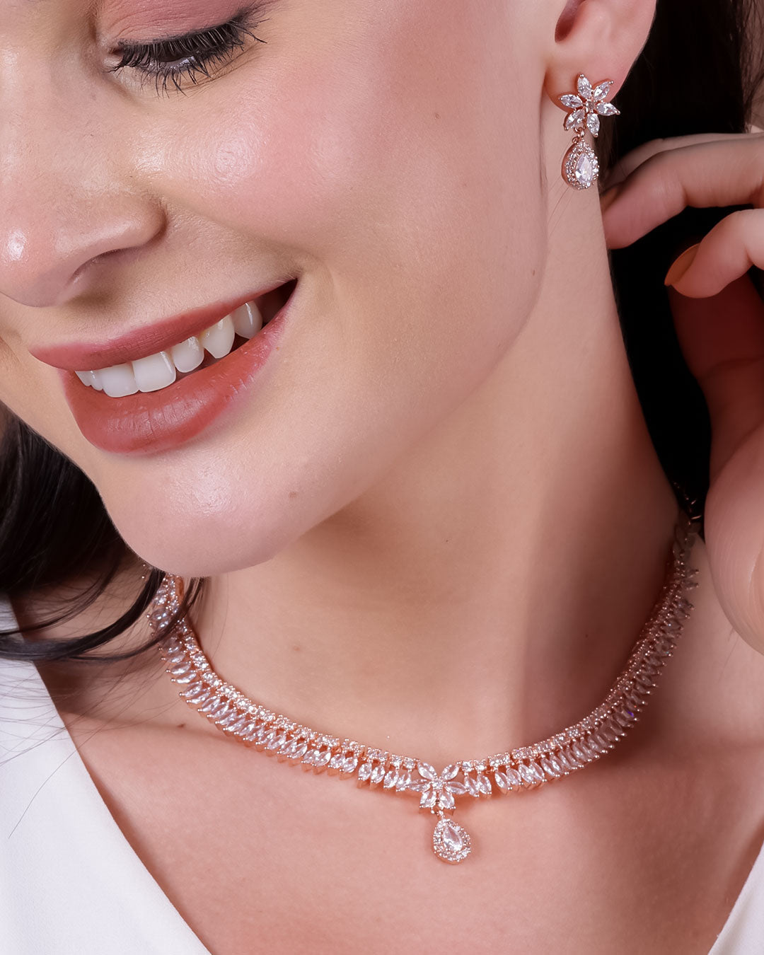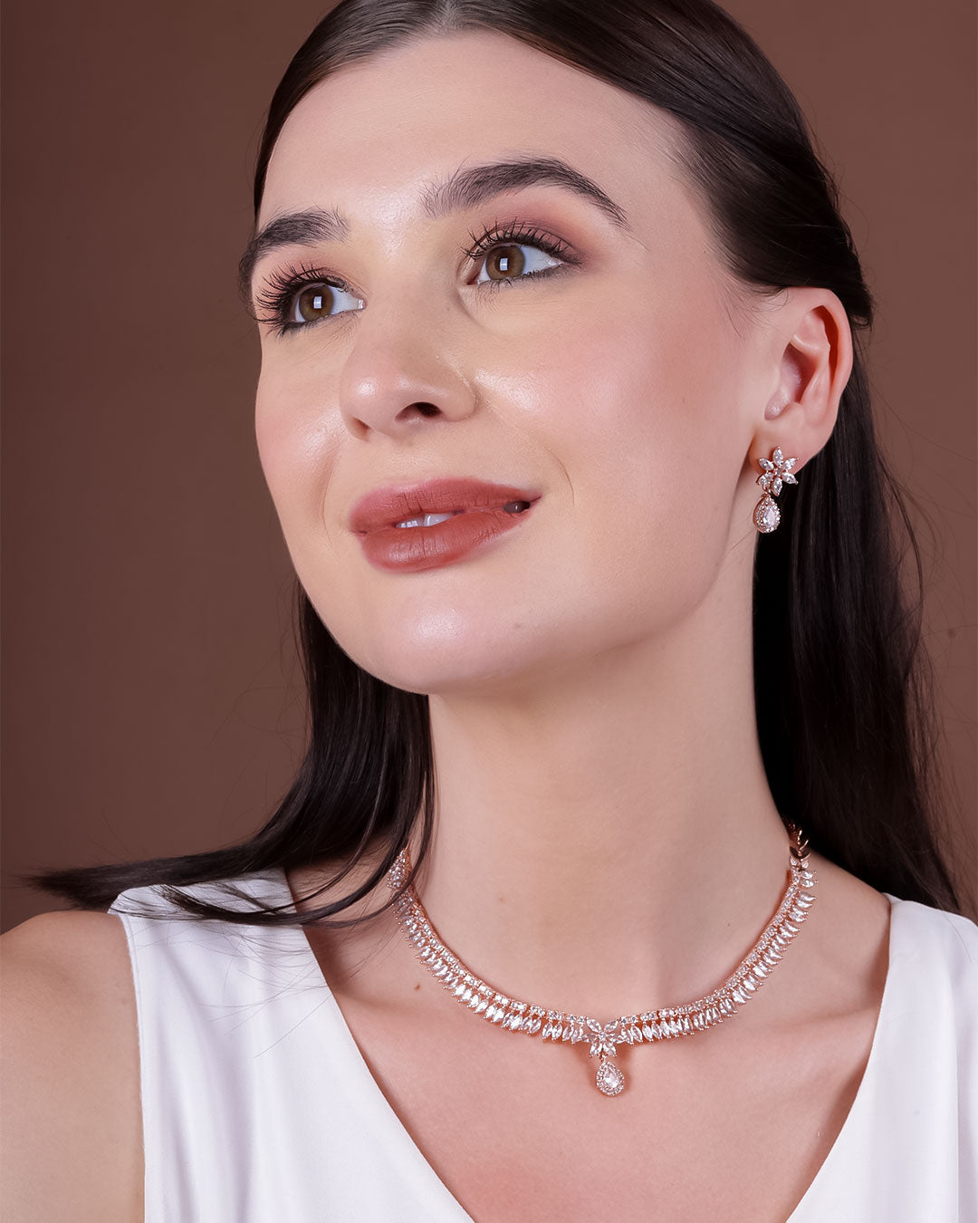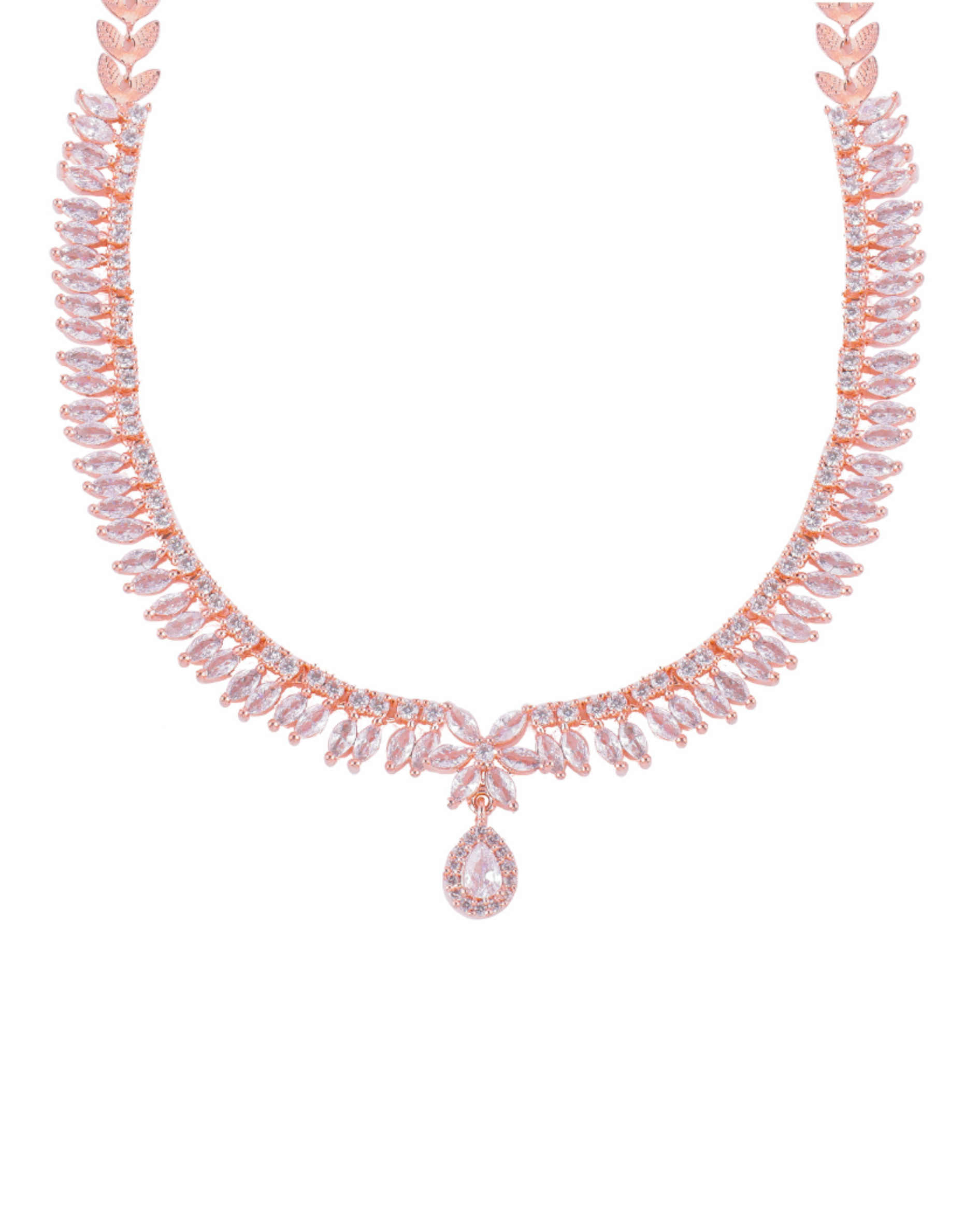 Whether you're attending a formal event, a romantic dinner, or simply want to add a touch of elegance to your everyday attire, the Naisha Rose Gold Drop Necklace Set is the perfect choice. Embrace your individuality and let this exquisite set enhance your natural beauty.