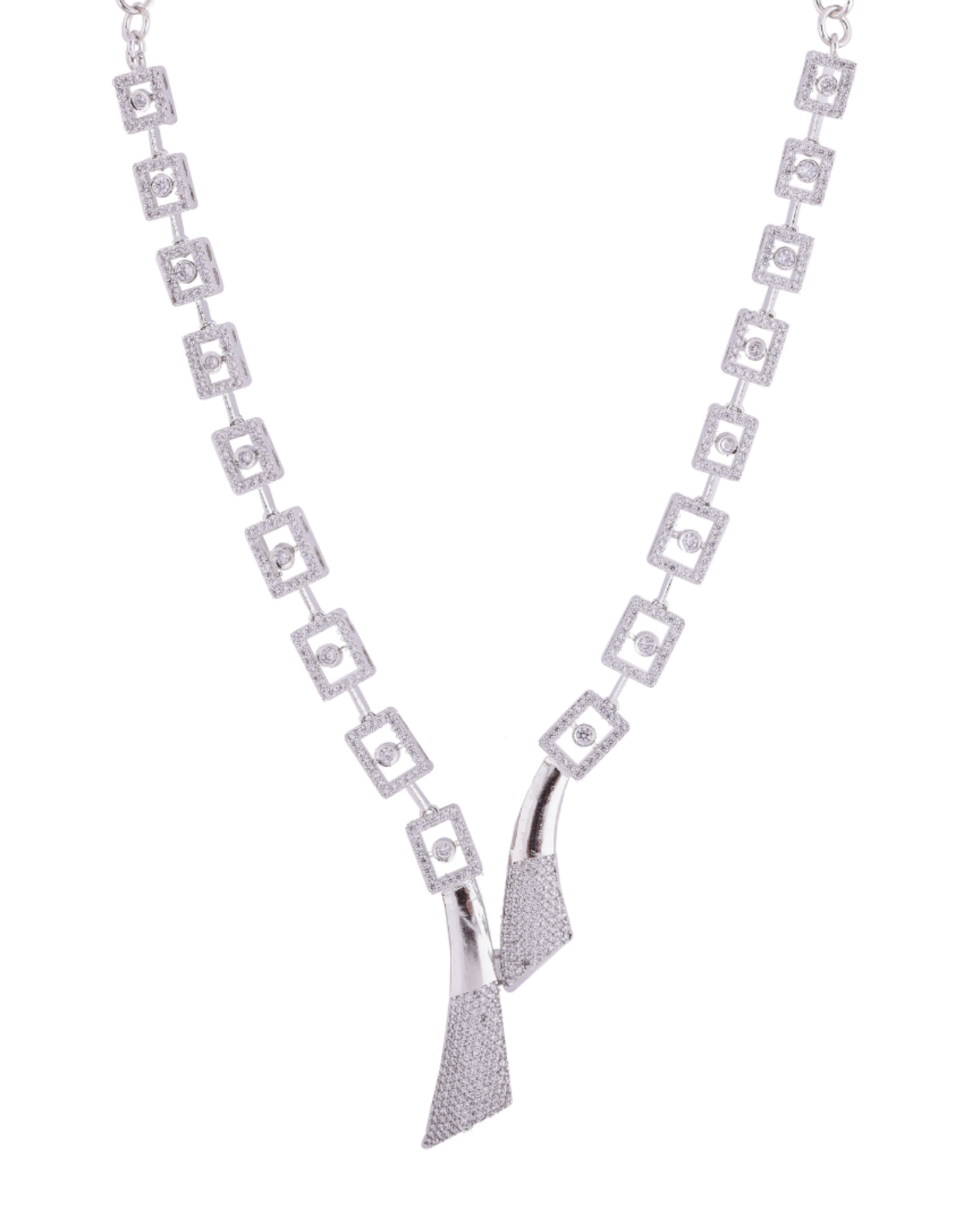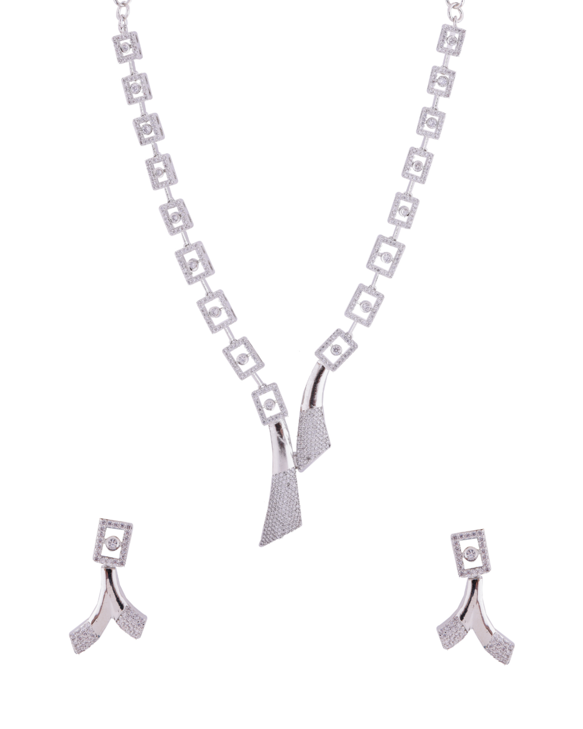 At the heart of this necklace set is the intricately designed pendant, which showcases a fusion of modern and traditional elements. The silver pendant is adorned with intricate detailing and sparkling crystals, creating a captivating focal point that effortlessly catches the light and draws attention.