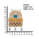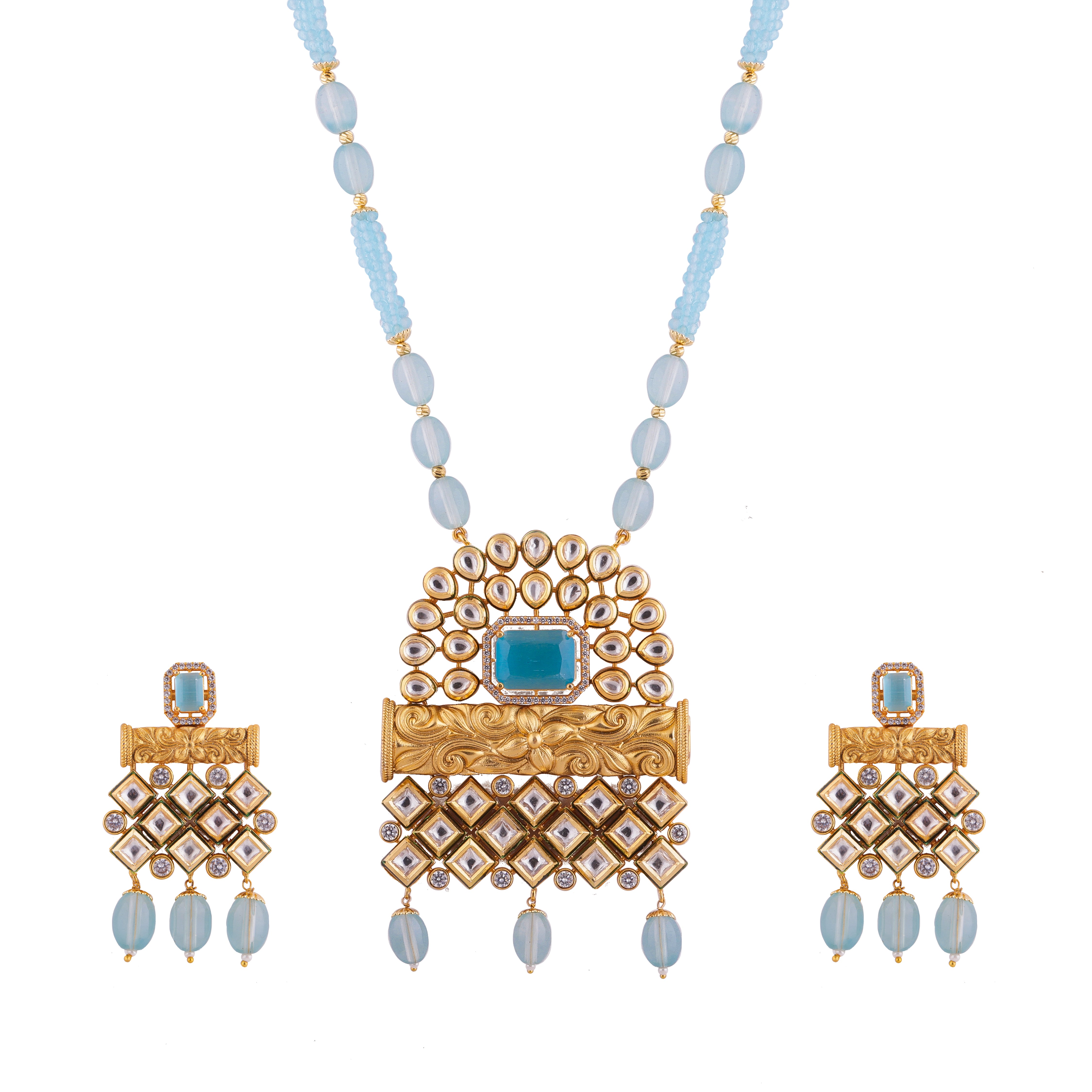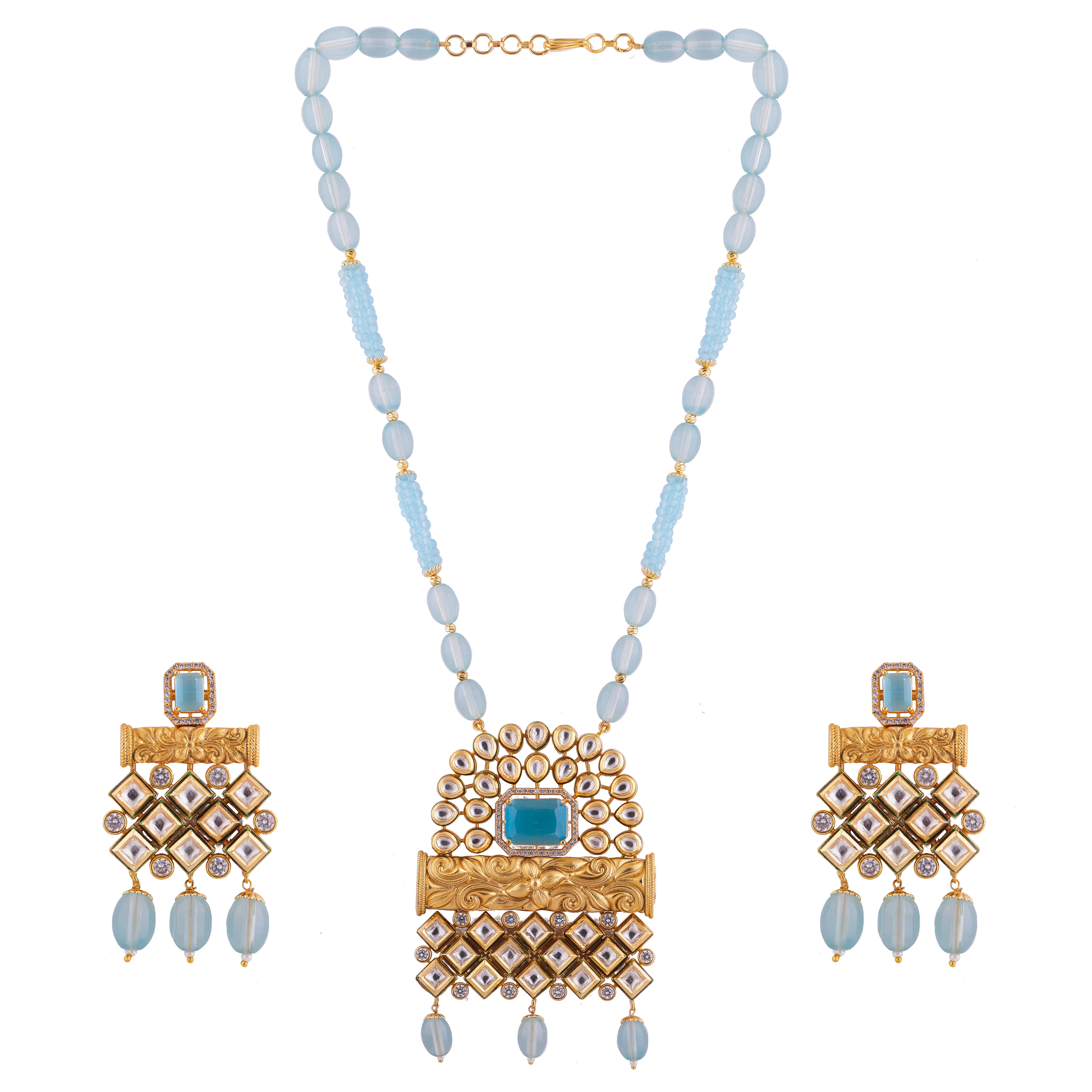 The centre piece of this pendant set is the exquisite pastel blue stone, chosen for its serene beauty and captivating hue. The stone is meticulously crafted and surrounded by intricate Kundan work, showcasing the artistry and craftsmanship that goes into every detail. The delicate placement of Kundan stones adds a touch of opulence and enhances the overall allure of the pendant.