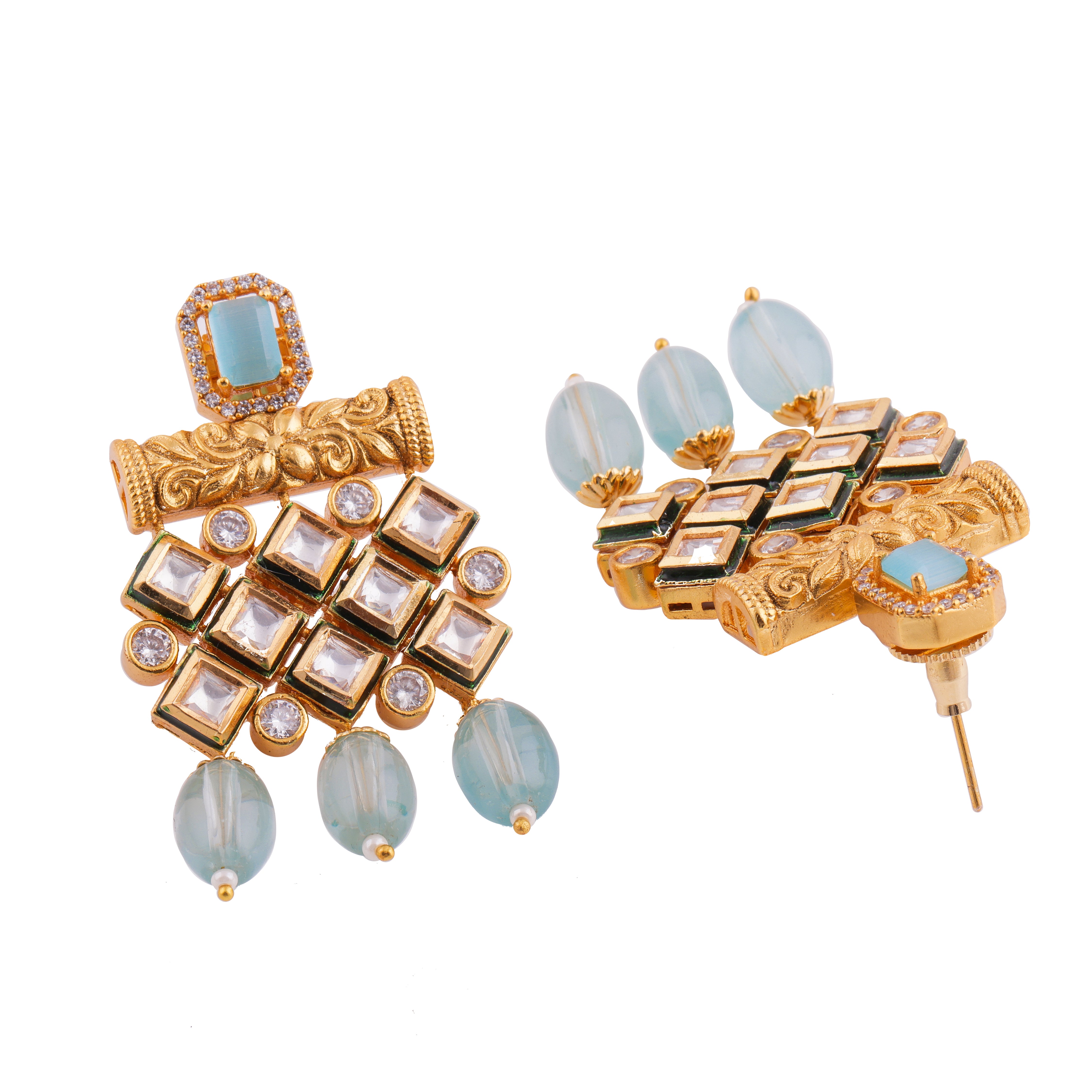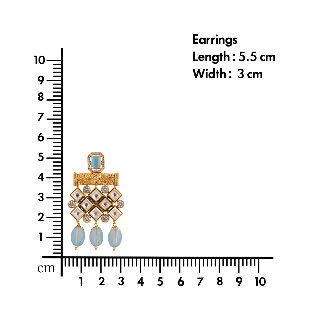Completing the set are matching earrings that mirror the elegance and design of the pendant. The delicate drops feature the same pastel blue stone and Kundan work, perfectly complementing the necklace and adding a touch of sophistication to your ensemble.