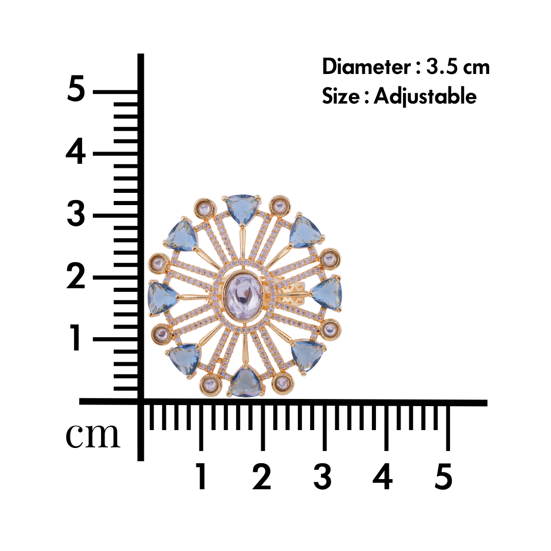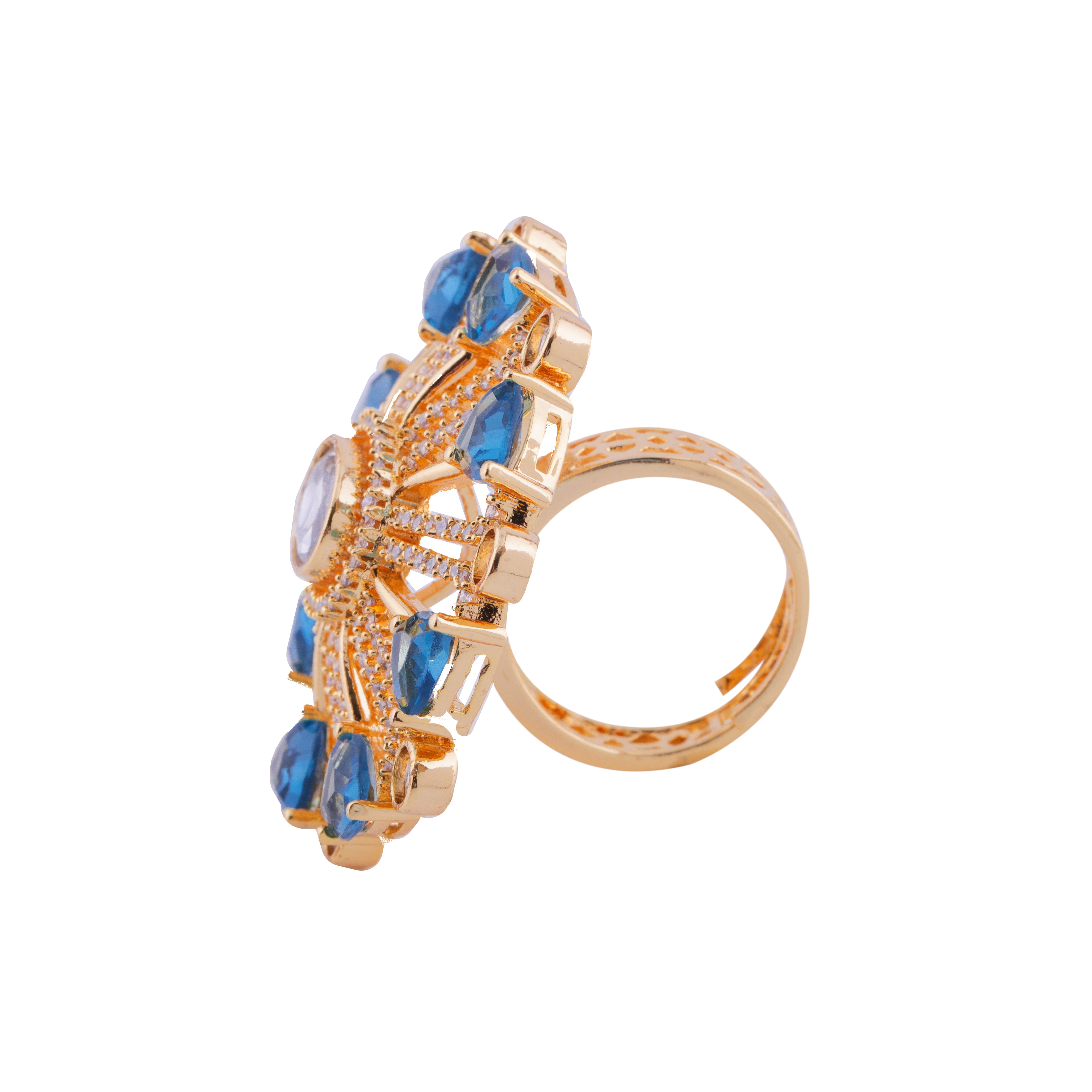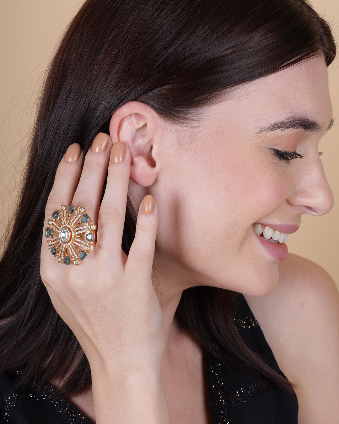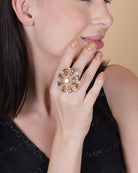 Crafted with meticulous attention to detail, this ring features a delicate gold-plated band that exudes a luxurious and radiant glow. The intricate Kundan work adorning the ring showcases the mastery of skilled artisans, with each stone meticulously set to create a stunning display of craftsmanship.