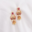 Add a touch of vibrant tradition with these gold jhumkas which comes in a peacock-designed with pink and green stones work. An elaborate design with the addition of a floral stud and complemented with dainty clusters of pearls drops for a touch of sophistication. Heavy quality crafted in a metal brass based alloy with 18k gold plating and specially selected semi-precious stones. A great quote for weddings, festivals and parties.