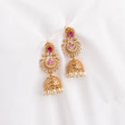 Celebrate tradition with these golden jhumkas, featuring a vibrant pink teardrop stone and intricate temple-inspired patterns. The intricate filigree work and delicate bead drops offer up a festive look that feels classic but elegant. Made of brass alloy and 18K Gold plated with hand-picked Semi-precious stones. The most ideal addition to weddings, gatherings and timeless traditional attire.