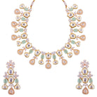 Elevate your style with the Radhika Kundan Pastel Green Stone Necklace Set and experience the allure of traditional Indian jewelry. Let its exquisite design and captivating beauty become a reflection of your unique personality and enhance your every look with a touch of sophistication.