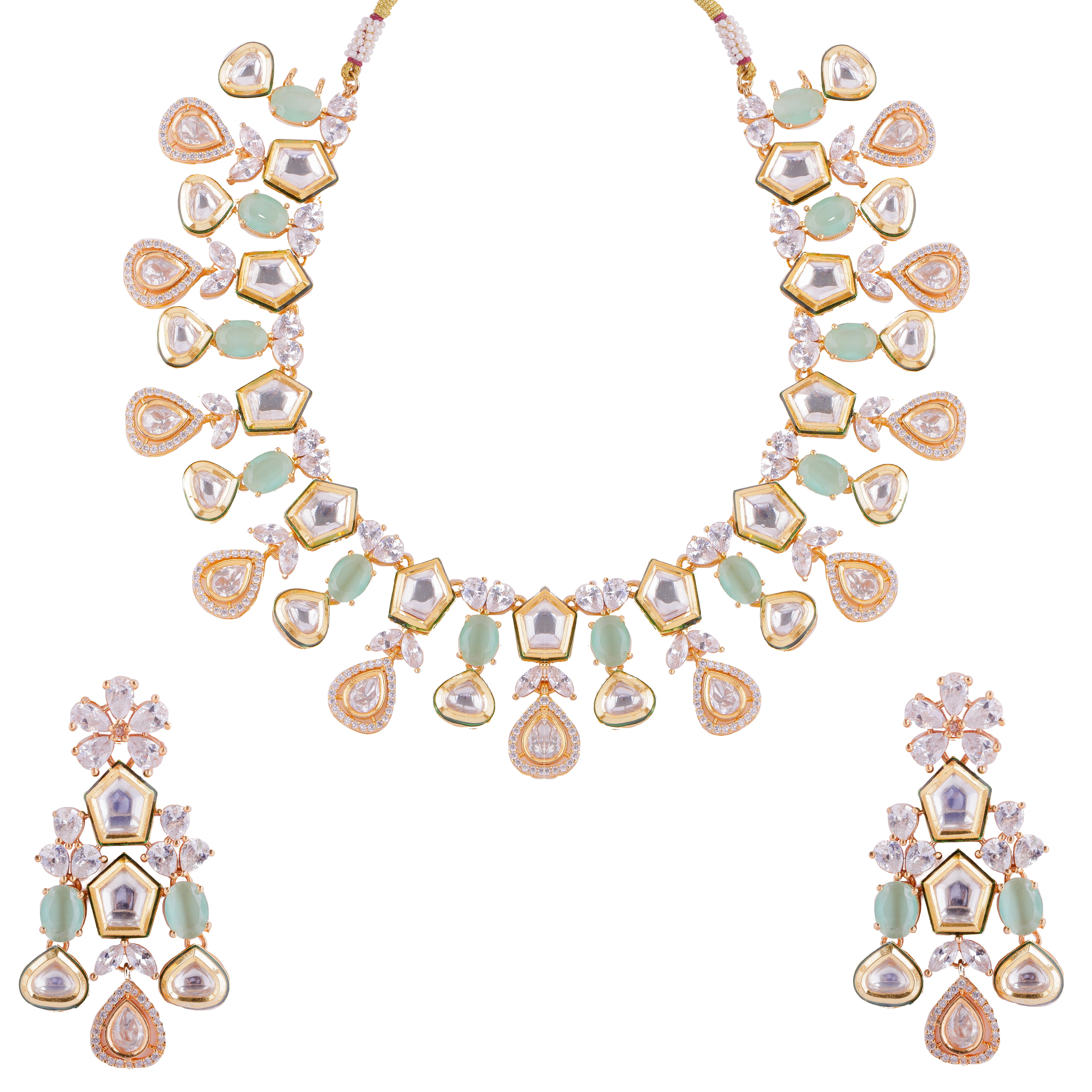 Introducing the Radhika Kundan Pastel Green Stone Necklace Set, a mesmerizing piece of jewelry that exudes elegance and grace. This exquisite set is designed to elevate your style and captivate attention with its stunning beauty.