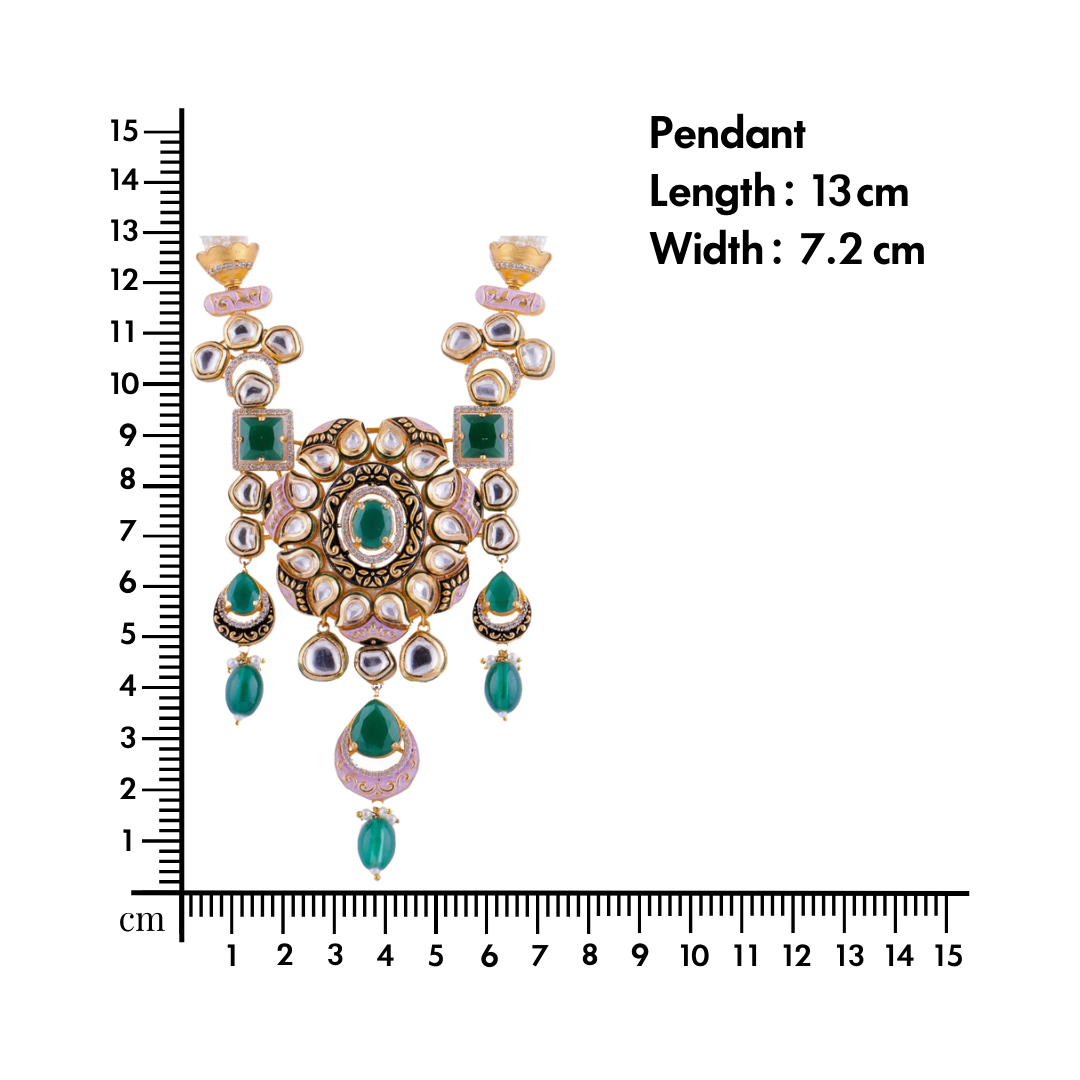 The pendant showcases a stunning antique-inspired design, meticulously crafted with intricate Meenakari work. The rich and vibrant enamel detailing brings life to the intricate patterns, creating a captivating fusion of colours. Adorned with dazzling Kundan stones, the pendant exudes a regal charm and adds a touch of opulence to any ensemble.
