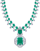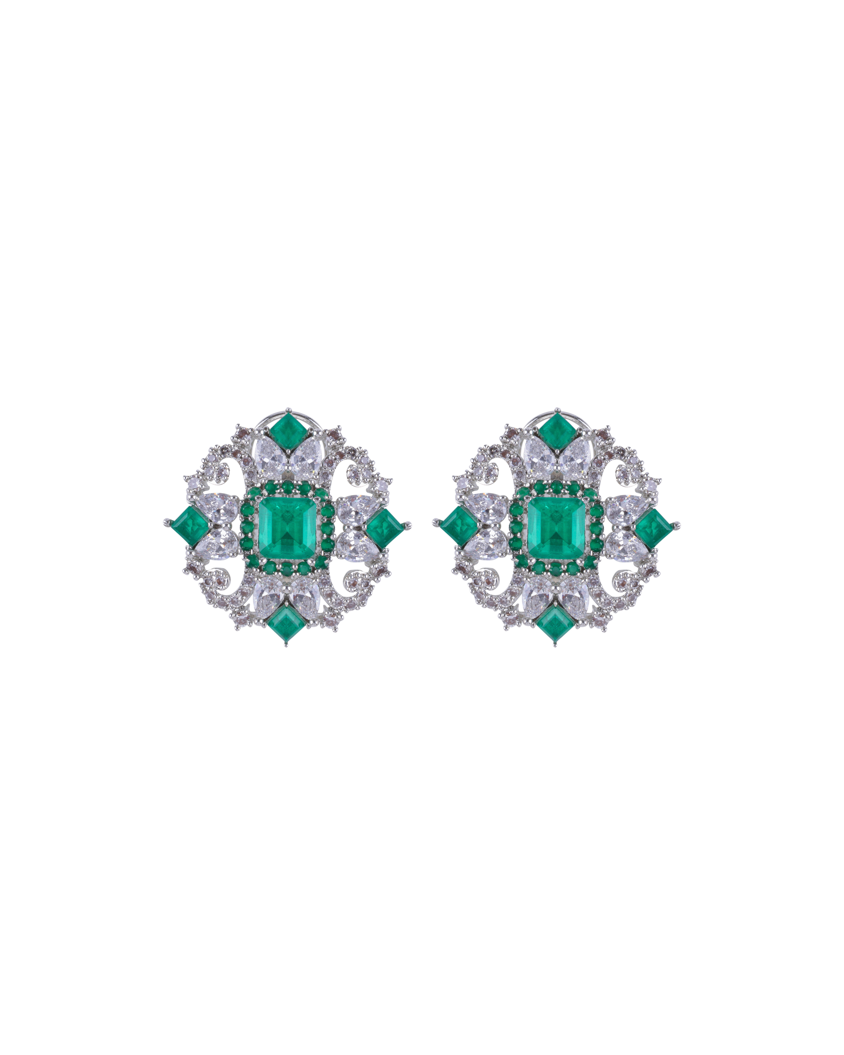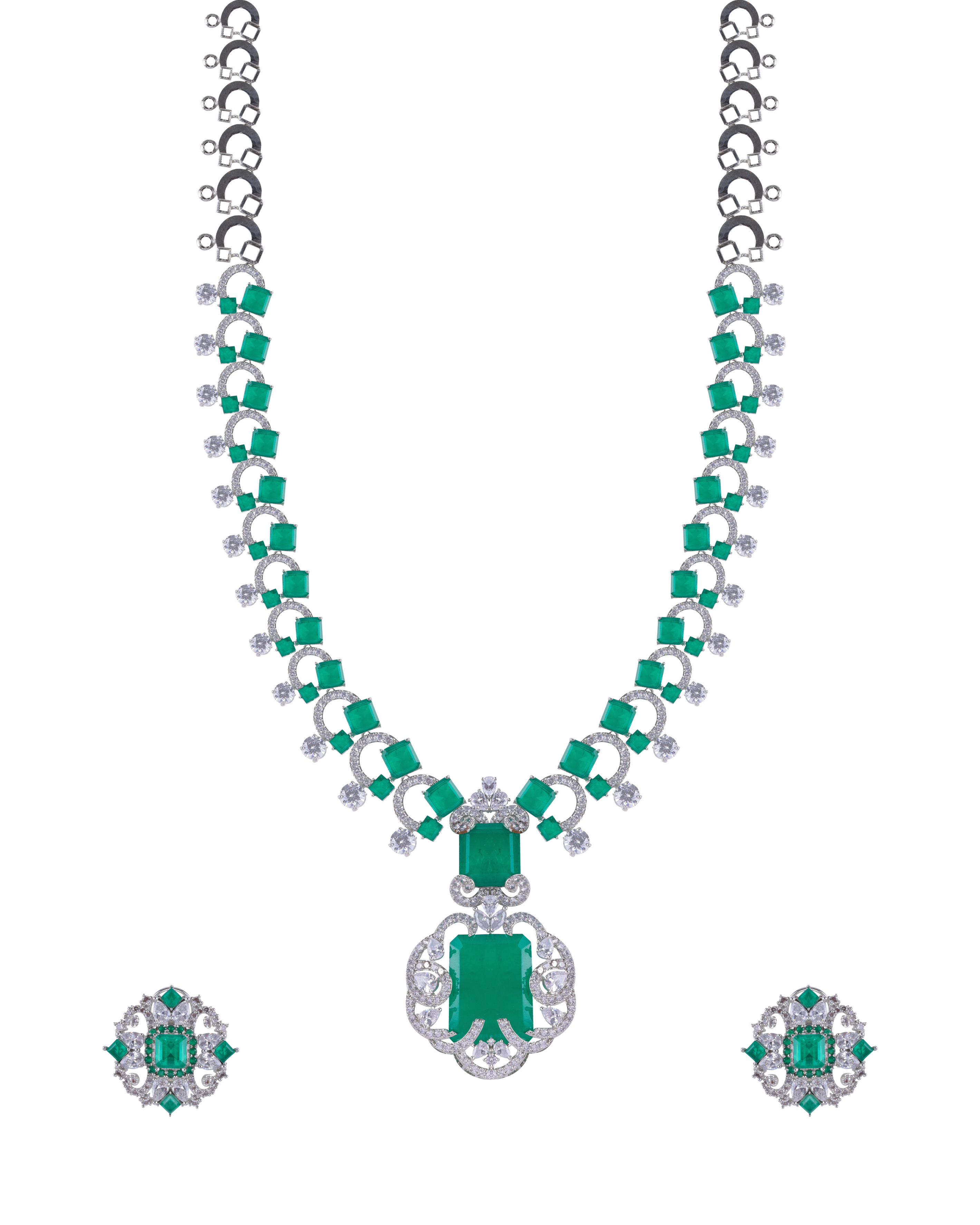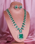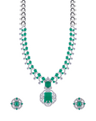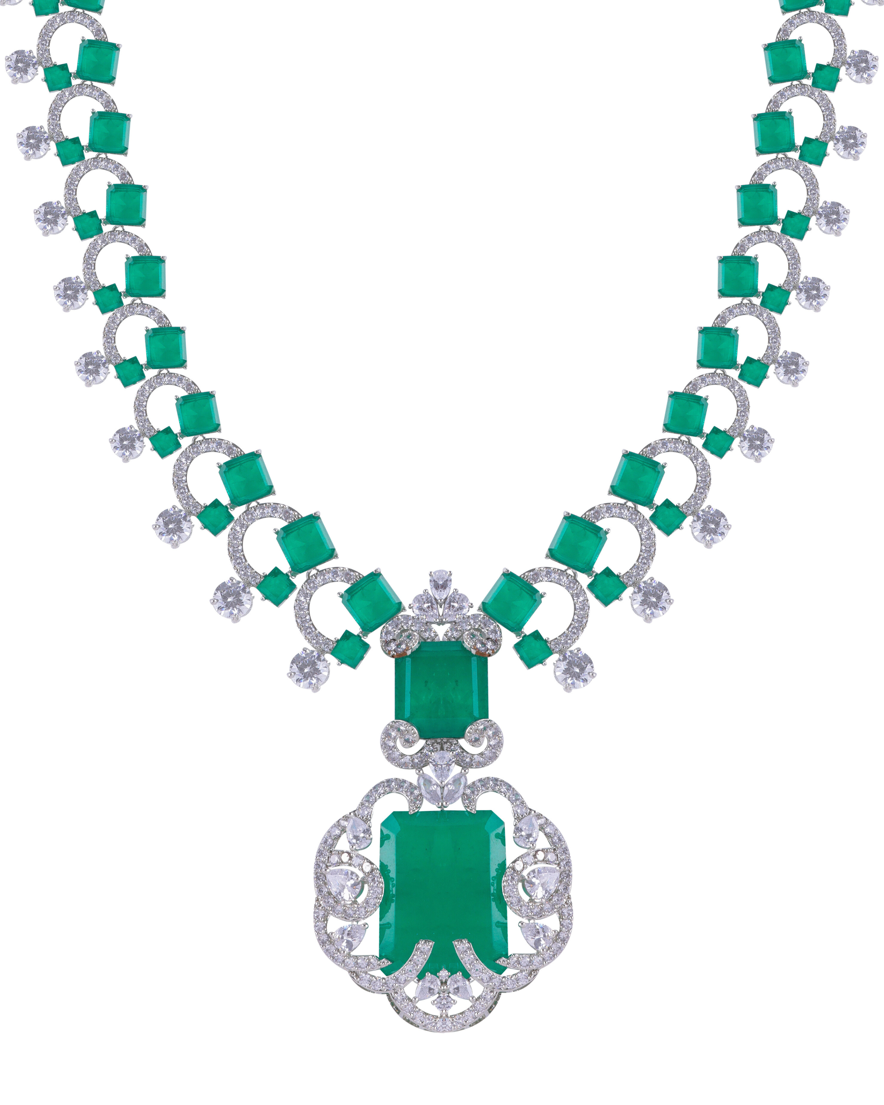 Discover the opulence of our Regal Emerald Cascade Necklace Set. Featuring rich green emeralds and sparkling diamond-like accents, this luxurious set includes a stunning necklace and matching earrings, perfect for brides and special occasions.