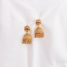 Traditional charm meets royal elegance in these golden jhumkas, featuring intricate filigree domes and floral tops set with vibrant pink and green stones. Crafted from brass alloy with 18K gold plating and adorned with handpicked semi-precious stones. The perfect finishing touch for weddings, festivals, and timeless traditional attire.