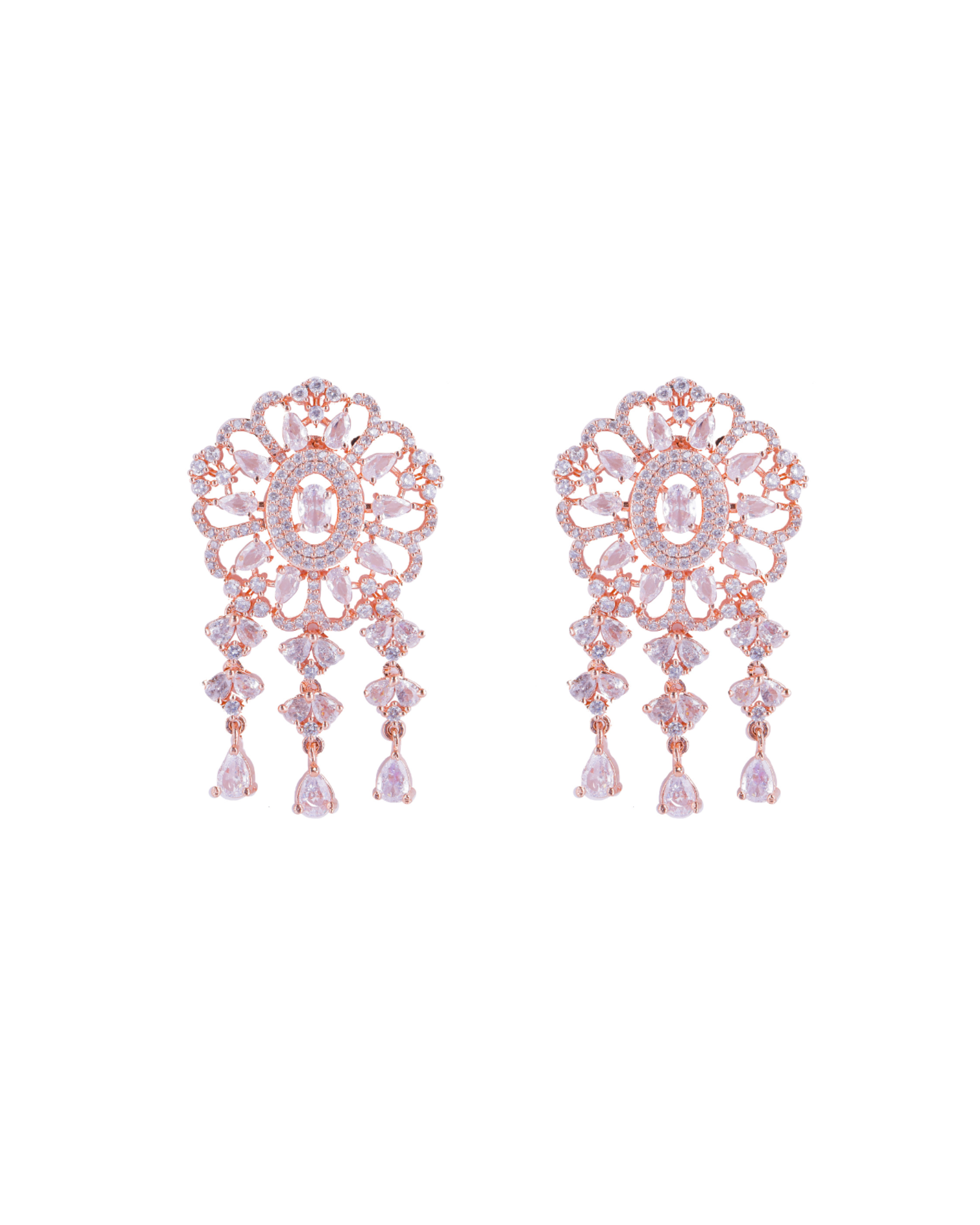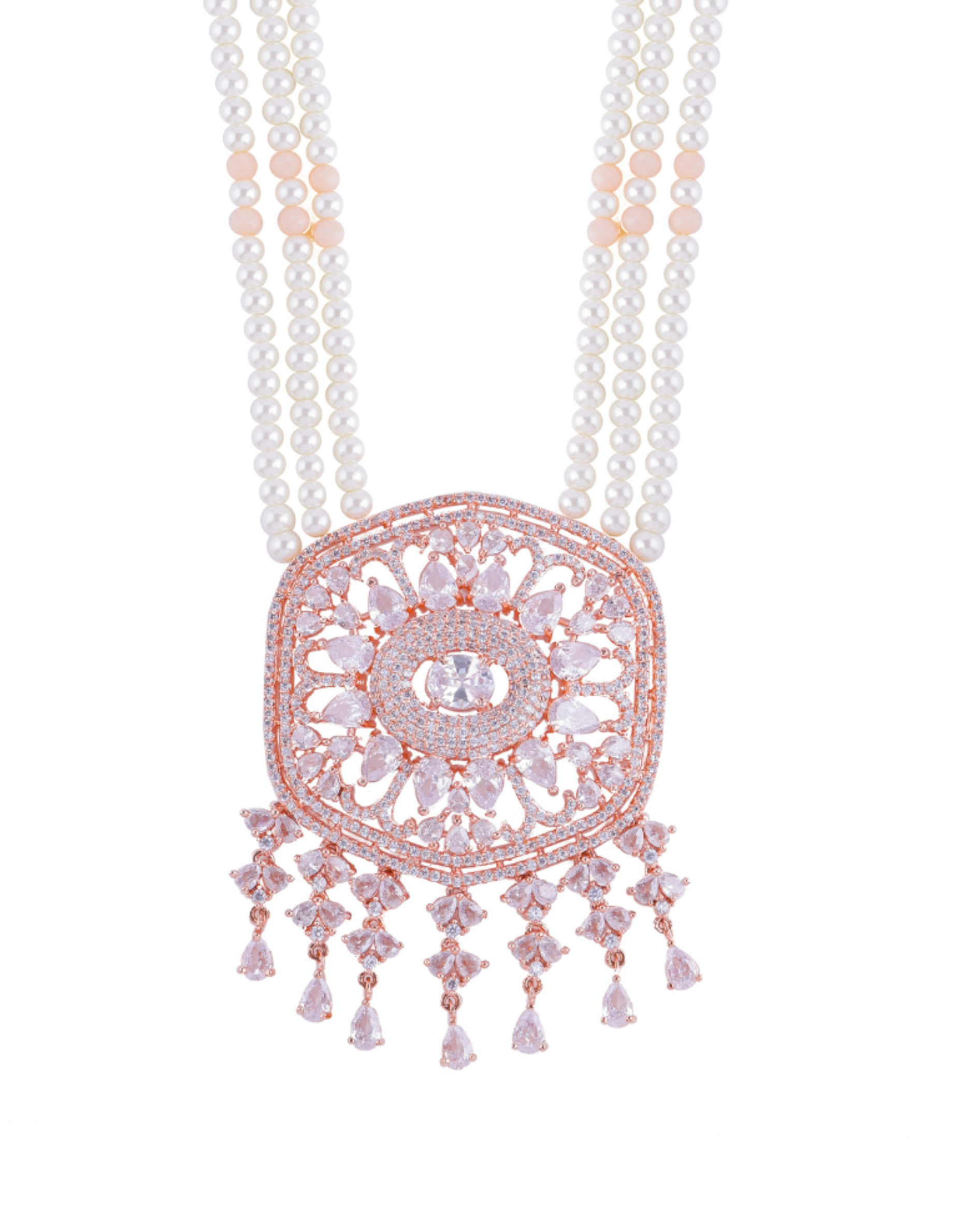 The necklace is the centerpiece of this ensemble, featuring a delicate arrangement of pearl beads chain that gracefully cascade along the neckline. Each pearl is carefully selected for its smooth surface, radiant luster, and consistent size, creating a harmonious and captivating look. The rose gold-plated finish adds a touch of warmth and luxury, enhancing the overall allure of the necklace.