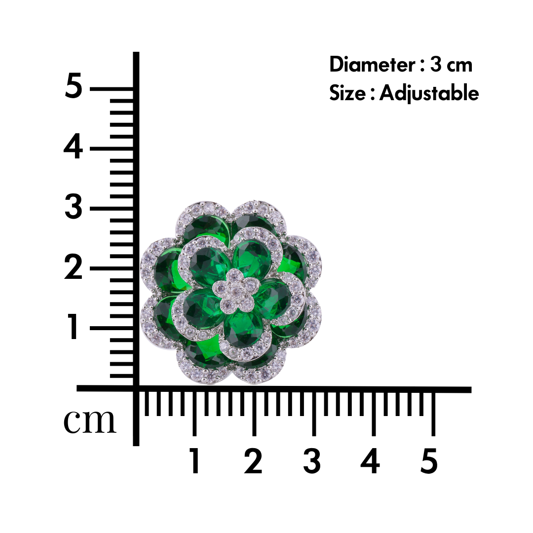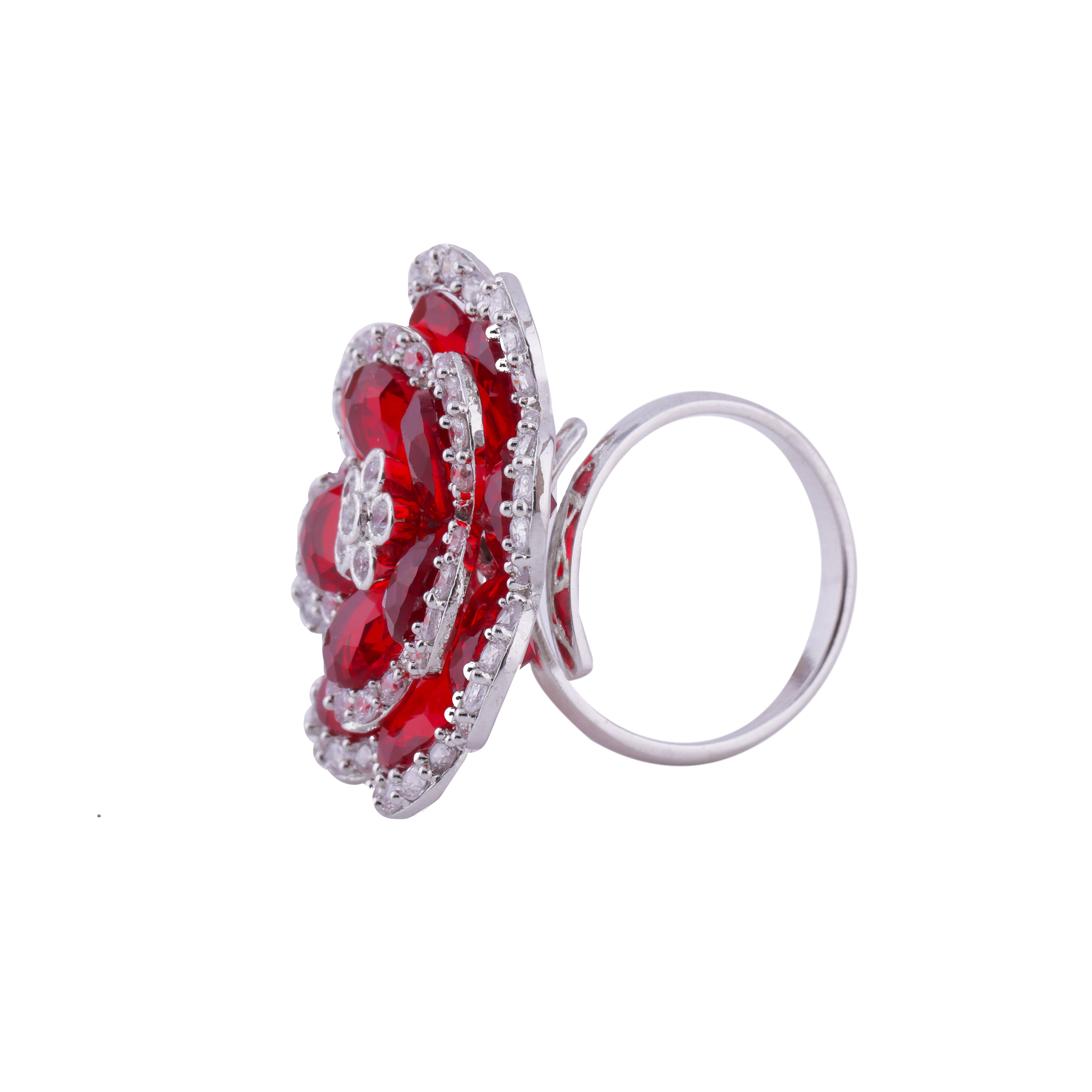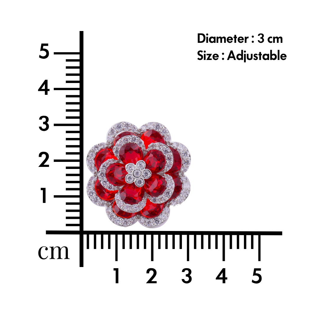 The intricate details of the rose petals are highlighted by the smooth and shiny stone surrounded by lustrous zirconia, creating a truly eye-catching effect. The ring is finished in a luxurious silver plating, adding a touch of sophistication and elegance to any outfit.