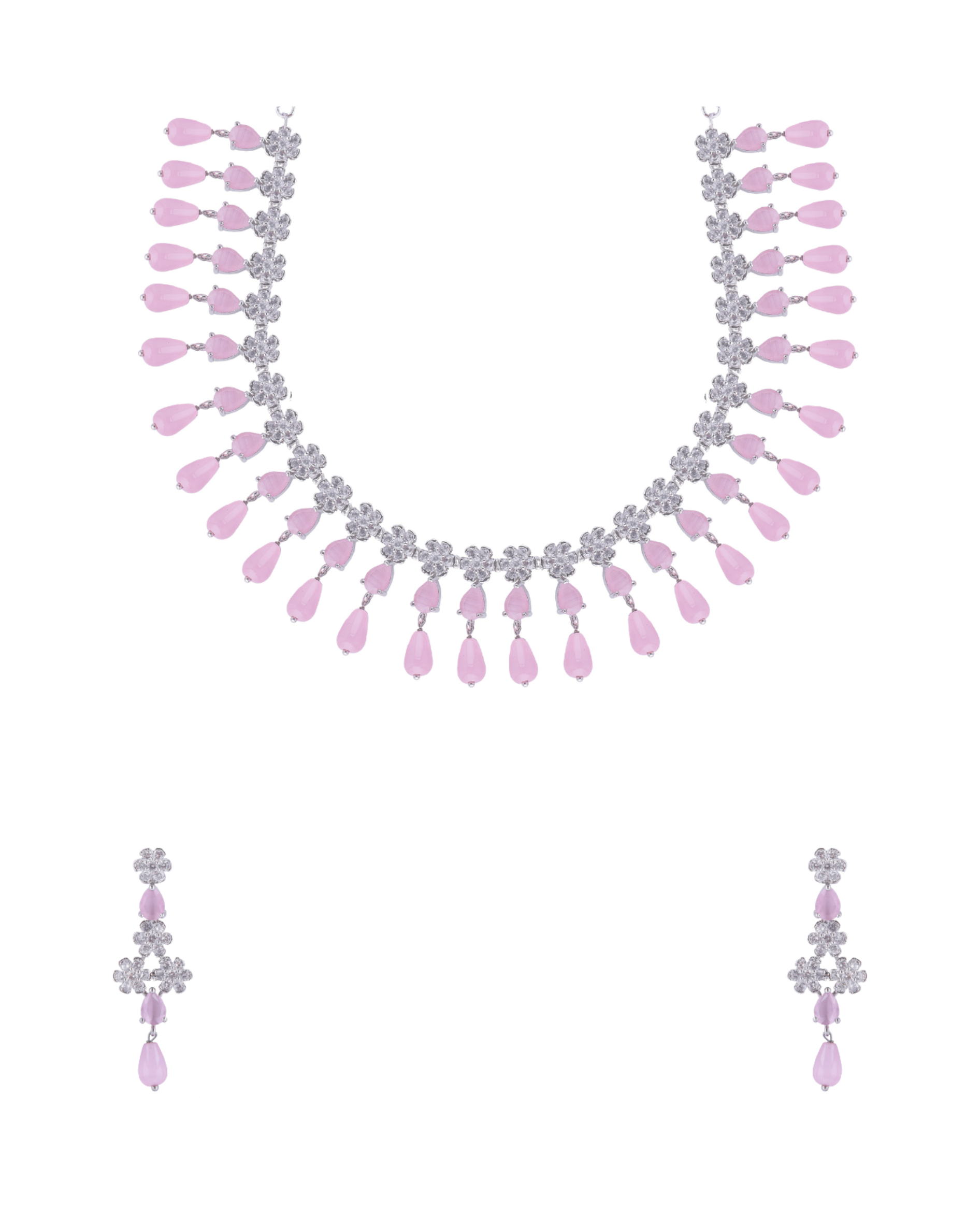At the heart of this necklace set is a stunning pink pearl pendant, delicately nestled in a silver-plated setting. The lustrous pearl radiates a soft and alluring glow, creating a mesmerizing focal point. Its subtle pink hue adds a touch of romanticism and sophistication to the design, making it a perfect choice for special occasions or adding a touch of glamour to your everyday look.