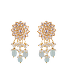 At the centre of attention is the mesmerising choker necklace, which beautifully adorns your neckline with its intricate design. The choker features an array of Kundan stones, renowned for their radiant beauty, arranged in a captivating pattern reminiscent of delicate flowers. These Kundan stones are meticulously set to ensure durability and long-lasting shine, adding a touch of opulence to your ensemble.
