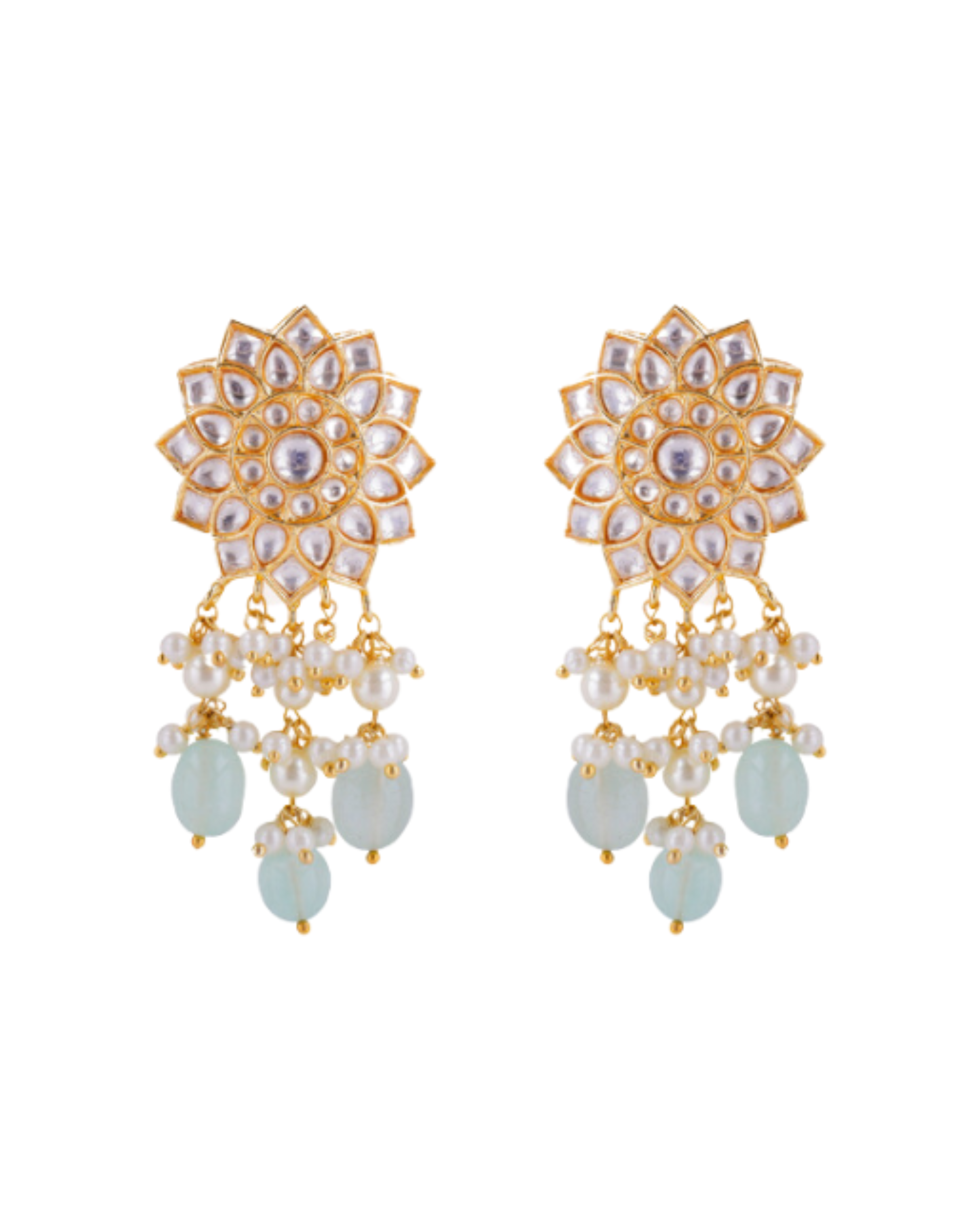 Completing the set are matching earrings that perfectly complement the choker necklace. The earrings mirror the design of the choker, featuring Kundan stones and pearls that sway delicately with your every movement. They frame your face with elegance and grace, accentuating your natural beauty and adding a touch of regal sophistication.