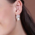 Crafted from high-quality silver, these earrings feature a dazzling cubic zirconia gemstone, surrounded by a delicate halo of smaller cubic zirconia stones. The highlight of the design is the lustrous freshwater pearl that dangles gently from the bottom, adding an extra touch of sophistication to the overall look.